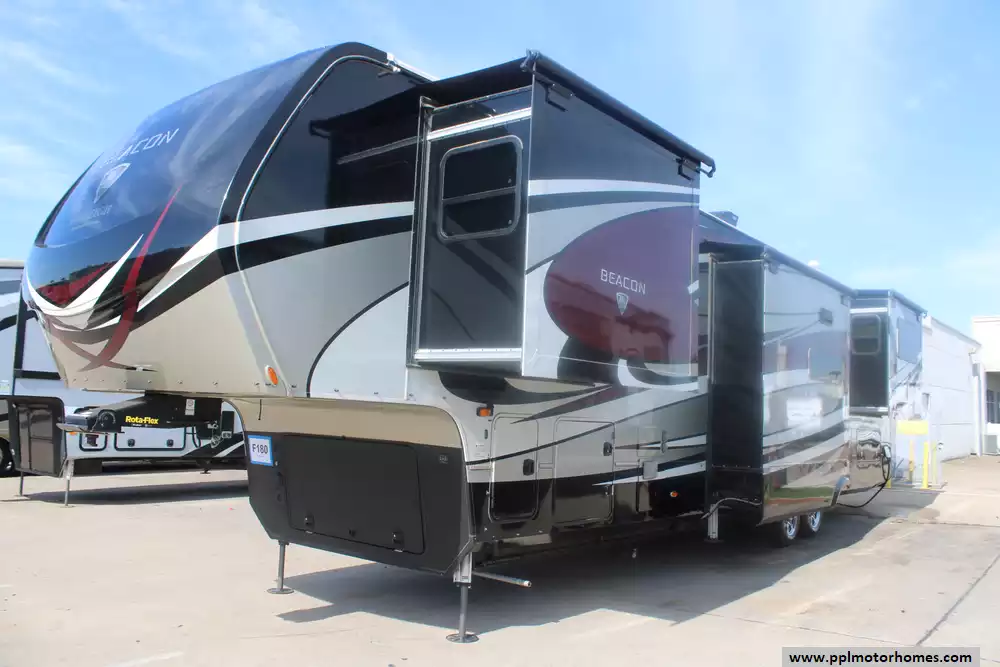 Travel In Luxury, Style, And Comfort In This 2020 Beacon 42RDB! Some Highlights Include.... Full Body Paint, A 6-Point One-Touch Hydraulic Leveling System, 5 Slide-Outs, Onan 5,500-Watt Propane Generator, Side-Mounted Solar Prep, Lippert "Solid Step" Entry Steps, 3 Ducted Air Conditioners, Maxxair Vent Cover, Frameless Tinted Windows, XL Entry Assist Handle, Rear MORryde Pull-Out Storage Tray, 110v Residential Whirlpool Refrigerator, In-Fridge Ice Maker, Wine Fridge, Automatic Main Awning And Window/Slide Awnings, Stacked Washer/Dryer, Heated Tanks, Rear And Side Cameras, Outside Speakers, 2 TVs (Including TV Lift), DVD Player, Home Theater Surround Sound, Electric Reclining Theater Seats With USB, Outside Shower, Fireplace, Central Vacuum System, Electric Power Cord Reel, Pop-Up Countertop Outlet, Convection Microwave, Kitchen Island, 3 Burner Range, Oven, And More! This Particular Model Has Had One Living Area Sofa Removed For A Desk Area. Perfect For Any Adventure! Ask About PPL's Financing Options!