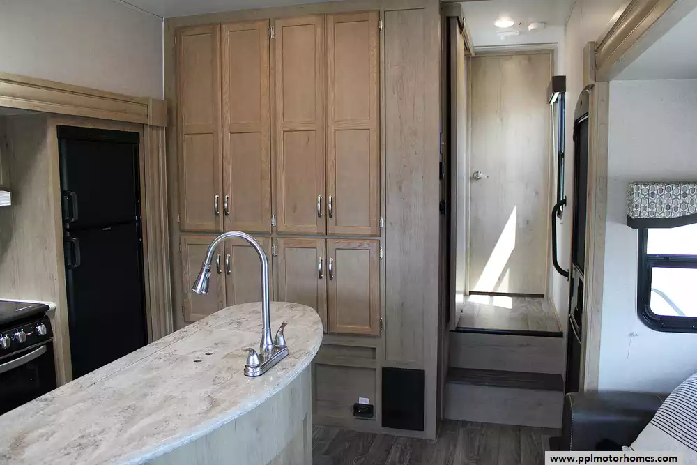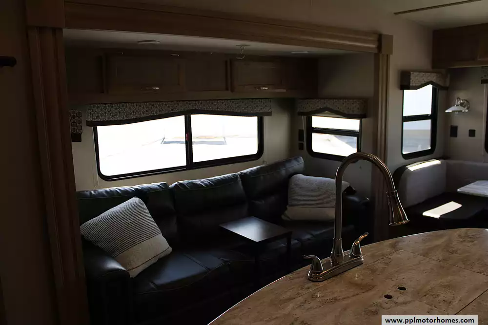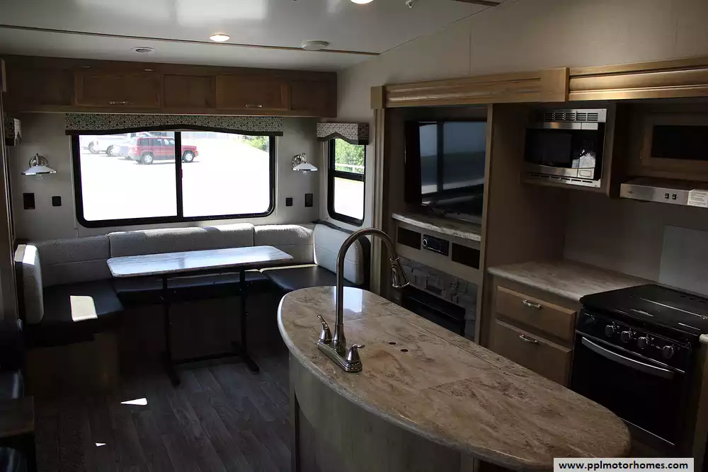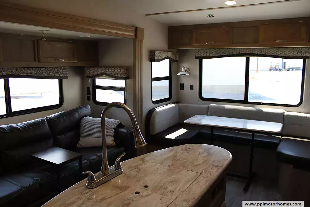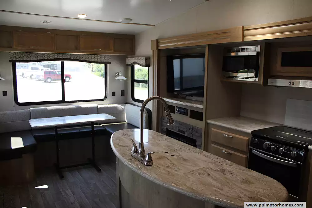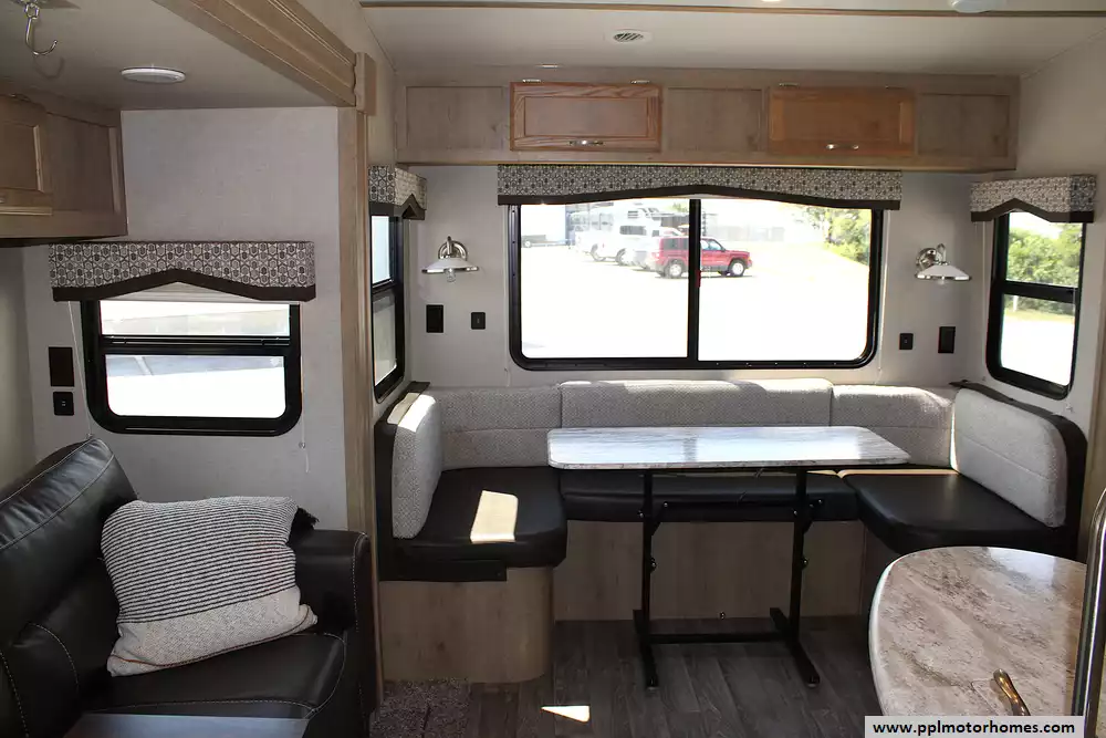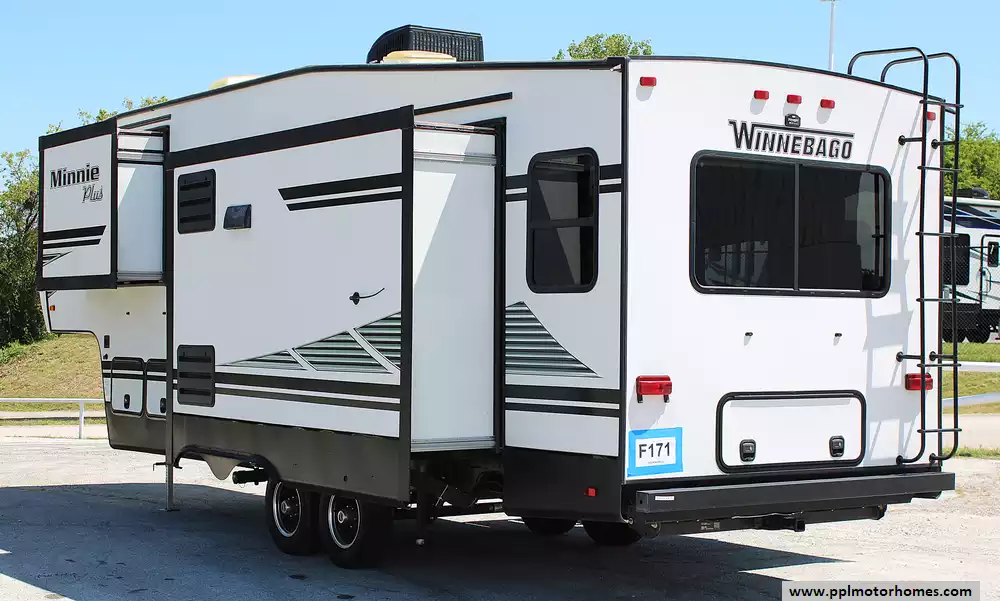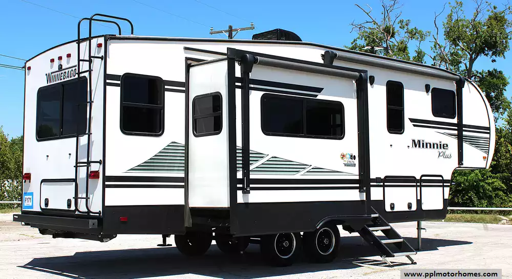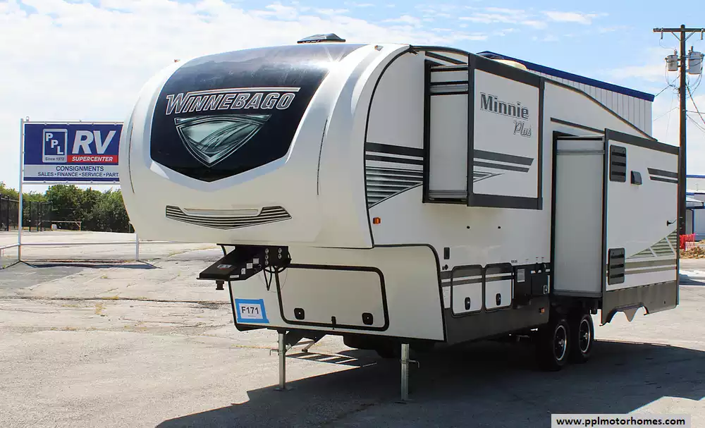 2020 Winnebago - Minnie Plus 27RLTS, a beautifully built triple-slide fifth wheel designed for extended adventures or weekend getaways. With sleeping space for up to 6 people, including a front queen bed, a convertible U-shaped dinette, and a tri-fold sofa in the spacious rear living area, it's the perfect setup for couples or small families. The open floorplan features a center kitchen island, large pantry, and ample overhead storage, creating a true residential feel in a sub-30-foot frame.