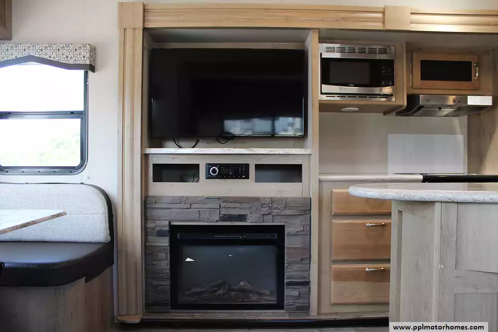 Built with Winnebago's high standards, this RV comes prepped with a 4-season package, including heated and enclosed holding tanks--ideal for year-round use in varying climates. Recent upgrades include a brand-new electric fireplace to add both warmth and ambiance, along with a brand-new In-Command touchscreen system, giving you full control over slides, lighting, and tank monitoring right at your fingertips. The triple slide-outs enhance your living space dramatically, especially in the rear lounge where the large windows and plush seating offer panoramic views and total relaxation.