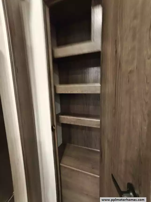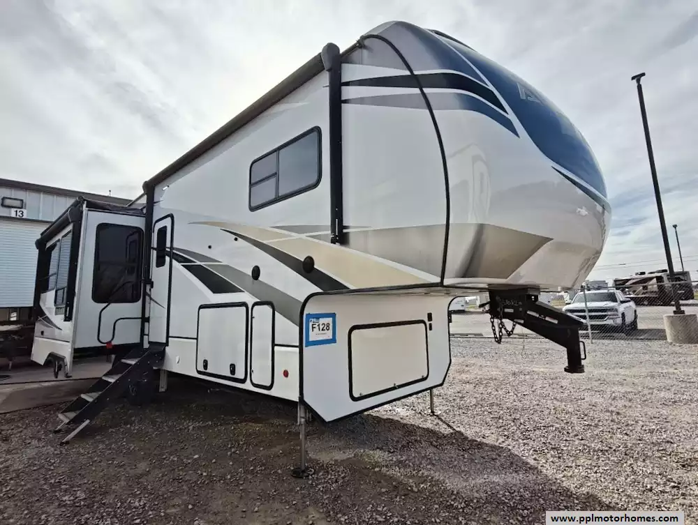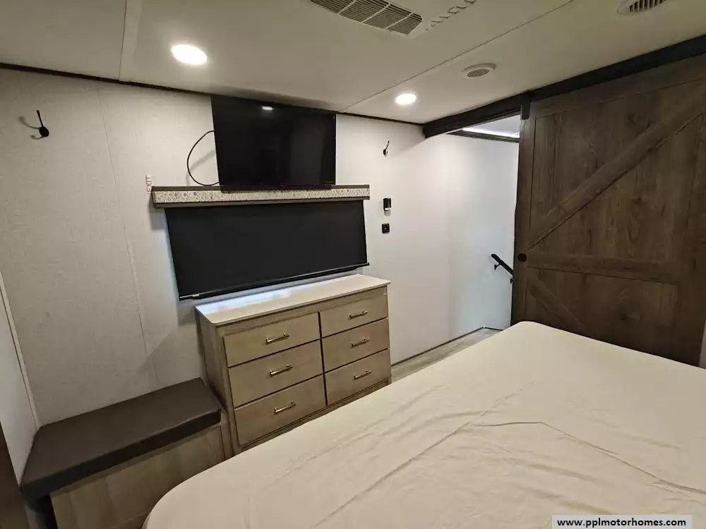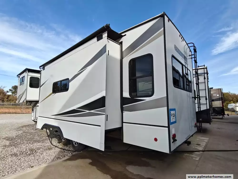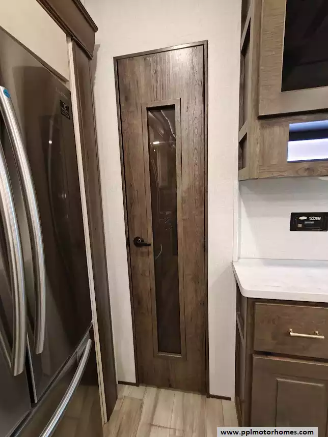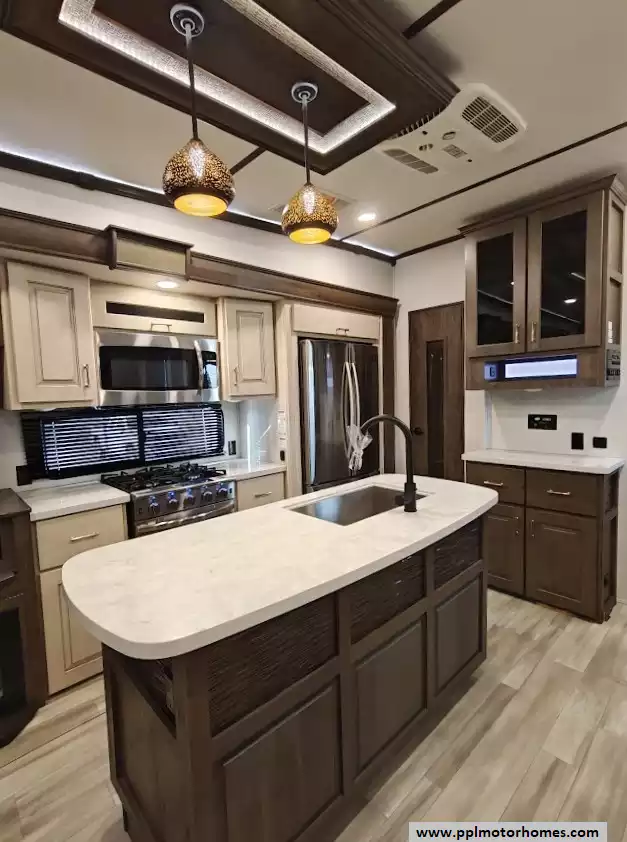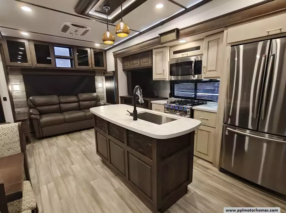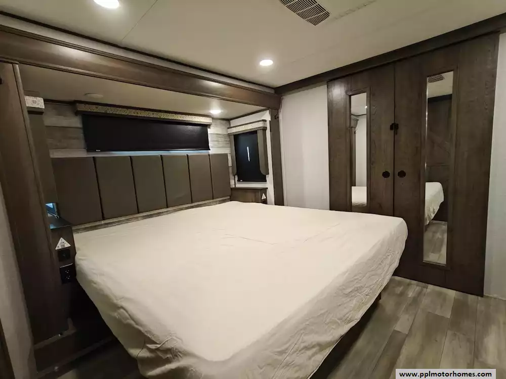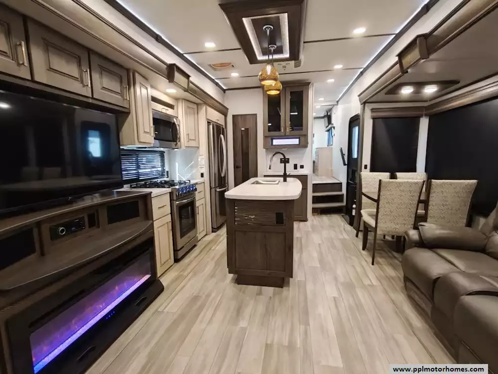 The 2021 Alliance RV Paradigm 310RL is a luxury rear-living fifth wheel known for its customer-driven design, high-quality build, and full-time living capabilities. It features an open floor plan with a large kitchen island, a king-size bed, and no carpet throughout the main living areas. The kitchen is equipped with high-quality solid surface countertops, stainless steel appliances including a 4 burner range, large oven, 3 door Samsung refriderator and a microwave. The kitchen offers extensive storage, including soft-close cabinets with magnetic catches and soft-close drawers throughout. A notable feature is the large hidden pantry and a "shoe garage" for storage under the steps leading to the upper level. The living area includes a dual recliner love seat (theater seating) and a tri-fold hide-a-bed sofa that can be converted into a sleeping area for guests. The love seat features power recline and cup holders. An electric fireplace adds a cozy ambiance and also functions as a 5,000 BTU space heater. There is hidden storage located behind the fireplace. The bedroom in the 2021 Alliance RV Paradigm 310RL serves as a comfortable and well-appointed master suite, featuring a king-size bed and a dedicated area that doubles as a seating space and a walk-in closet. The bathroom has two access points and features a large, residential-style shower with a seat for added comfort and convenience. Dedicated linen storage and hardwood cabinets and drawers provide ample space for toiletries and towels.