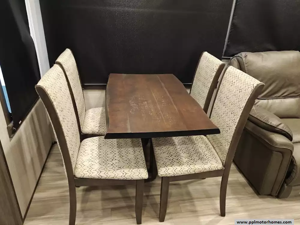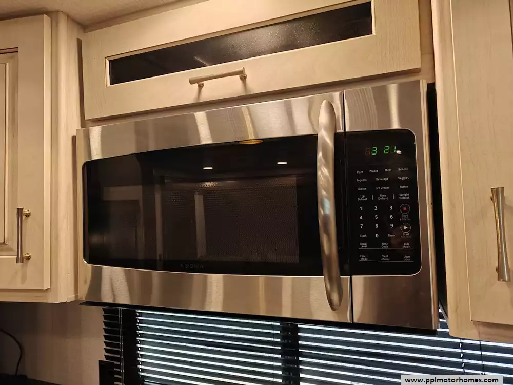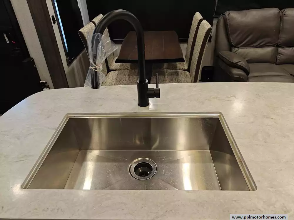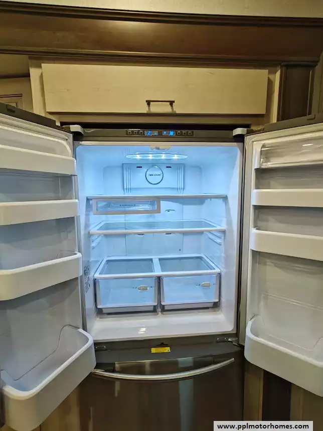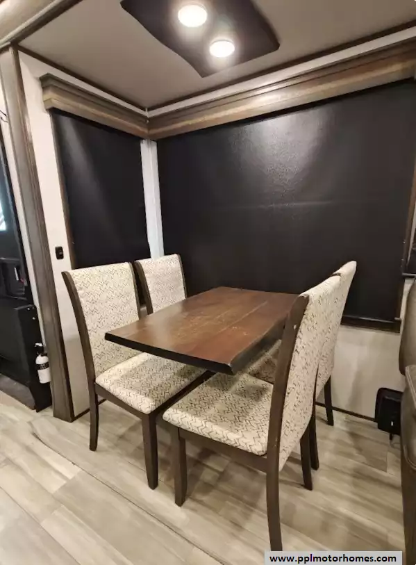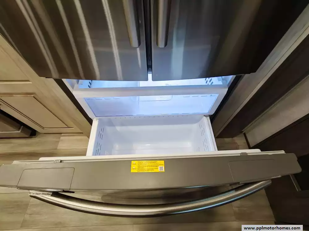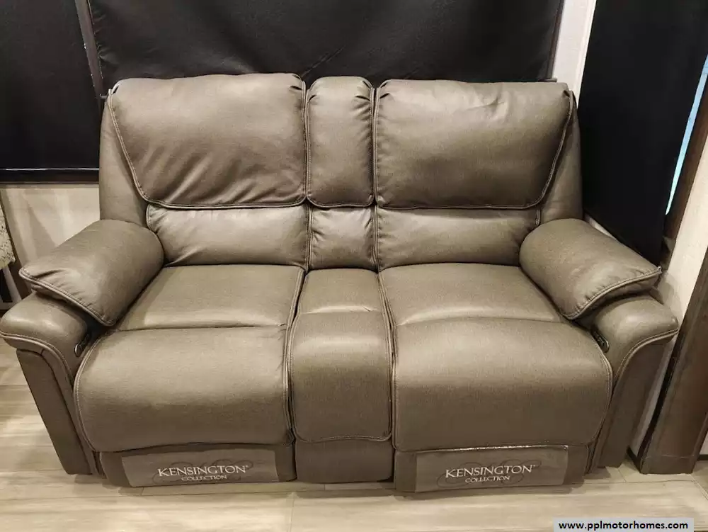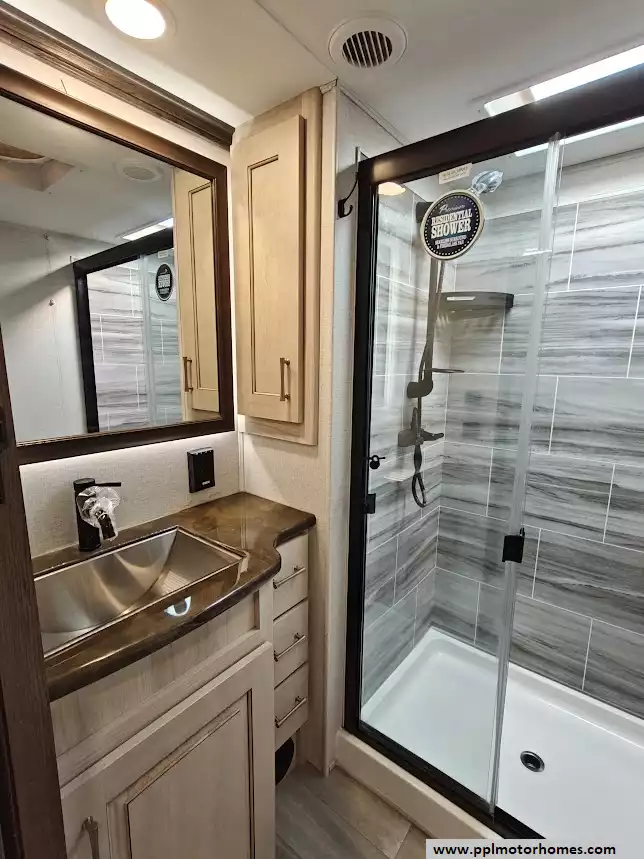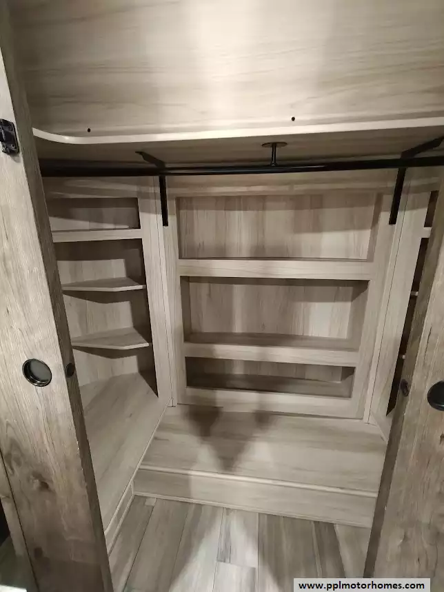 The 2021 Alliance RV Paradigm 310RL is a luxury rear-living fifth wheel known for its customer-driven design, high-quality build, and full-time living capabilities. It features an open floor plan with a large kitchen island, a king-size bed, and no carpet throughout the main living areas. The kitchen is equipped with high-quality solid surface countertops, stainless steel appliances including a 4 burner range, large oven, 3 door Samsung refriderator and a microwave. The kitchen offers extensive storage, including soft-close cabinets with magnetic catches and soft-close drawers throughout. A notable feature is the large hidden pantry and a "shoe garage" for storage under the steps leading to the upper level. The living area includes a dual recliner love seat (theater seating) and a tri-fold hide-a-bed sofa that can be converted into a sleeping area for guests. The love seat features power recline and cup holders. An electric fireplace adds a cozy ambiance and also functions as a 5,000 BTU space heater. There is hidden storage located behind the fireplace. The bedroom in the 2021 Alliance RV Paradigm 310RL serves as a comfortable and well-appointed master suite, featuring a king-size bed and a dedicated area that doubles as a seating space and a walk-in closet. The bathroom has two access points and features a large, residential-style shower with a seat for added comfort and convenience. Dedicated linen storage and hardwood cabinets and drawers provide ample space for toiletries and towels.