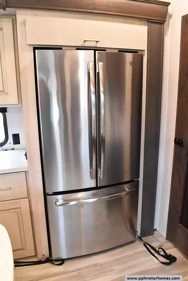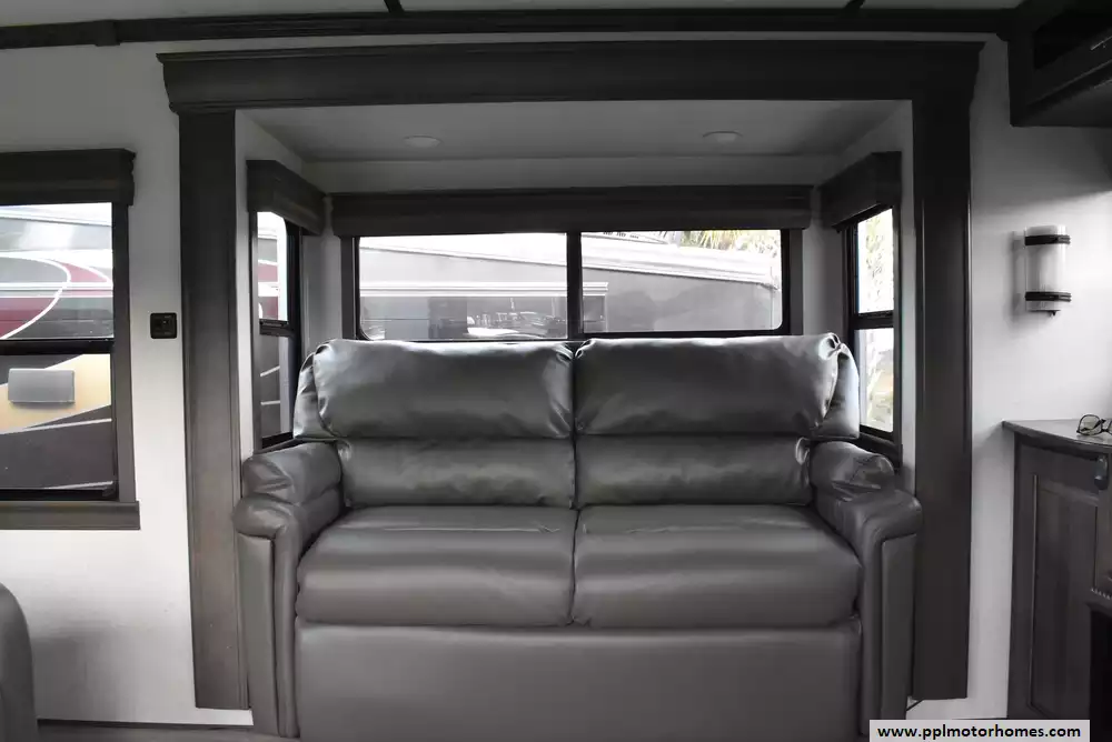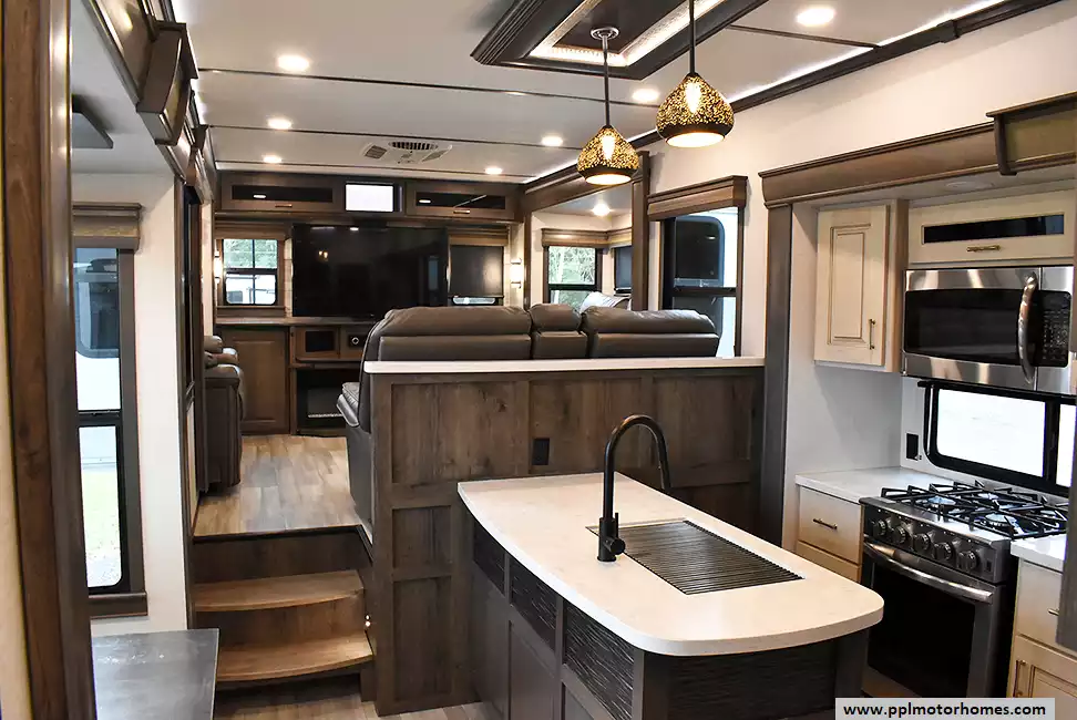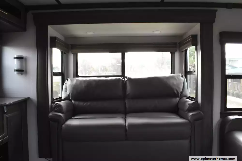 This 2021 Paradigm 365RD has a Hydraulic Landing Gear, 5 Slide-outs, 3 Ducted Air Conditioners, Residential Ge Refrigerator, In-Fridge Ice Maker, Automatic Main Awning, Washer/Dryer Connections, Satellite Receiver, Outside Speakers, 2 TVs, DVD Player, Outside Shower, Fireplace, Microwave, 4 Burner Range, Oven