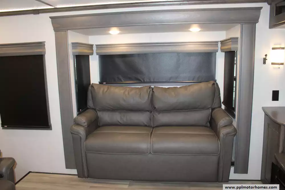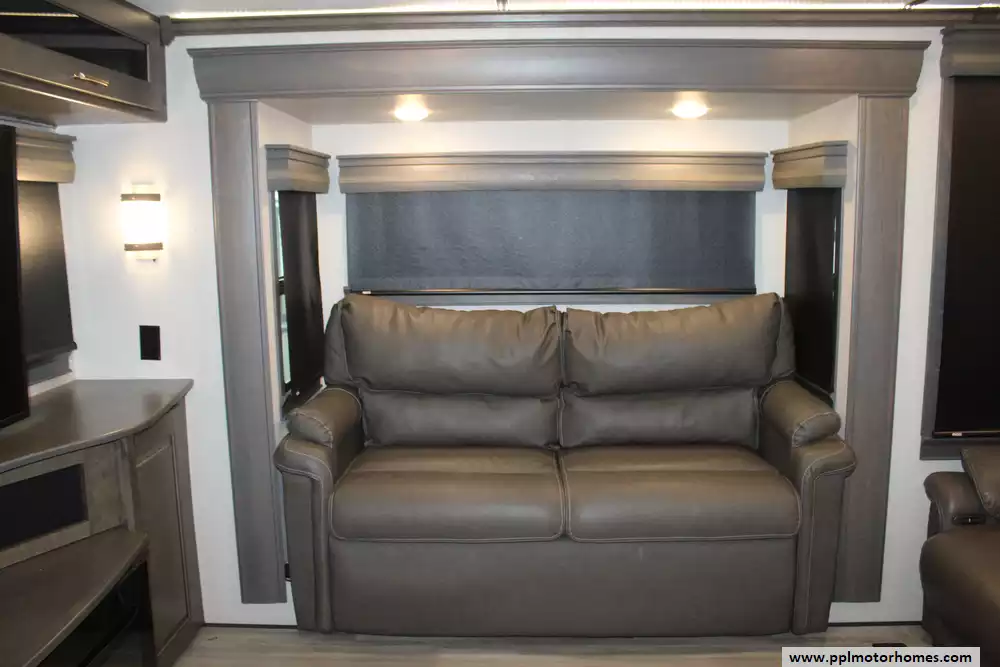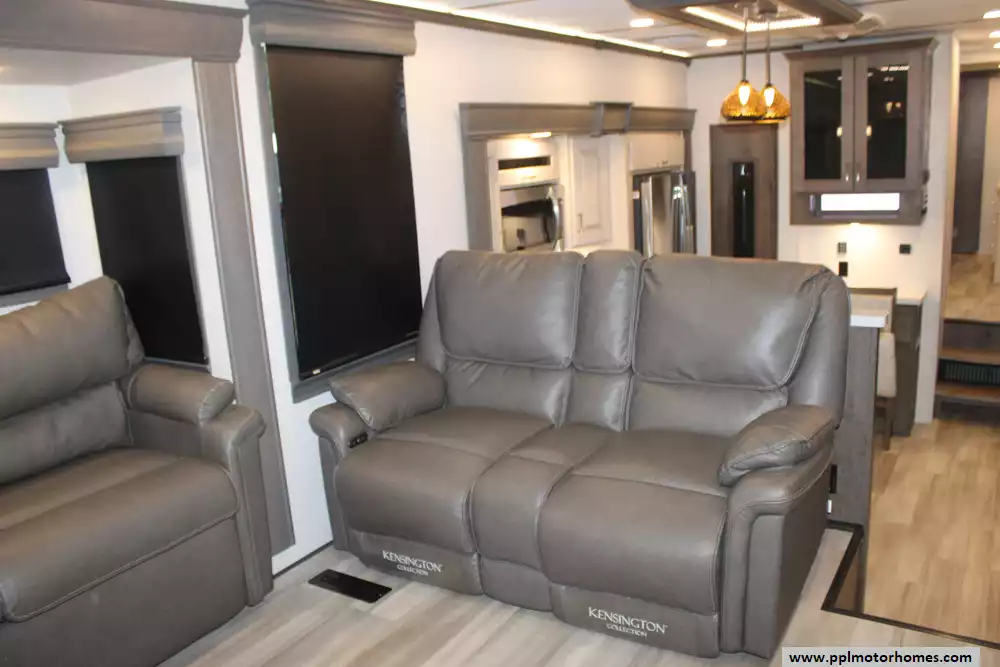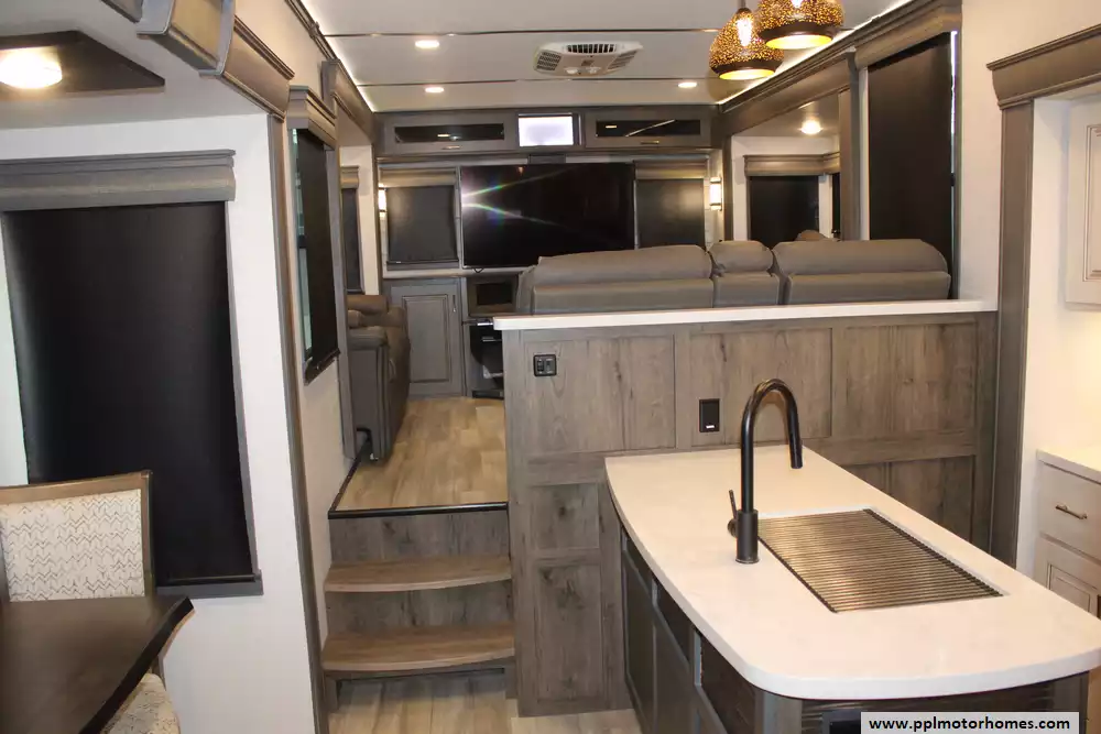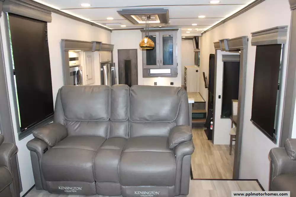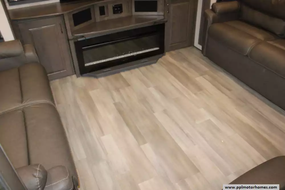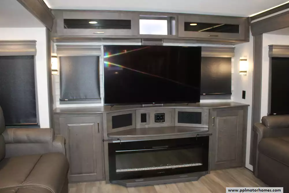 Experience the pinnacle of luxury with this 2021 Paradigm 365RD, a 39-foot fifth wheel designed for those who refuse to compromise on comfort. Renowned for its customer-driven design and spacious rear-den layout, this model features five slide-outs that transform the interior into a true residential retreat. The separate living area is perfect for entertaining, anchored by an inviting fireplace and a comprehensive entertainment setup that includes three TVs and an outside entertainment system for movie nights under the stars. Whether you are relaxing in the climate-controlled interior or enjoying the shade of the automatic main awning, this fiberglass-bodied coach offers an upscale atmosphere that feels like a high-end home on wheels.