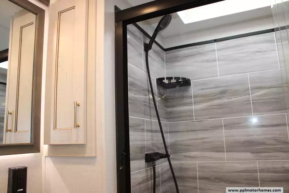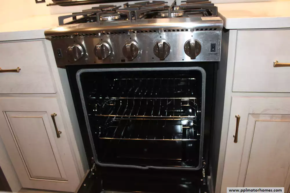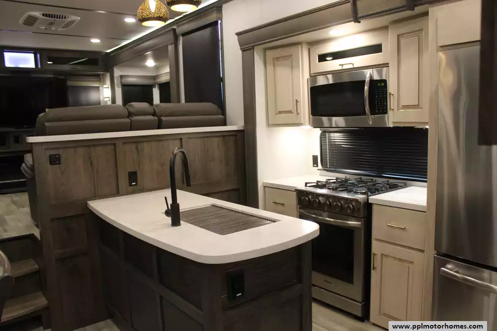 The residential-inspired kitchen is a chef's dream, equipped with a four-burner range, a large oven, a microwave, and a premium residential GE refrigerator with an in-fridge ice maker. Climate control is effortless thanks to a powerful triple-unit system consisting of two non-ducted and one ducted air conditioner, ensuring your comfort in any season. Designed with the long-term traveler in mind, this unit includes washer/dryer connections for added convenience, an outside shower for easy clean-ups, and a durable rubber roof. This Paradigm 365RD combines professional-grade construction with sophisticated amenities, making it the ultimate choice for full-time living or luxury travel.