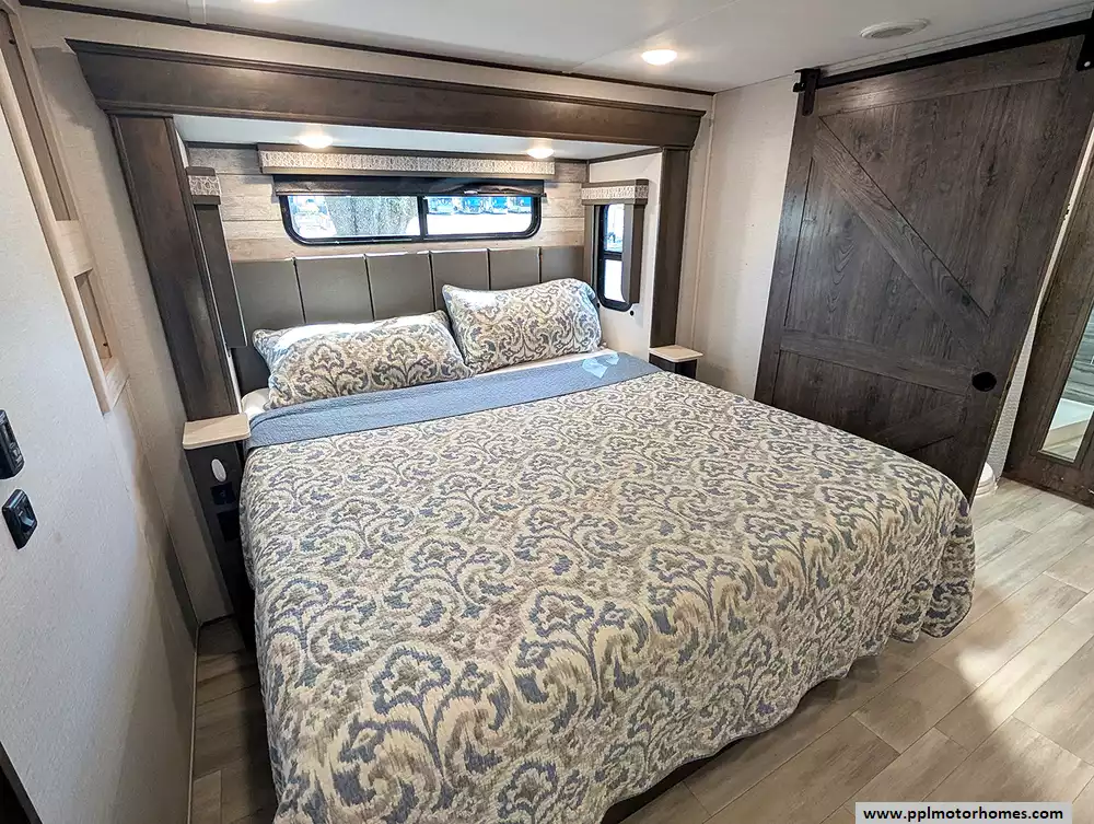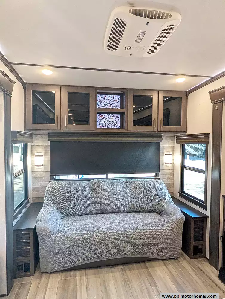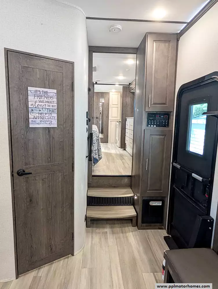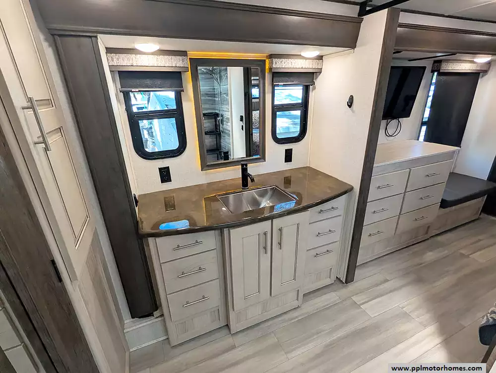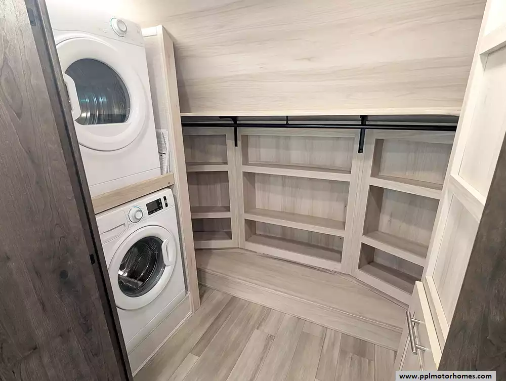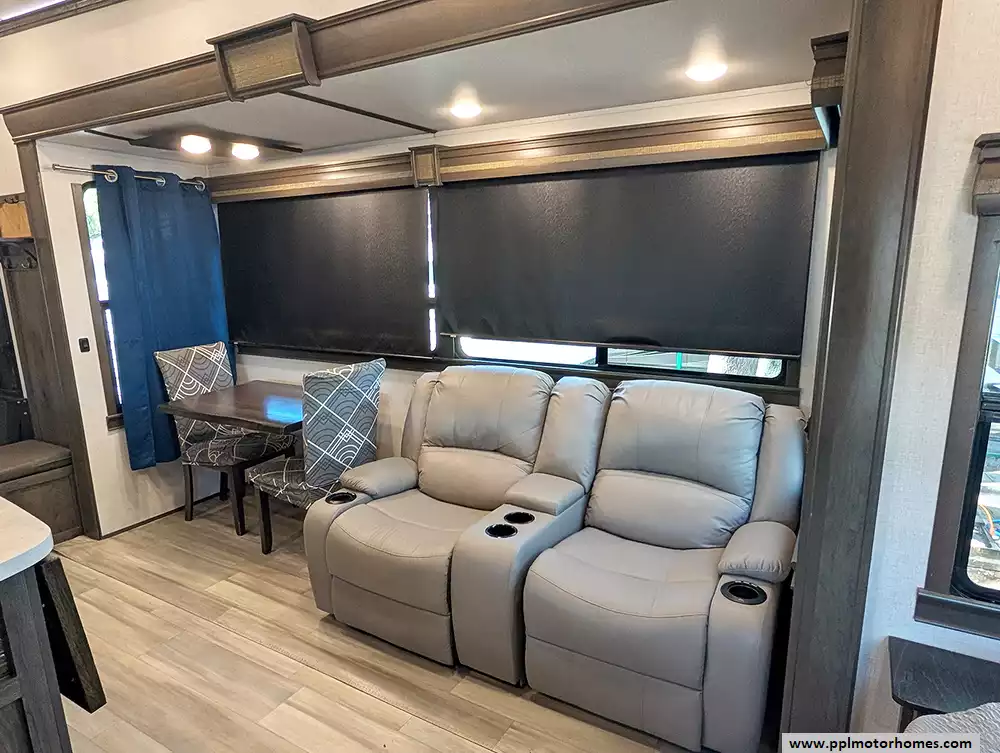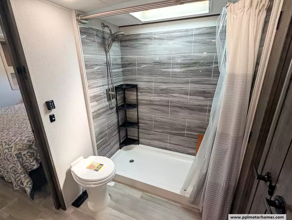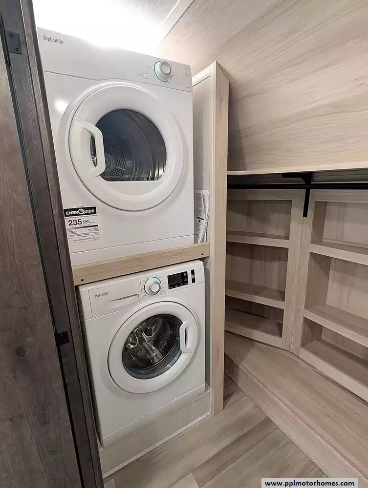 This unit is packed with high-end amenities designed for effortless convenience and four-season capability. The exterior boasts hydraulic landing gear for a rock-solid setup, while the automatic main and slide awnings provide instant shade for your outdoor retreat, complete with outside speakers and a shower. Inside, you will find a dedicated laundry area with an included washer and dryer, ensuring long-term stays are as easy as possible. Entertainment is covered by two TVs and a pre-installed satellite receiver, while the heated tanks offer peace of mind for year-round adventures. From its industry-leading front-bath layout to its thoughtful residential touches, the 370FB stands as a testament to quality and luxury in the fifth-wheel market.
