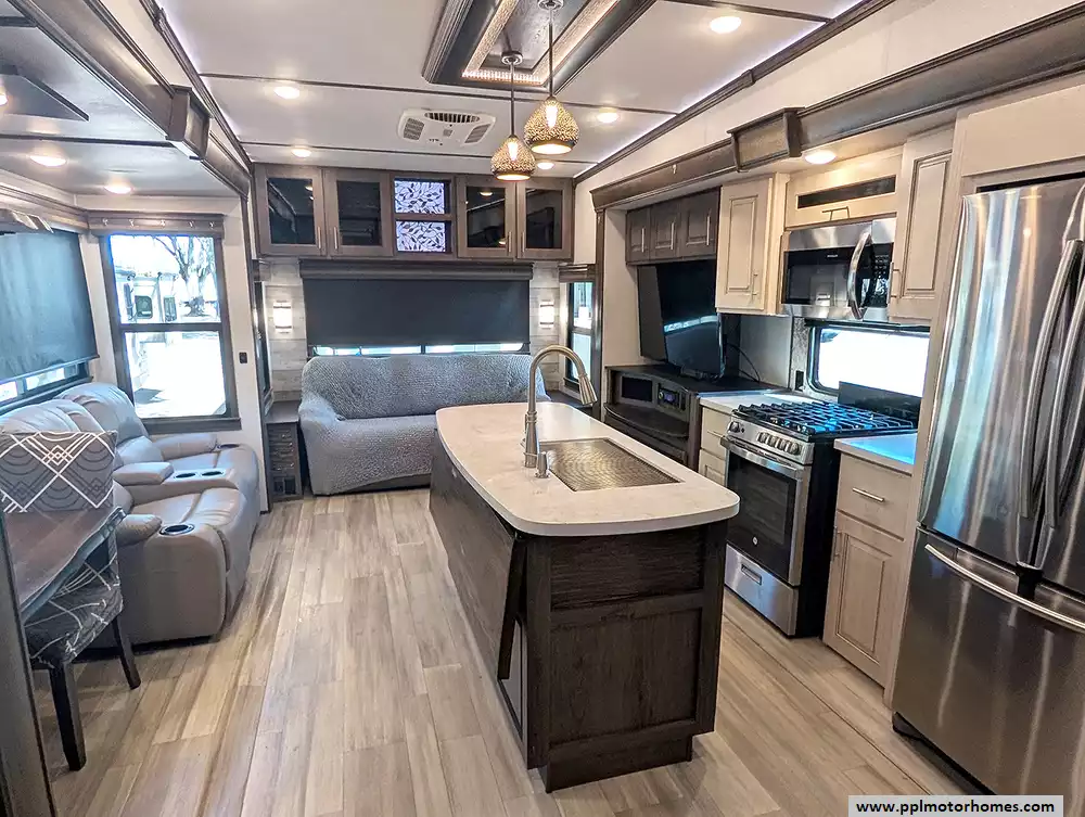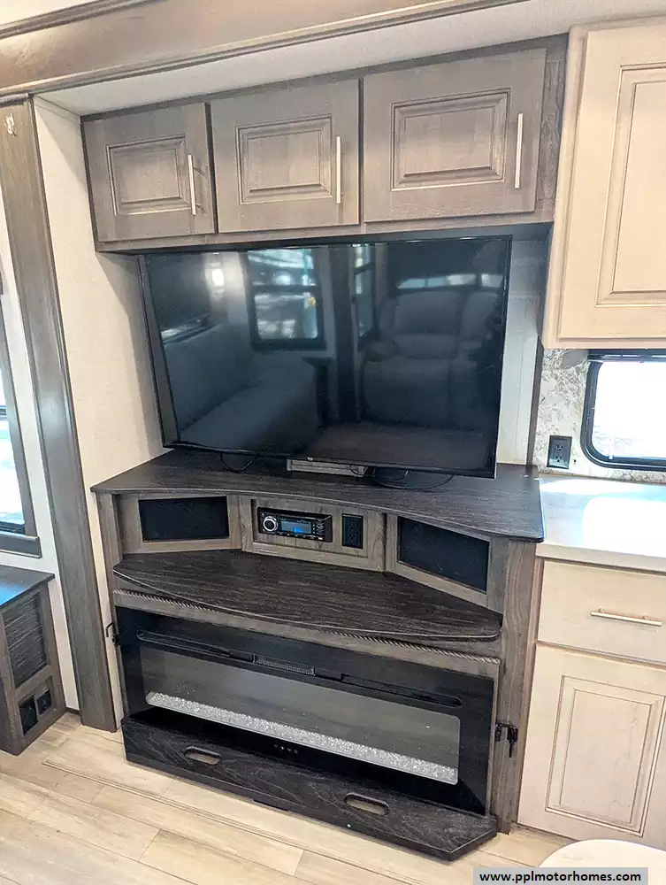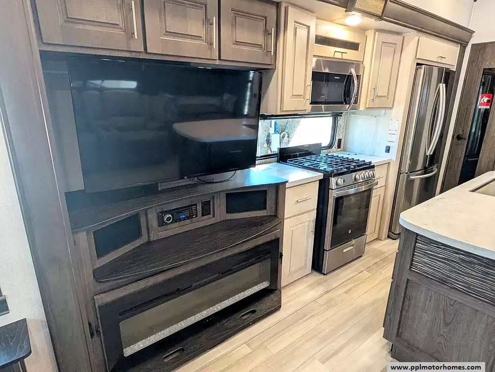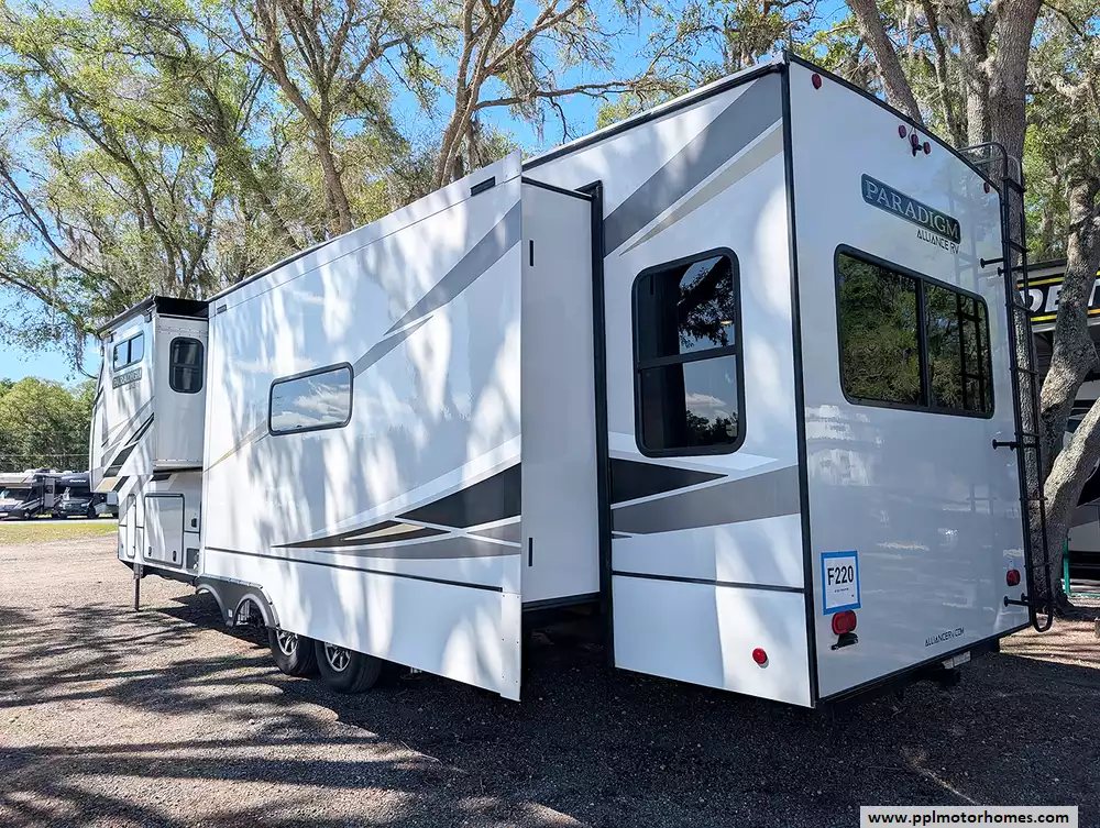 Experience the pinnacle of full-time luxury living with the 2021 Paradigm 370FB by Alliance RV. Renowned for its customer-driven design and 101-inch wide-body construction, this 40-foot fifth wheel offers an unparalleled sense of space and residential comfort. Built with a durable fiberglass body and a rubber roof, it features four expansive slide-outs that open up a sophisticated interior highlighted by a cozy fireplace and premium finishes. The heart of the home is a chef-inspired kitchen equipped with a four-burner range, oven, convection microwave, and a massive residential Samsung refrigerator with an in-fridge ice maker. Whether you are hosting guests in the spacious living area or enjoying the climate-controlled comfort provided by three ducted air conditioners, this Paradigm is engineered to provide a true home-away-from-home experience.