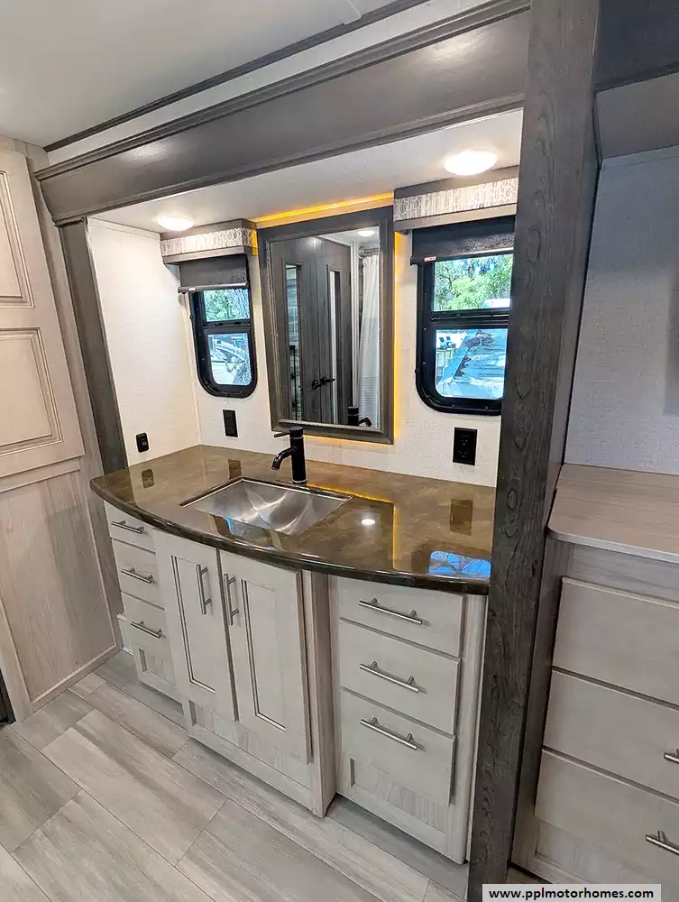 (Floor plan is NOT drawn to scale. Length of vehicle is approximate. Buyer is responsible for verifying actual length. PPL Motor Homes compiled this list of features, specifications, equipment and options as a guide. No representation or warranties, either express or implied, are made as to the accuracy of the information herein. Please verify for yourself all items listed before purchase.)