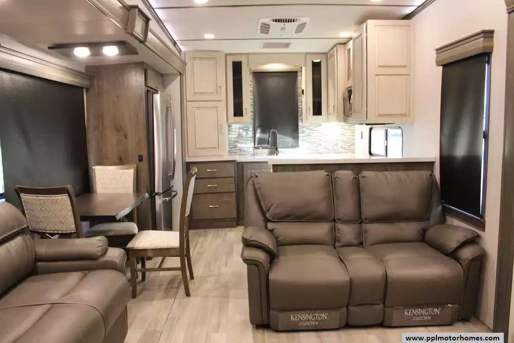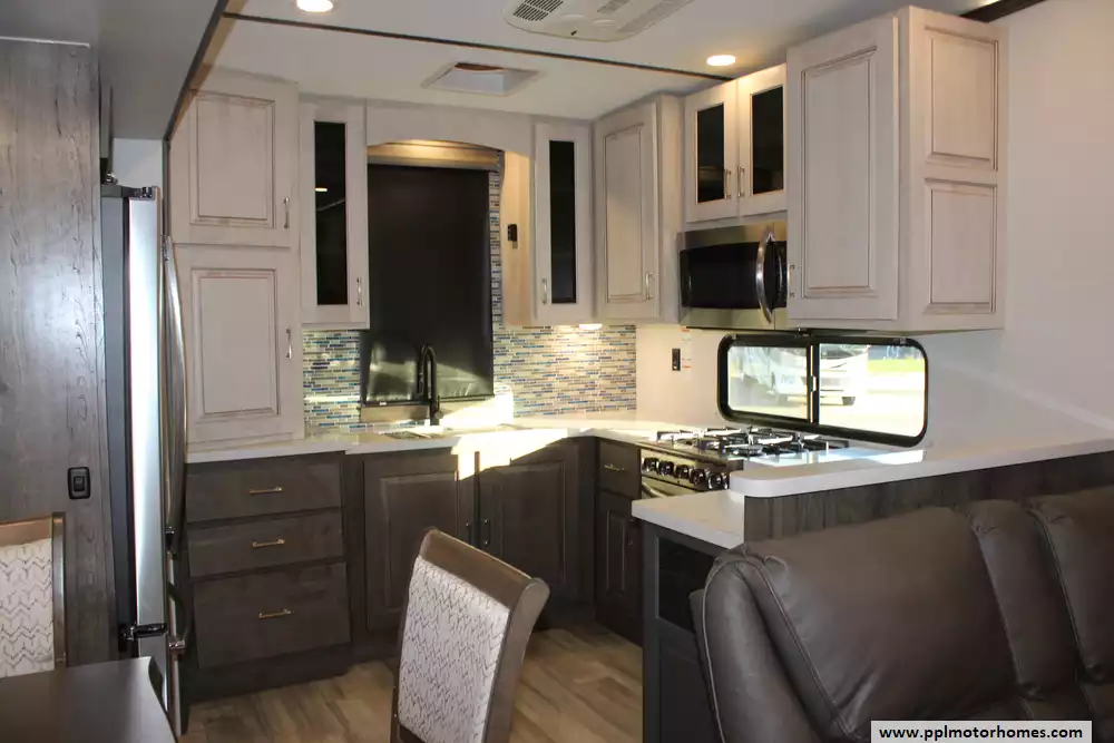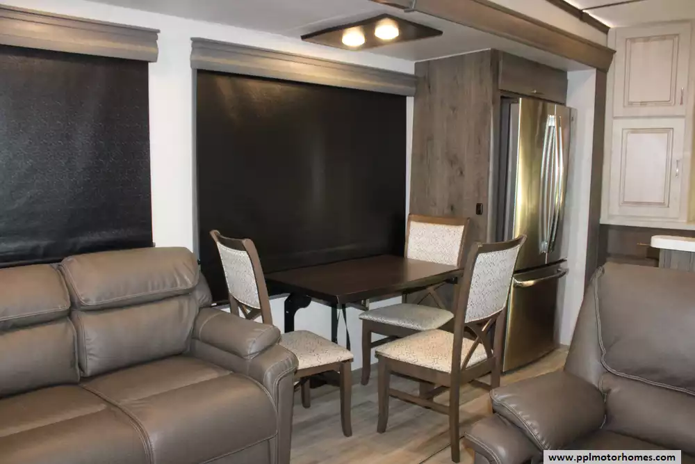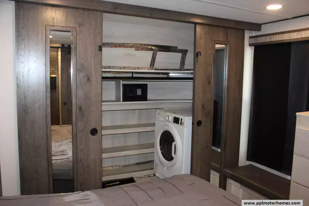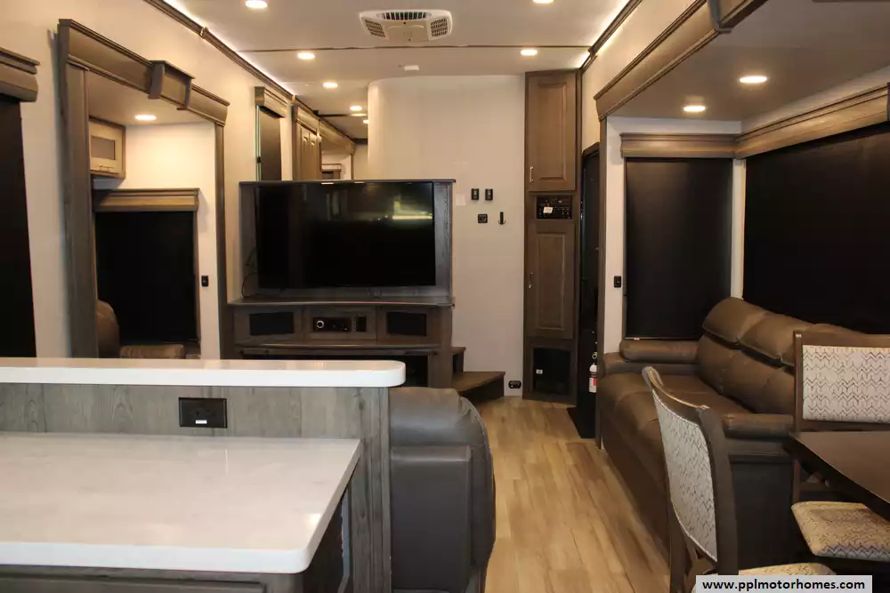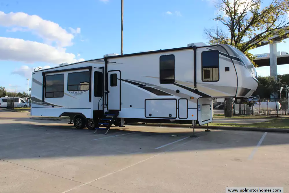 This 2021 Paradigm 372RK is a luxury, spacious premium fifth-wheel built for comfort, style, and longer stays. Amenities Include...3 Slide-outs, 2 Non-Ducted And 1 Ducted Air Conditioners, 110v Residential Ge Refrigerator, In-Fridge Ice Maker, Automatic Main Awning And Window Awning, Washer/Dryer, Outside Speakers, 2 TVs, Outside Shower, Microwave, and 3 Burner Range.