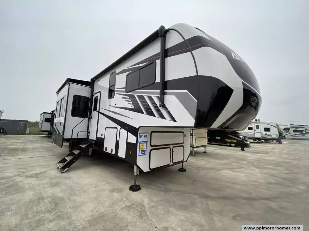 This 2021 Valor 36V11 has a Hydraulic Landing Gear, 3 Slide-outs, Onan Gas Generator, 3 Ducted Air Conditioners, 12v Everchill Refrigerator, Automatic Main Awning And Slide/Door Awnings, Washer/Dryer Connections, Solar Panel, Heated Tanks, Outside Speakers, 3 TVs, Outside Shower, Fireplace, Microwave, 4 Burner Range, Oven