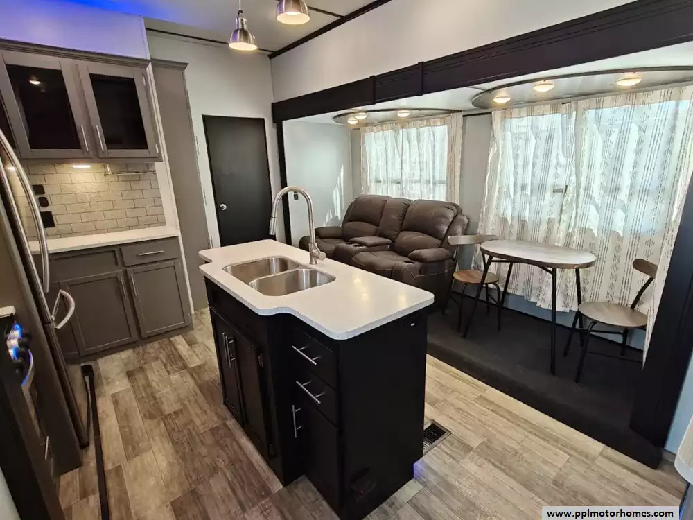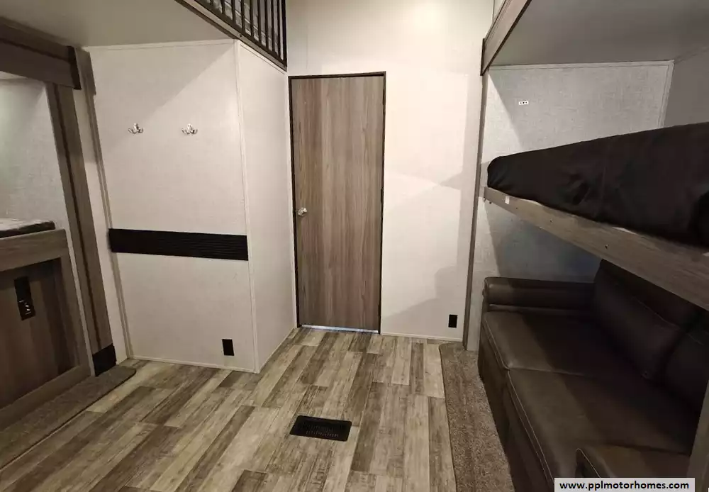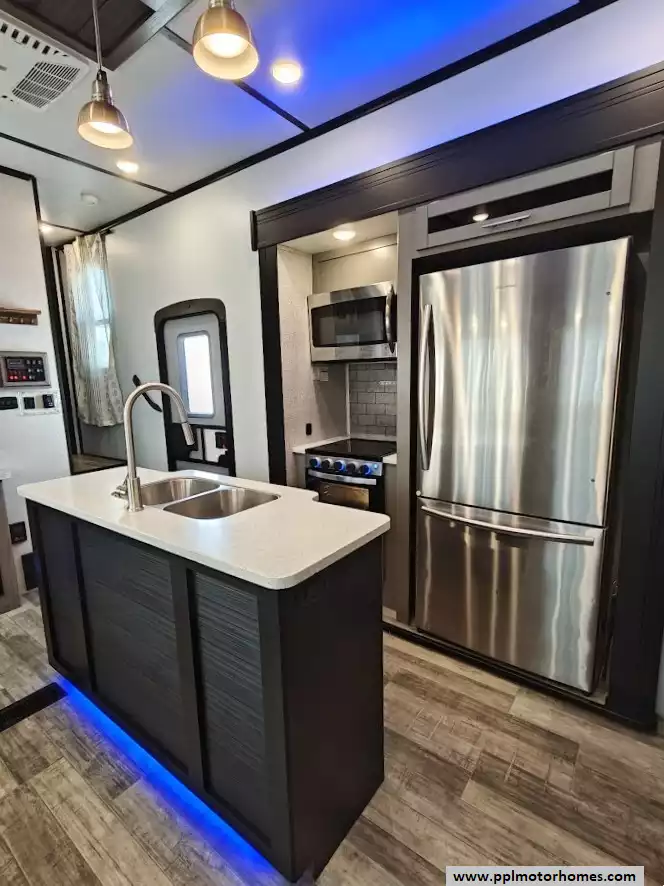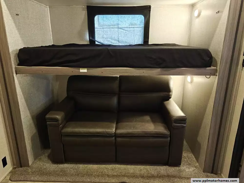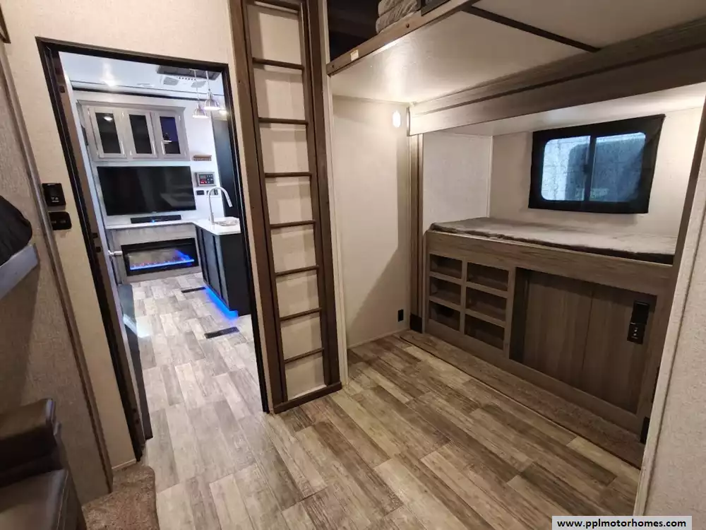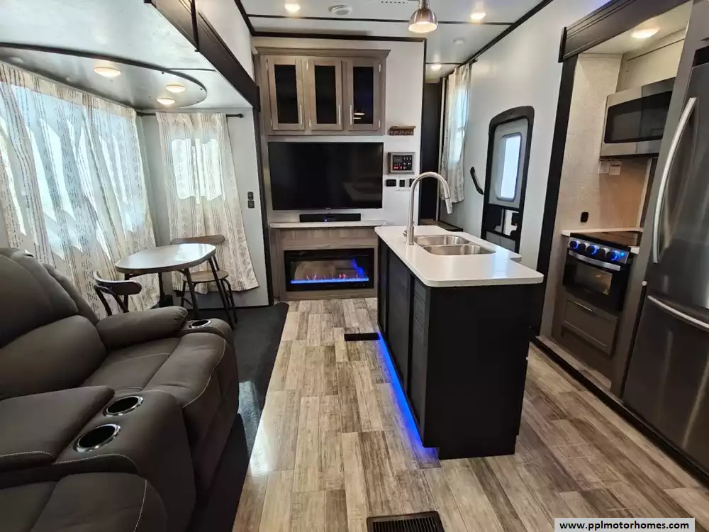 This 2021 Crossroads RV Volante 3601 LF is packed with convenient features and at-home luxuries. The main living area features a tri-fold sofa, a free-standing dinette table, TV with a AM/FM Bluetooth Sound Bar, plus a fireplace for a warm, cozy evening. The kitchen is equipped with a large island, an XL 50/50 stainless steel sink, solid-surface countertops, convection microwave, a 3 Burner Range Oven and a Double Door 12v Hisense Refrigerator. The bunkhouse includes a jackknife sofa with a flip-up bunk above, a trundle bed, plus a loft area with a bunk. There is also a full bath with its own exterior entrance door and a space to add an optional washer and dryer. The front master suite has a queen bed, TV, a chest and a large wardrobe. Other features include Electric Landing Gear, Fully Enclosed and Forced Air Heated Underbelly, 4 Slide-outs, 2 Ducted Air Conditioners, Automatic Main Awning, Outside Speakers, Outdoor Grill and Outside Shower.