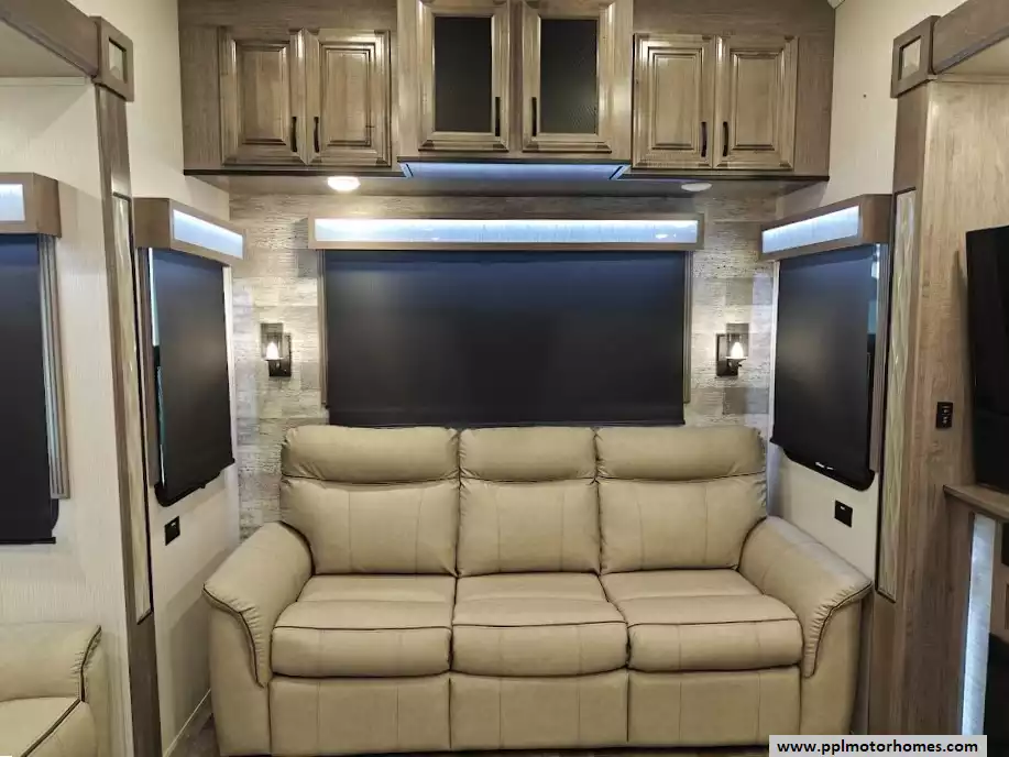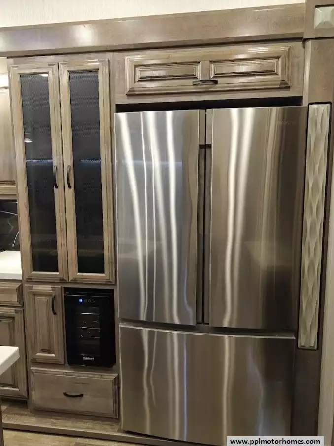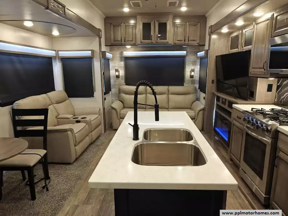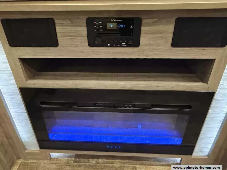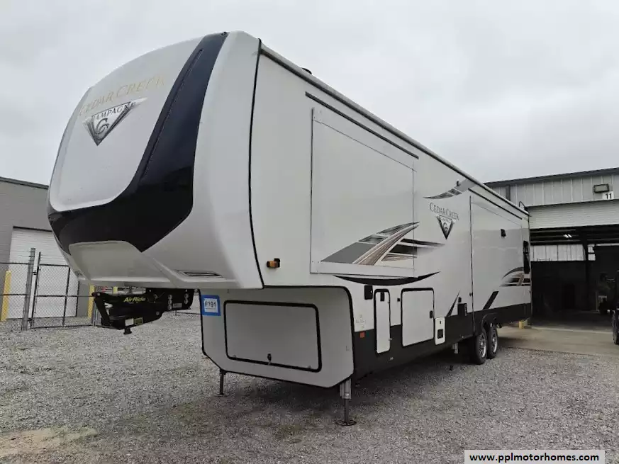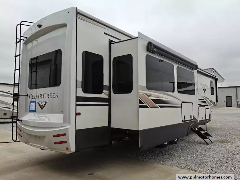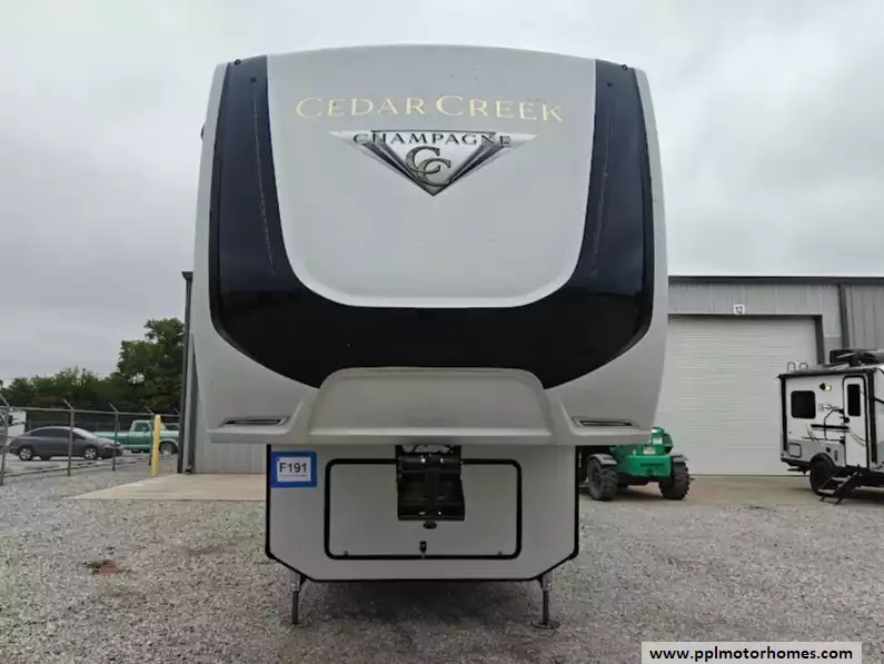 This 2021 Cedar Creek Champagne 38EL sleeps up to 4 people, has a Hydraulic Landing Gear, 3 Slide-outs, 2 Ducted Air Conditioners, Residential Insignia Refrigerator, Automatic Main Awning, Washer/Dryer Connections, Heated Tanks, Outside Speakers, 3 TVs, Outside Shower, Fireplace, Central Vacuum, Convection Microwave, 4 Burner Range, Oven and On Demand Water Heater