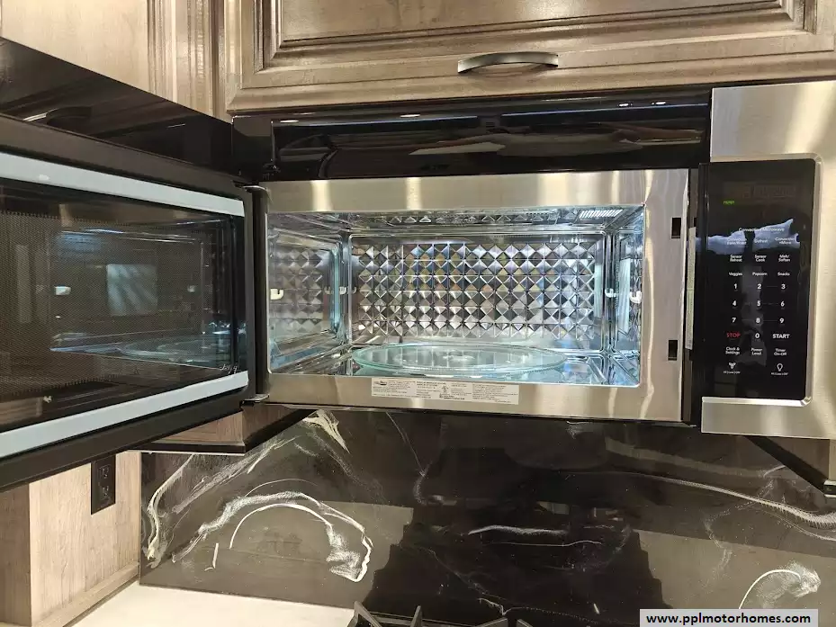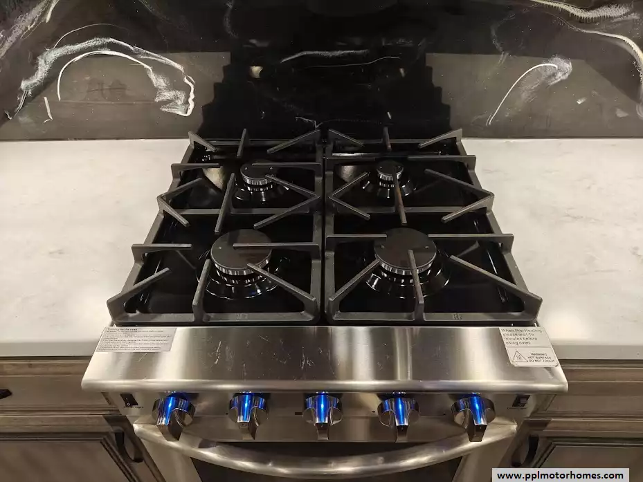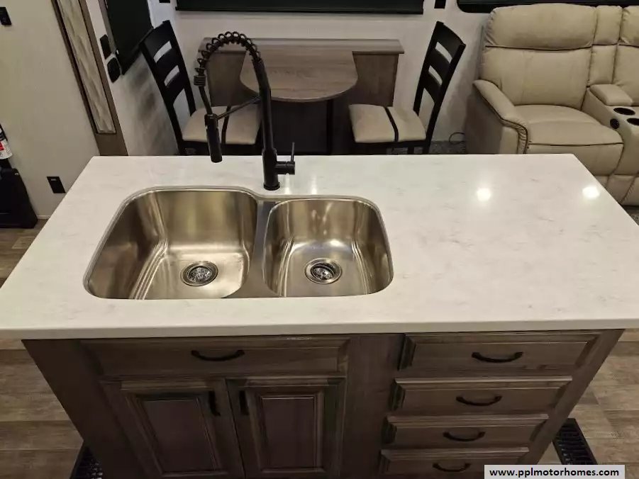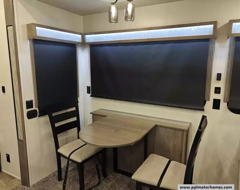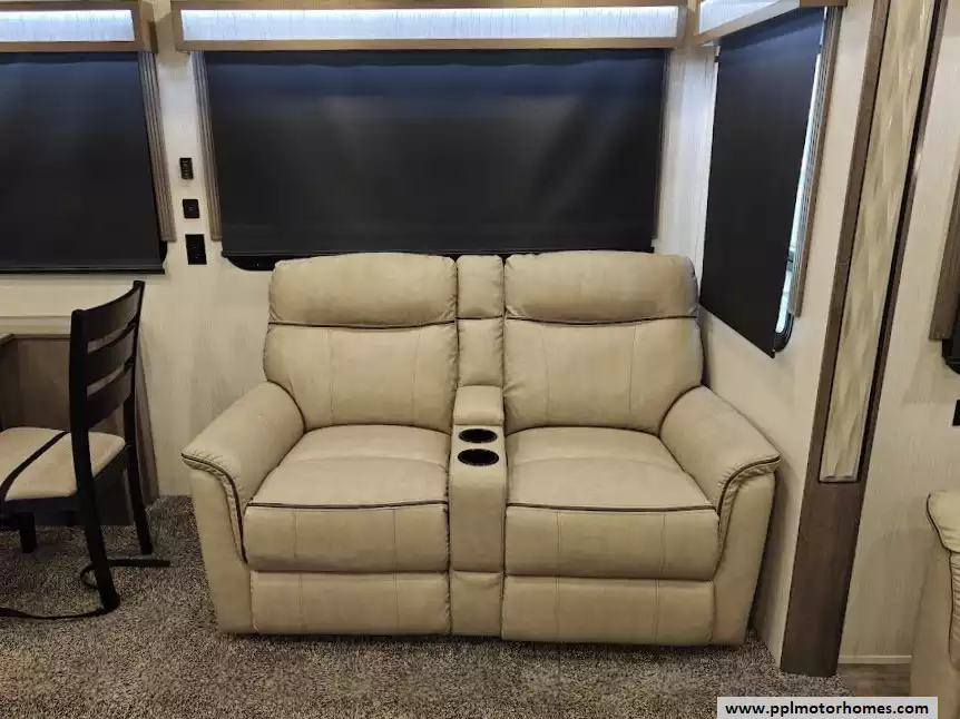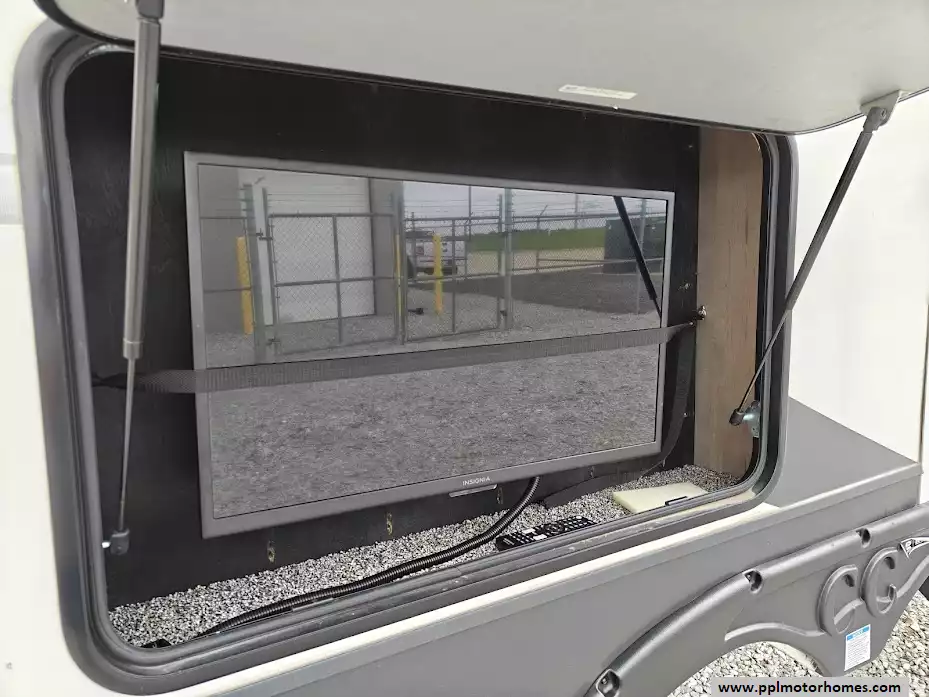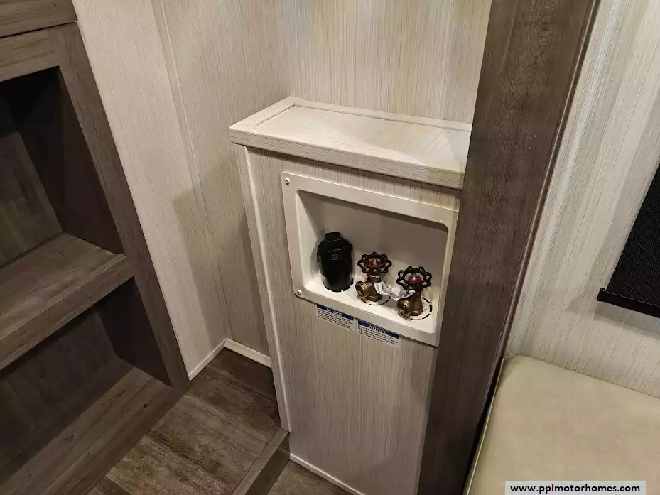 This 2021 Cedar Creek Champagne 38EL sleeps up to 4 people, has a Hydraulic Landing Gear, 3 Slide-outs, 2 Ducted Air Conditioners, Residential Insignia Refrigerator, Automatic Main Awning, Washer/Dryer Connections, Heated Tanks, Outside Speakers, 3 TVs, Outside Shower, Fireplace, Central Vacuum, Convection Microwave, 4 Burner Range, Oven and On Demand Water Heater