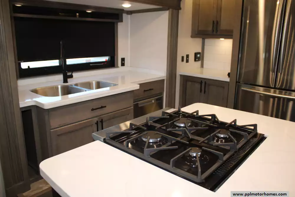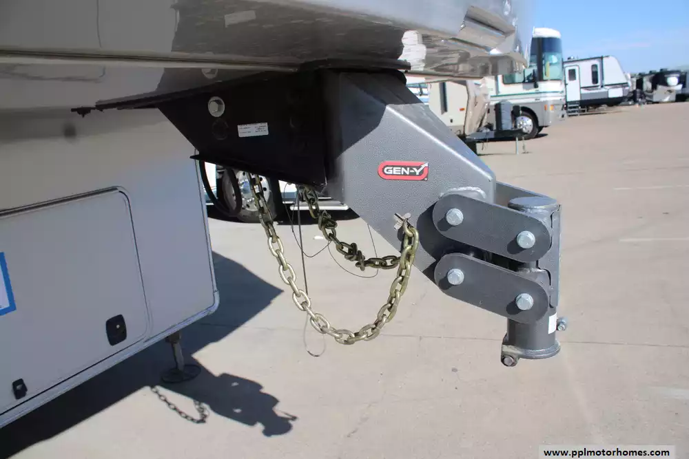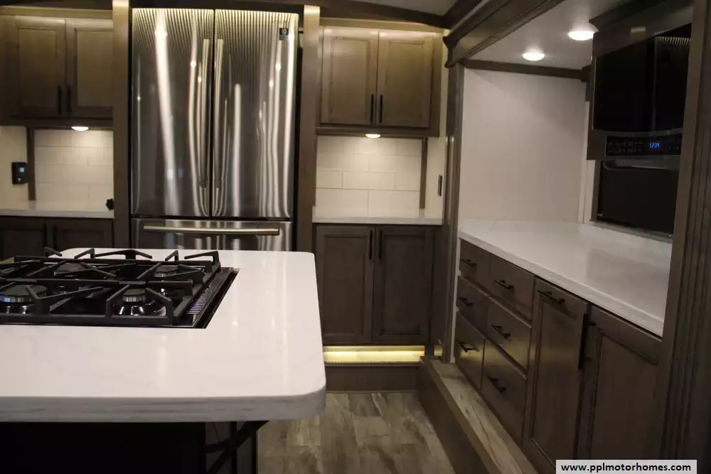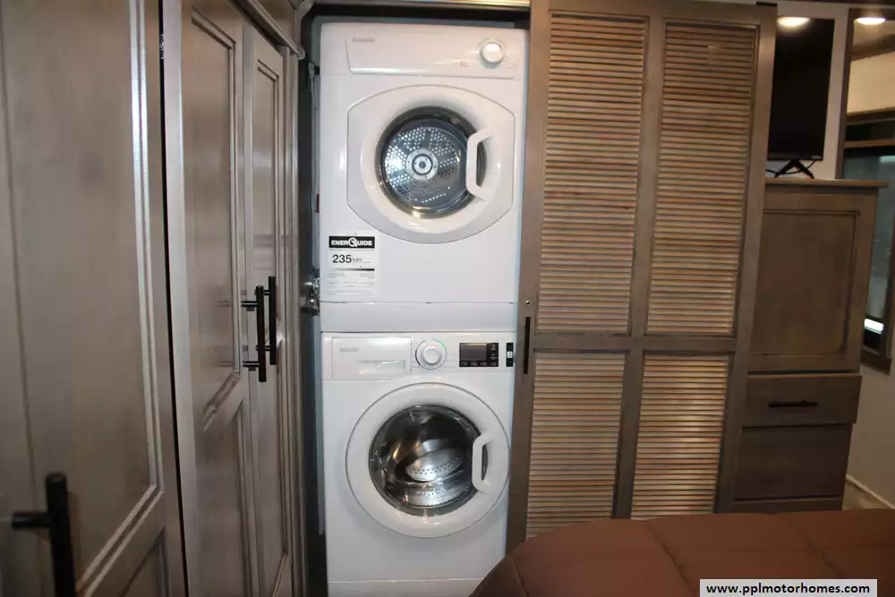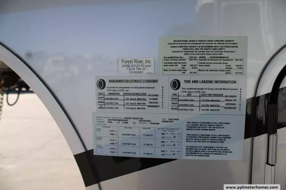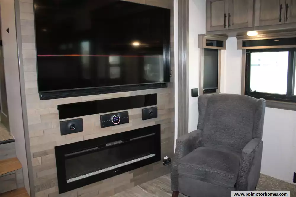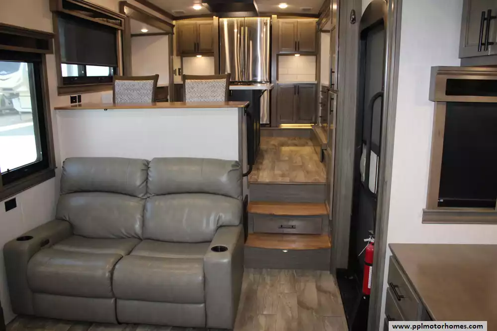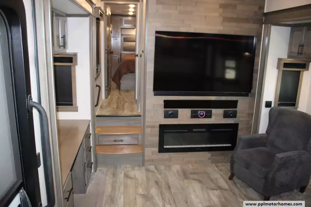 The 2021 Forest River RiverStone 42FSKG is a high-end toy hauler fifth wheel built for adventure without sacrificing luxury. With five slide-outs and a floorplan stretching about 44' 10", it has a dry weight around 17,700-17,800 lbs, a GVWR of 21,000 lbs, and a cargo (useful) capacity in the 3,200-3,300 lb range. Interior features include a residential-style 18 cu. ft. French door refrigerator with ice maker, solid surface countertops, optional dishwasher, large kitchen sinks, a central island, desk, fireplace, premium entertainment setup, washer/dryer, sleep number mattress, day/night shades, and plenty of storage. Outside, it offers full body paint, 3 roof A/Cs, an Onan 5,500-watt propane generator, a ramp door garage area suitable for toys (e.g. ATVs), full docking station, dual power awnings, and strong insulation (R-16 in walls, R-38 roof/floor) for better temperature control. It's designed for those who want to haul gear in style while still enjoying all the comforts of a luxury RV. Whether you're needing something to stay in a while, use on weekends, or just getting away, this Riverstone toy hauler offers you the styles, luxuries, and comforts of home, no matter the destination!