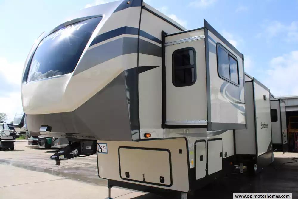 This 2021 Forest River Sandpiper 379FLOK Makes For A Great Getaway! Some Amenities Include.... A 6-Point One-Touch Hydraulic Leveling System, 6 Slide-Outs, 2 Ducted Air Conditioners, 110v Residential LG Refrigerator, In-Fridge Ice Maker, Automatic Main Awning, Washer/Dryer, Heated Tanks, Outside Speakers, 2 TVs(Including Televator TV), Soundbar, Outdoor Grill, Outdoor Kitchen, Outside Shower, Kitchen Island, Theater Seating With Heat/Massage/Plugs/USB, Fireplace, Central Vacuum, Microwave, 4 Burner Range, Oven, And More! Make This Front-Living Model Your New Home Away From Home! Ask About PPL's Financing Options! This Is Eligible For An Environmental Protection And Other Benefits!