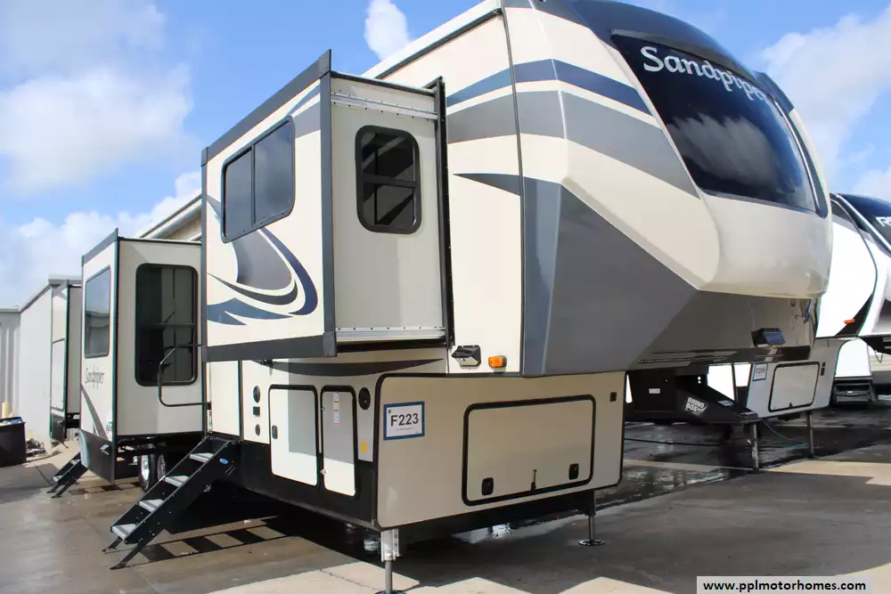This 2021 Forest River Sandpiper 379FLOK Makes For A Great Getaway! Some Amenities Include.... A 6-Point One-Touch Hydraulic Leveling System, 6 Slide-Outs, 2 Ducted Air Conditioners, 110v Residential LG Refrigerator, In-Fridge Ice Maker, Automatic Main Awning, Washer/Dryer, Heated Tanks, Outside Speakers, 2 TVs(Including Televator TV), Soundbar, Outdoor Grill, Outdoor Kitchen, Outside Shower, Kitchen Island, Theater Seating With Heat/Massage/Plugs/USB, Fireplace, Central Vacuum, Microwave, 4 Burner Range, Oven, And More! Make This Front-Living Model Your New Home Away From Home! Ask About PPL's Financing Options! This Is Eligible For An Environmental Protection And Other Benefits!