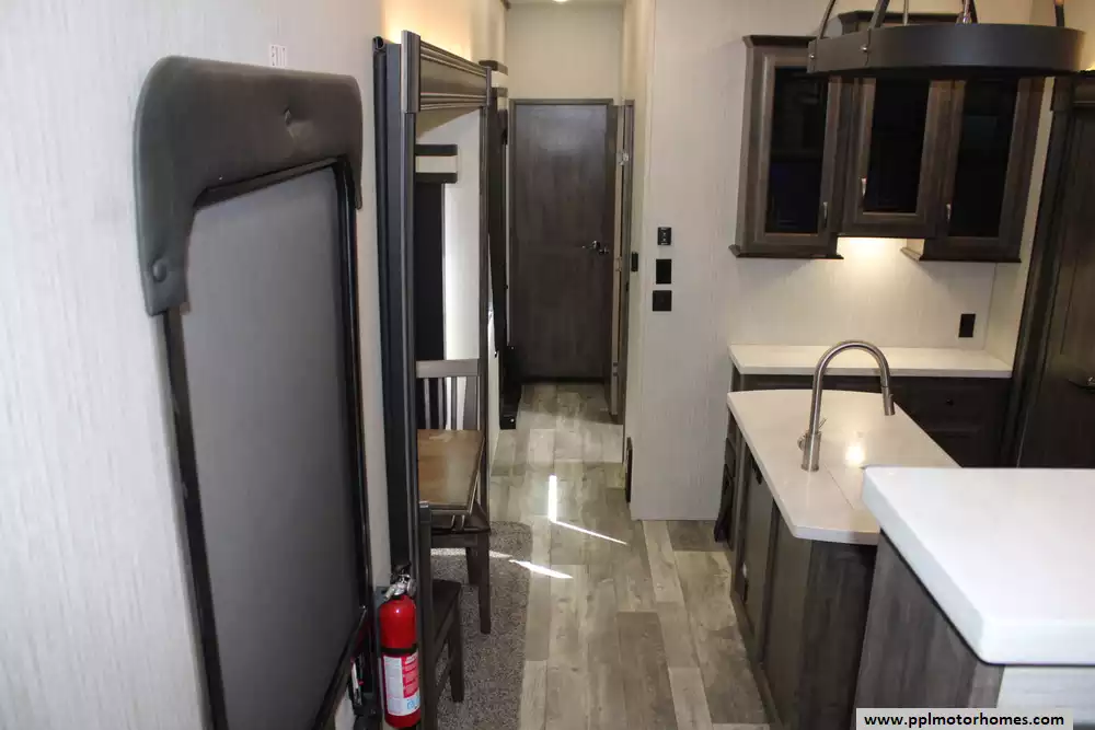 The 2021 Forest River Sandpiper 379FLOK is a luxury front-living fifth wheel spanning approximately 42 ft 9 in with a dry weight near 13,069 lb, GVWR of 16,069 lb, and a carrying capacity of 3,000 lb, sleeping up to six on a rear king bedroom and two tri-fold hide-a-beds in the front lounge across six power slide-outs for outstanding space and flow. It features a full center kitchen with island, theater seating, and a pop-up 50" LED TV above a fireplace, all in a front windshield living room bathed in natural light. Built on a welded aluminum-framed, vacuum-bonded structure with an enclosed, heated underbelly, hydraulic auto-leveling, large tinted picture windows, and an exterior kitchen with grill and speakers, the 379FLOK blends form and function. Honorable mentions include prep for rear/side/doorway cameras, and a stacked washer and dryer. Enjoy your stay in this 2021 Sandpiper 379FLOK.