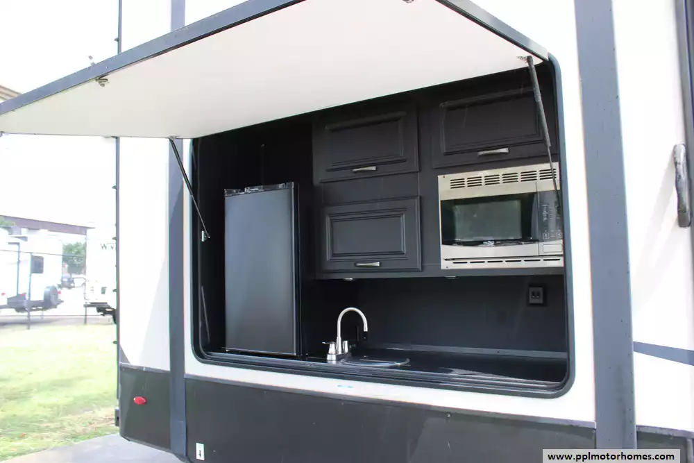 This 2021 Sandpiper 384QBOK is a luxurious, super spacious fifth wheel built for larger families or groups. Amenities Include...5 Slide-outs, 2 Ducted Air Conditioners, Residential Lg Refrigerator, In-Fridge Ice Maker, Automatic Main Awning, Washer/Dryer Connections, Outside Speakers, DVD Player, Outdoor Kitchen, Outside Shower, Fireplace, Central Vacuum, Microwave, 4 Burner Range, and Oven.