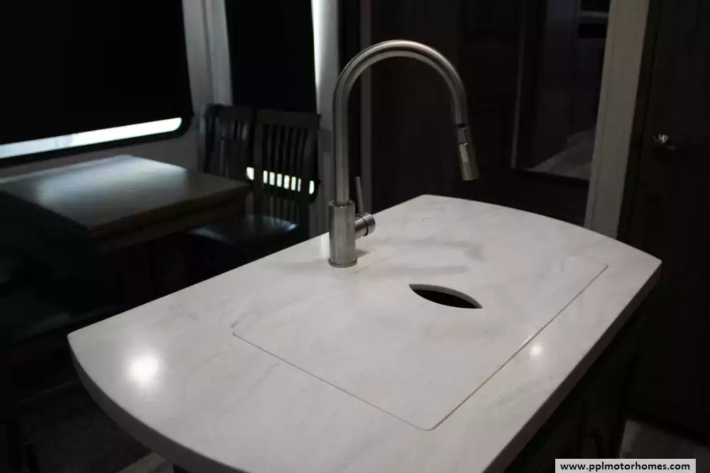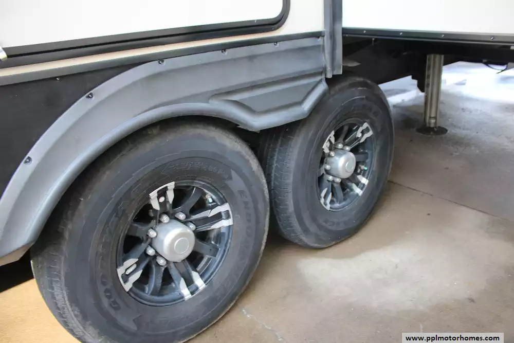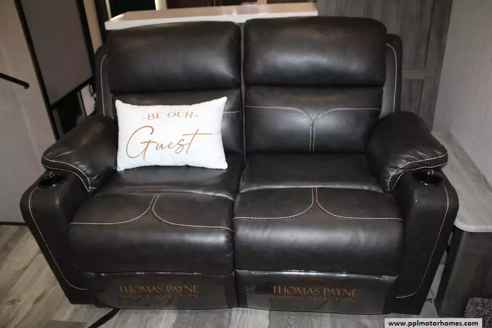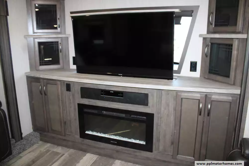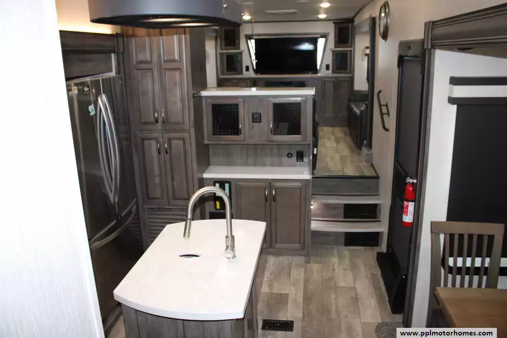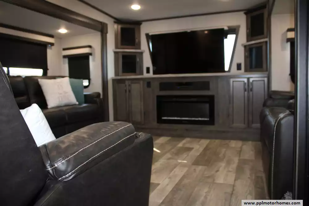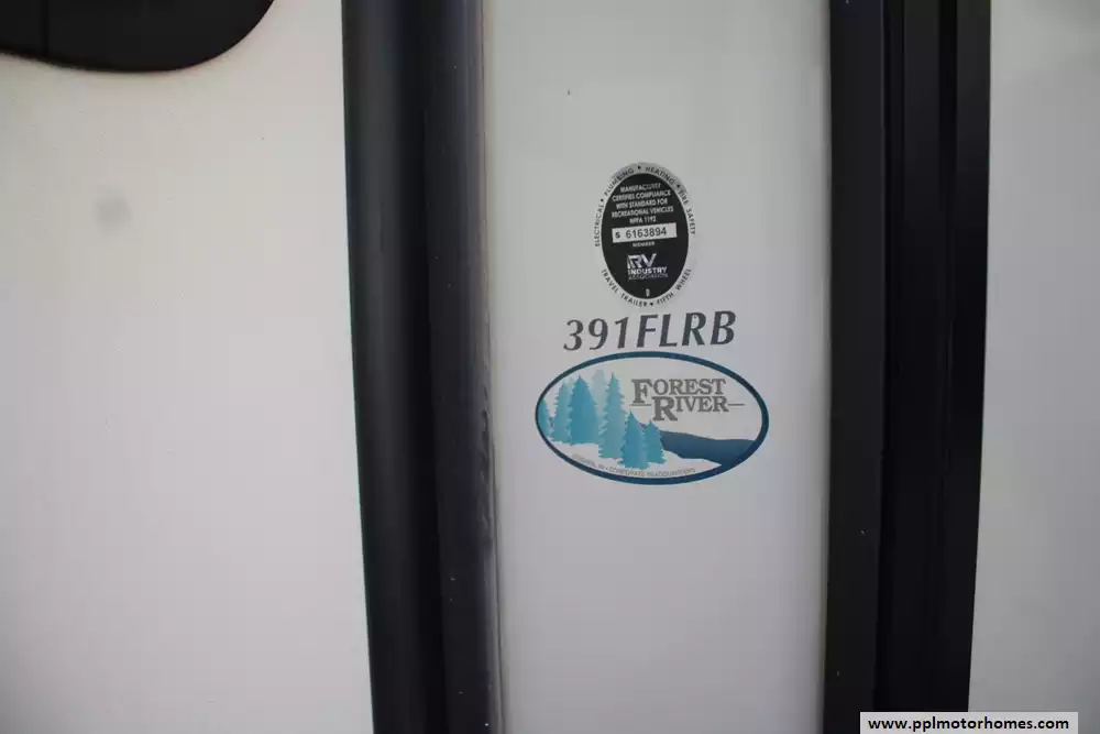 The 2021 Forest River Sandpiper 391FLRB is a luxurious, five-slide fifth-wheel designed for serious comfort and entertaining, measuring approximately 42 ft 8-in in length with a dry weight of around 13,009 lbs and a GVWR of 16,009 lbs. The layout features a front living area with theater seating and dual tri-fold sofas, a centrally located kitchen with a large island and opposing slides, an outside kitchen beneath a 20-plus-foot power awning, and a rear master suite with a king bed, dual vanity sinks and walk-in shower with seat. Extensive residential-style amenities include stainless appliances, full-extension soft-close cabinetry, 84-inch interior height, and an insulated heated underbelly for extended season use. With sleeping capacity for six and massive holding tanks (50 gal fresh, 104 gal grey, 52 gal black), it's built for extended stays and upscale camping.