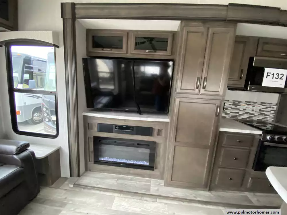 The heart of this coach is its innovative floor plan, which utilizes three slide-outs to create an expansive and inviting living environment. The triple-slide configuration significantly opens up the interior, providing a spacious island kitchen and a rear living area that feels like a custom home. This unit is equipped with a large refrigerator to keep your supplies fresh for the long haul, while the opposing slides maximize floor space to accommodate comfortable seating and large picture windows that flood the coach with natural light.