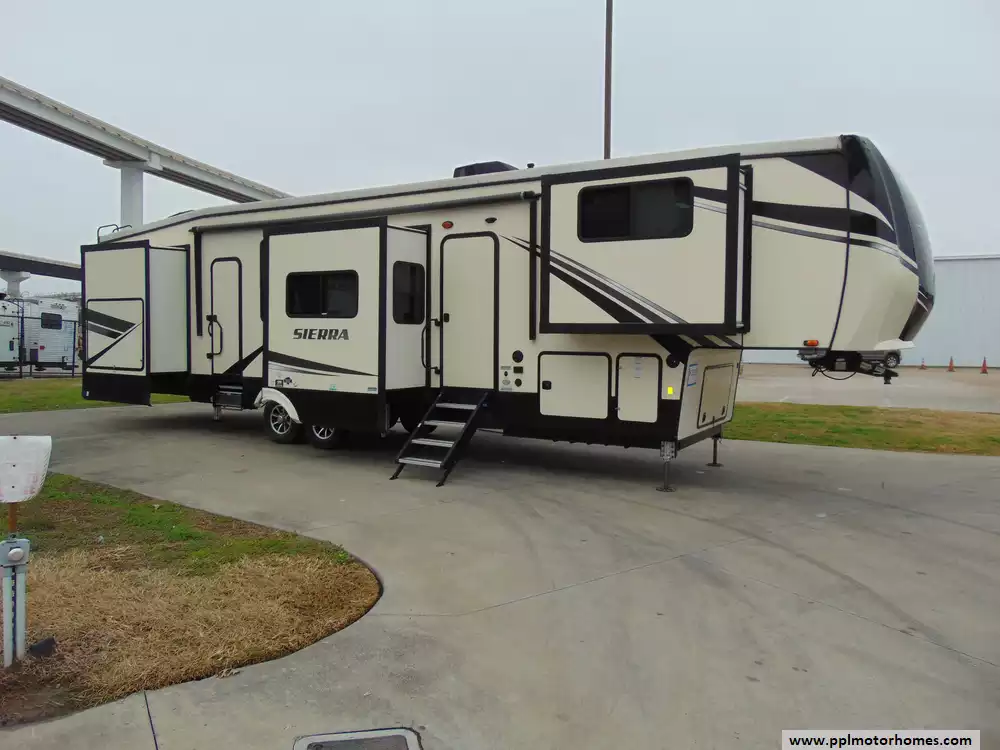 This 2021 Sierra 38FKOK is a luxurious fifth wheel designed for comfort and upscale living,making it an ideal choice for full-time RVers or those seeking a premium camping experience.It delivers spacious interiors while requiring a heavy-duty truck for towing.Amenities Include...6 Slide-outs, 2 Ducted Air Conditioners,Residential Lg Refrigerator, In-Fridge Ice Maker Automatic Main Awning,Washer/Dryer,2 Queen Sofabeds,Satellite Dish,Theatre Seating,MorRyde Steps,Large Shower with Seat,Outside Speakers,TV,Auto Leveling Power Jacks,Equipped with King Wifi Router/Range Extender,Underbelly Armor/Rigid Road Debris Protection,Seasonal Protection Package, DVD Player,Outdoor Grill,Outdoor Kitchen,Outside Shower, Microwave,3 Burner Range,and Oven.It is designed for all-season use,delivering a perfect blend of elegance and functionality.