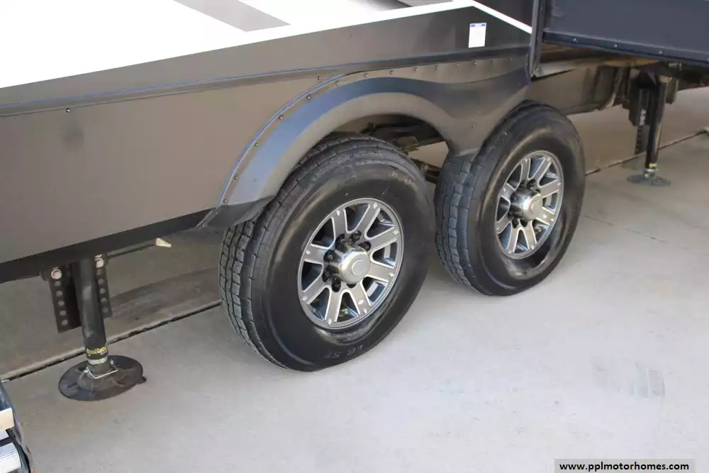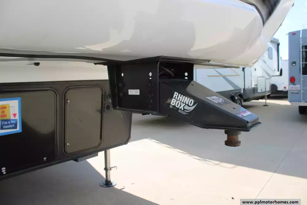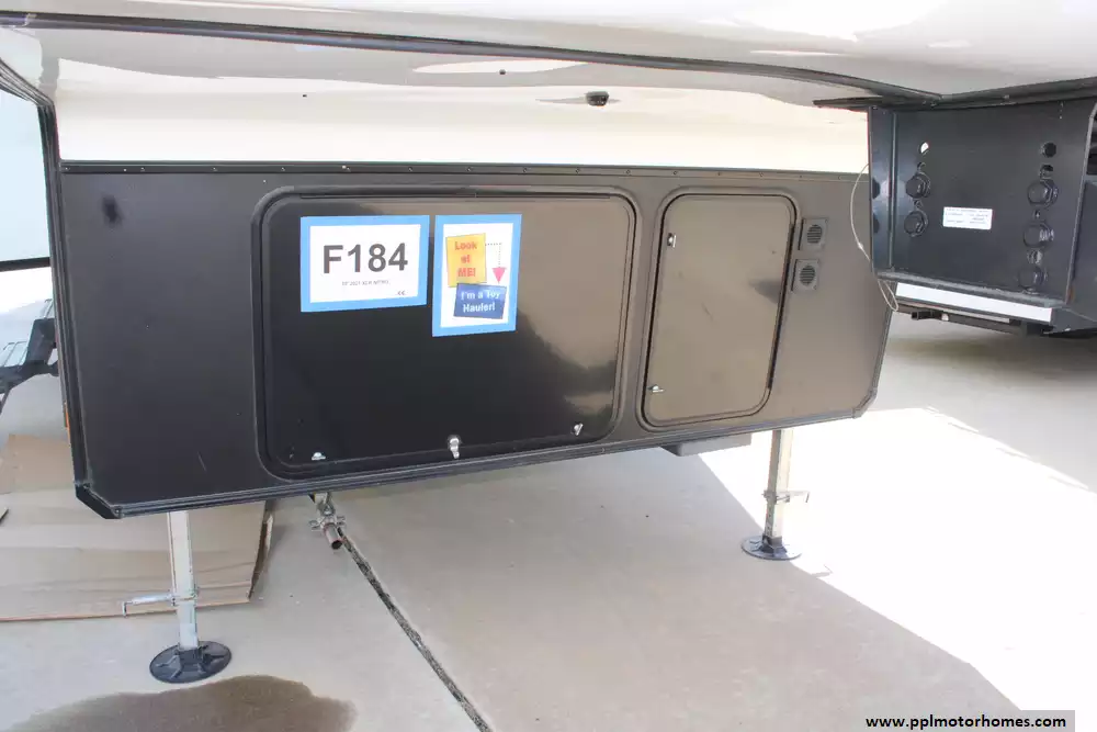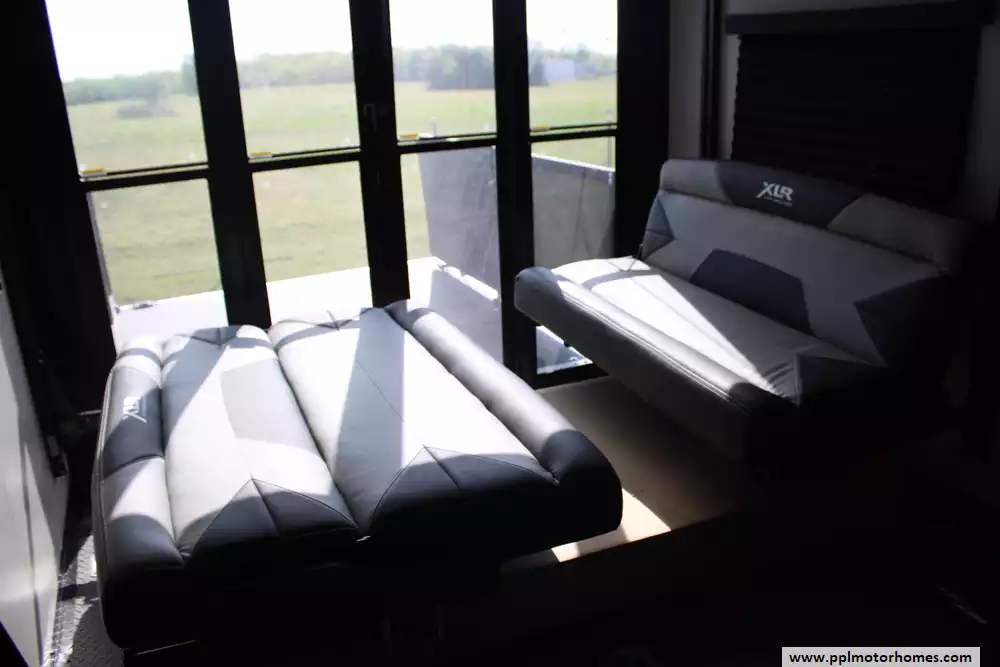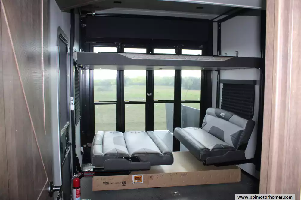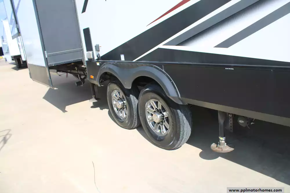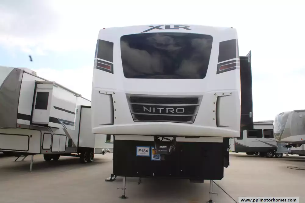 With dual bathrooms, generous tank capacities (including a 102-gallon fresh water tank), and a 15,000 BTU air conditioner, it is well-suited for extended trips or off-grid use. Combining rugged cargo capability with upscale interior amenities and ample sleeping space, the Nitro 351 offers a practical yet comfortable solution for travelers who want to bring along ATVs, motorcycles, or other gear without sacrificing livability. This XLR Nitro also has a brand-new roof!