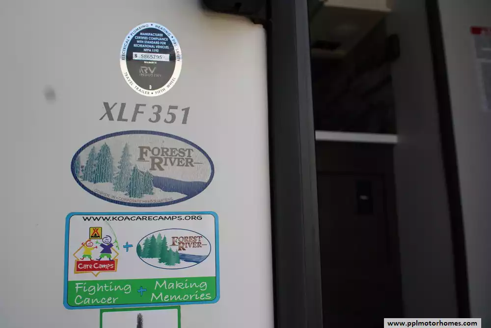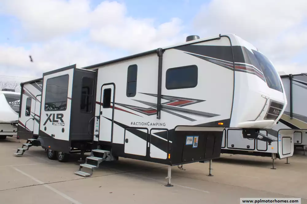 The 2021 Forest River XLR Nitro 351 is a large, feature-packed fifth wheel toy hauler built for both adventure and residential-style comfort, measuring just over 40 feet in length with a durable aluminum-frame, fiberglass-sided construction. Designed to accommodate up to eight people, it features a versatile layout with three slide-outs, a front master suite with a king bed, a central living area with multiple sofas, fireplace, and full kitchen, plus a 14-foot rear garage space with tie-downs, auxiliary fuel station, and ramp door that can double as a patio.