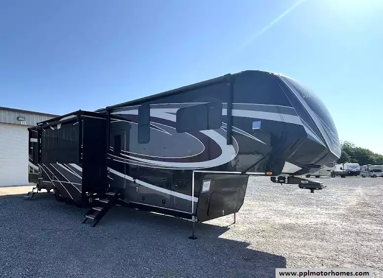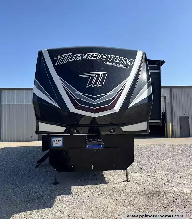 This 2021 Momentum 397TH-R has a Hydraulic Landing Gear, 3 Slide-outs, Onan Generator, 3 Ducted Air Conditioners, Residential Samsung Refrigerator, In-Fridge Ice Maker, Automatic Main Awning And Window/Slide/Door Awnings, Washer/Dryer, Outside Speakers, 4 TVs, Fireplace, Central Vacuum, Microwave, 4 Burner Range, Oven, Full Body Paint, Full Custom Skirt, Dual Sim Modem, Keyless Entry