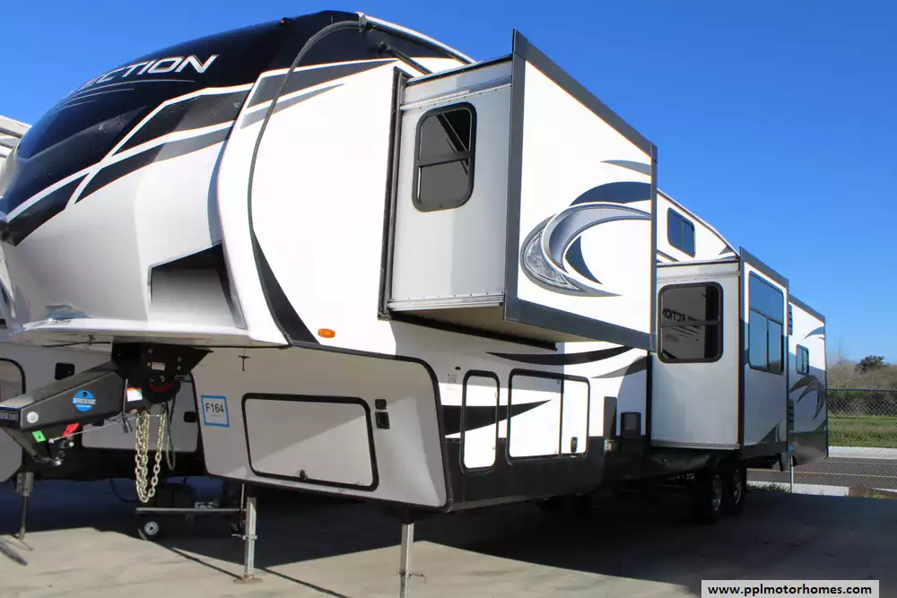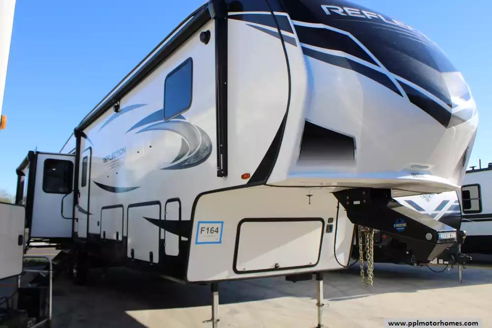 This 2021 Reflection 367BHS has an Electric Landing Gear, 4 Slide-outs, 2 Ducted Air Conditioners, 4 Door Gas/110v Norcold Refrigerator (Additional Refrigerator Present), Automatic Main Awning, Washer/Dryer Connections, Heated Tanks, Outside Speakers, TV, DVD Player, Outside Shower, Convection Microwave, 3 Burner Range, Oven