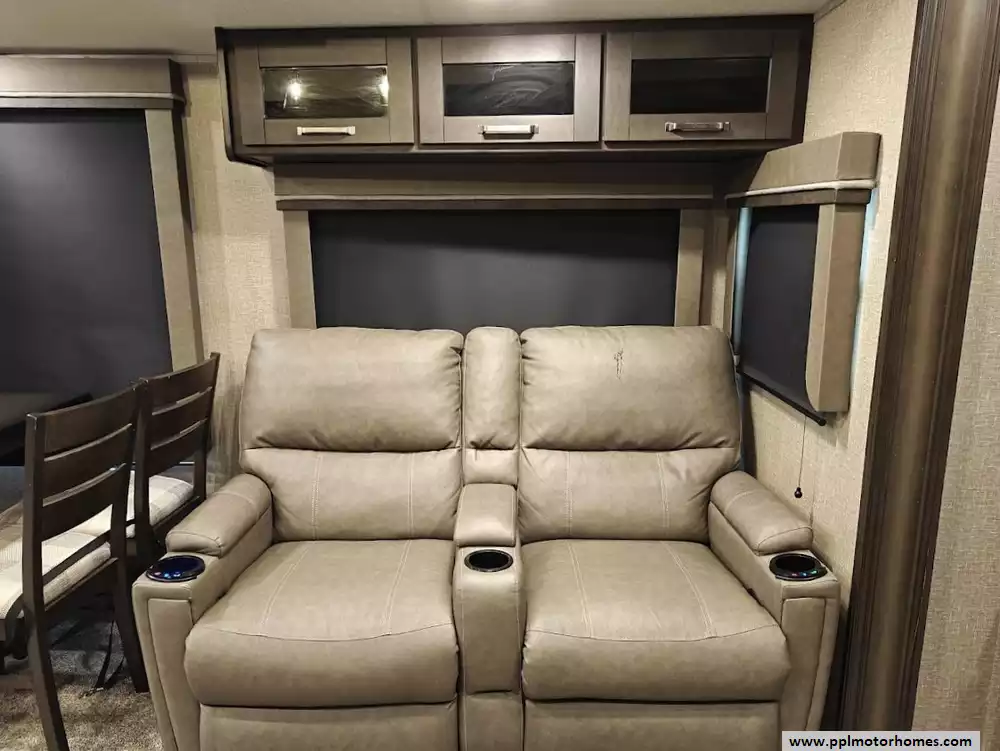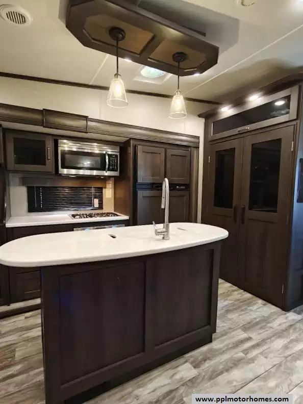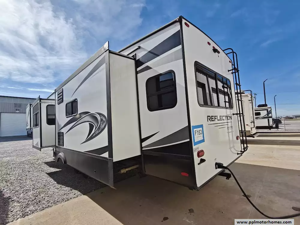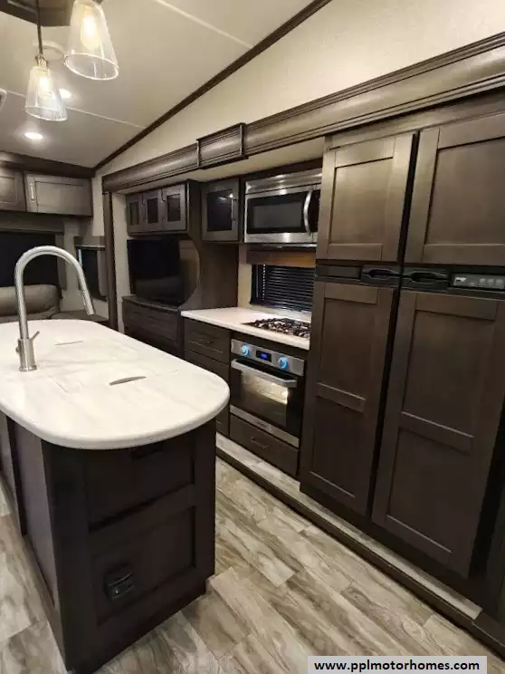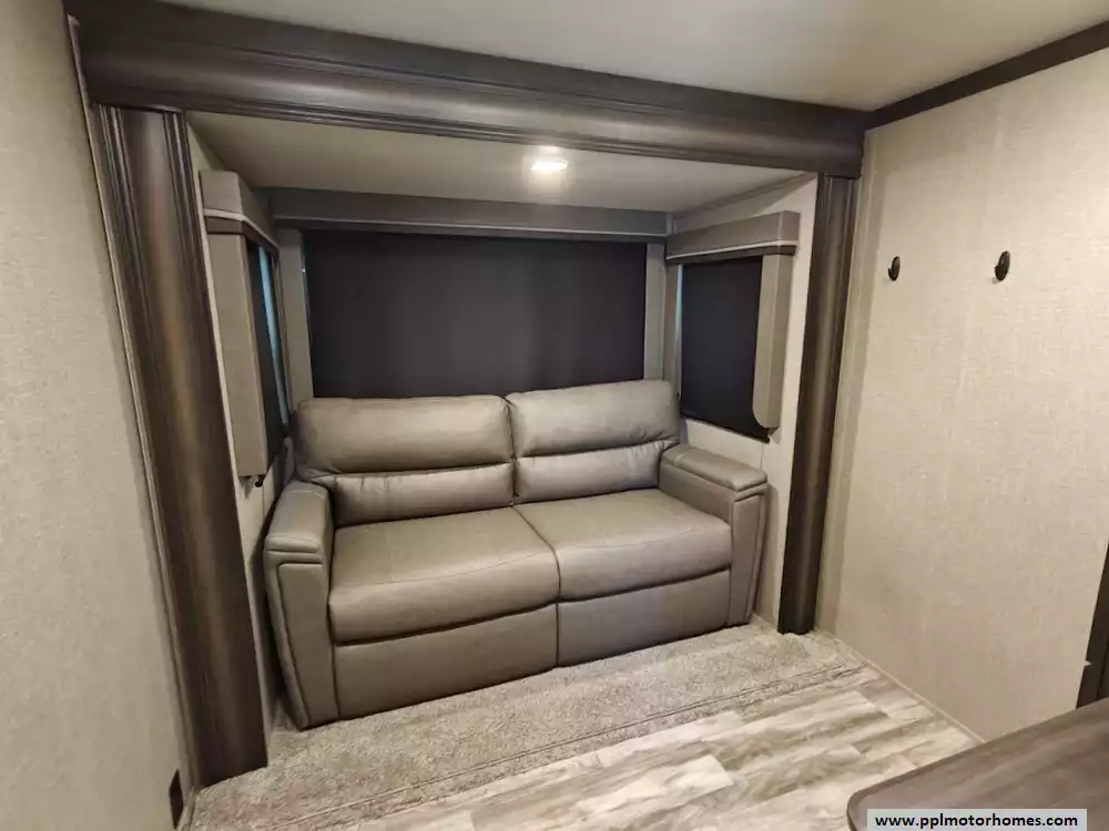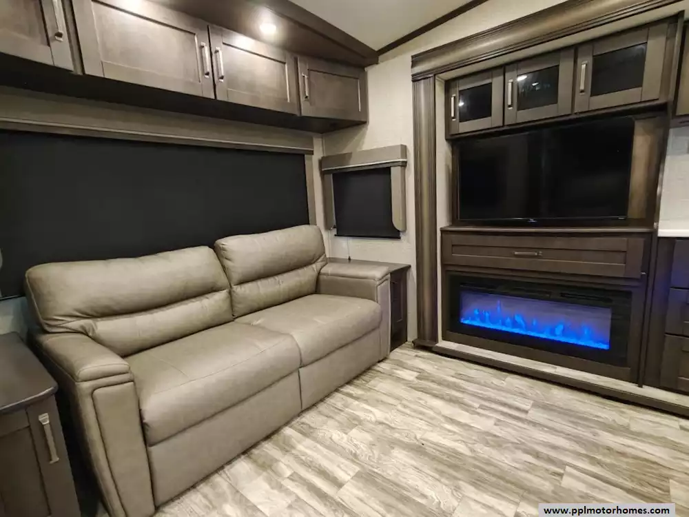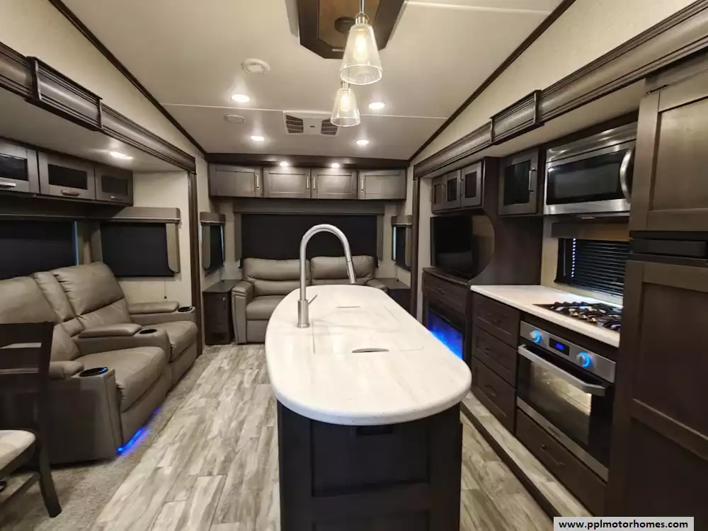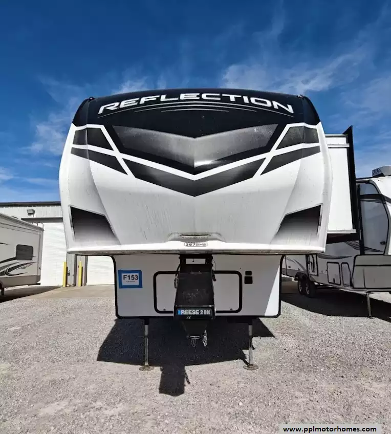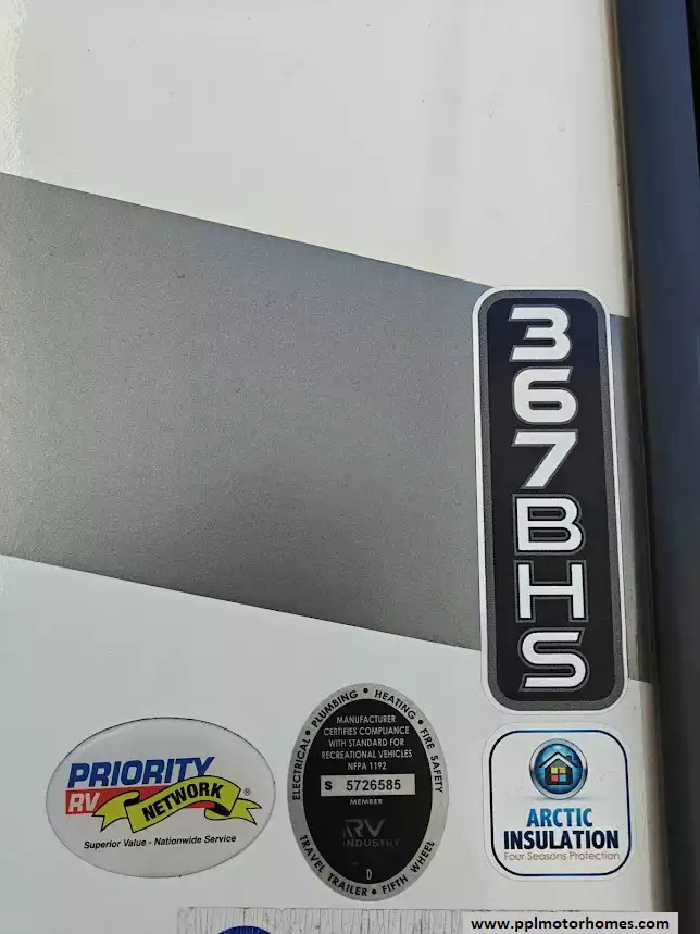 The 2021 Grand Design Reflection 367BHS is a 41-foot fifth wheel RV known for its versatile mid-bunkhouse floor plan and extensive amenities. The main living area is located in the rear of the fifth wheel and is designed for comfort and entertainment, featuring ample seating and an electric fireplace. The open layout is enhanced by a kitchen island and high-end residential cabinetry. The living area flows seamlessly into the kitchen area, which features a large center island, solid surface countertops, and a spacious pantry, making it a central hub for cooking and socializing. The kitchen features a large refrigerator, 3-burner cooktop, microwave and oven. A large pantry with double doors and motion-sensored LED lights provides ample storage space for dry goods. The kitchen features residential cabinetry with hand-rubbed maple cabinet doors and solid hardwood drawer fronts. The standard bed is a queen mattress, which lifts up, offering oversized storage underneath. A spacious, full-width front wardrobe (closet) provides extensive storage space with shelving and hanging rods. The bathroom is a spacious, residential-style walk-through bathroom located at the front of the RV, offering direct access to both the master bedroom and the main hallway. A large, walk-in shower is a prominent feature. It is enclosed by a glass door and includes a skylight overhead to provide additional natural light and headroom. The bathroom includes a power vent fan for moisture control and has both heat ducts and A/C vents to ensure comfortable temperatures in all seasons. Key exterior features include: six-point hydraulic auto-leveling system makeing set up at the campsite quick and hassle-free, large, unobstructed pass-through storage compartment is located in the front, equipped with metal slam-latch cargo doors.