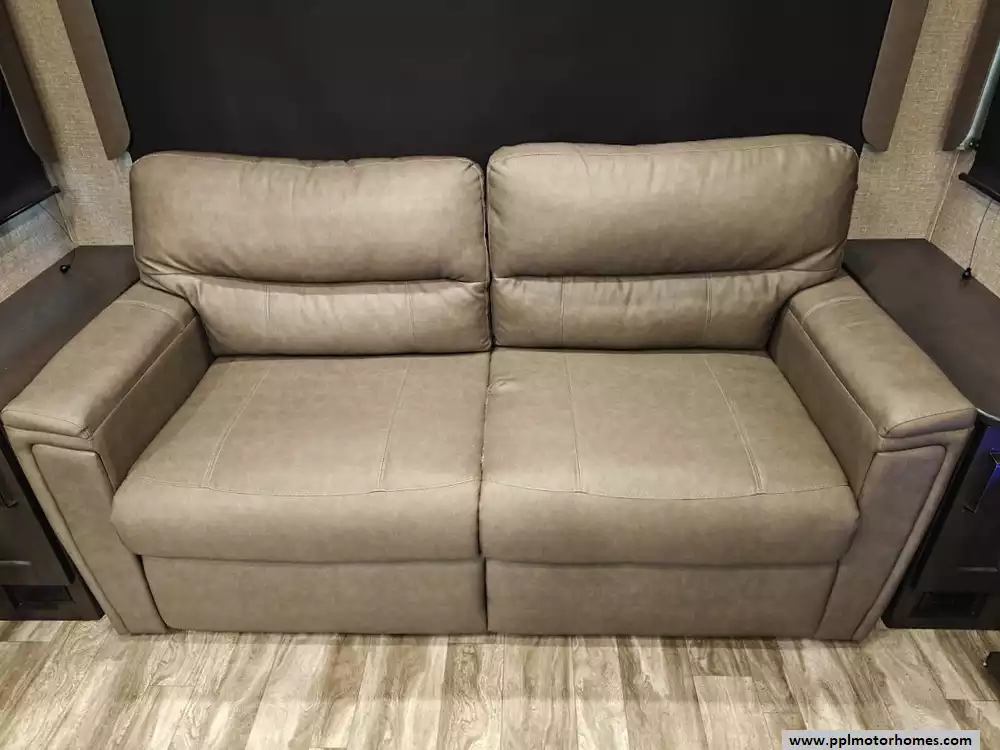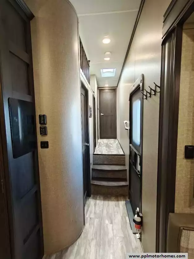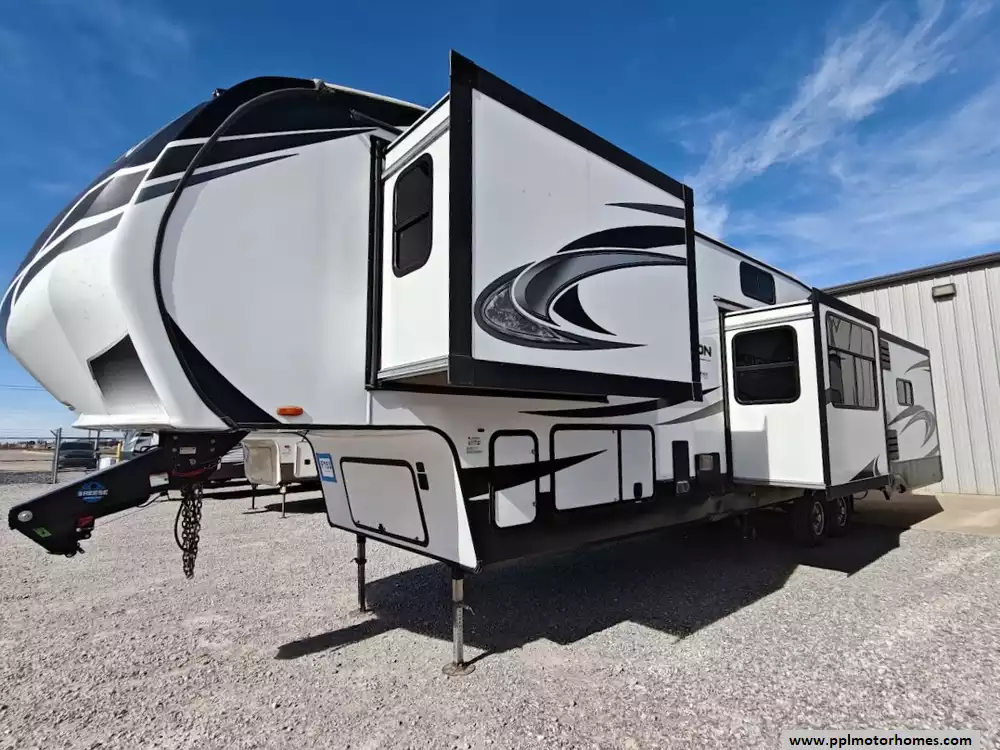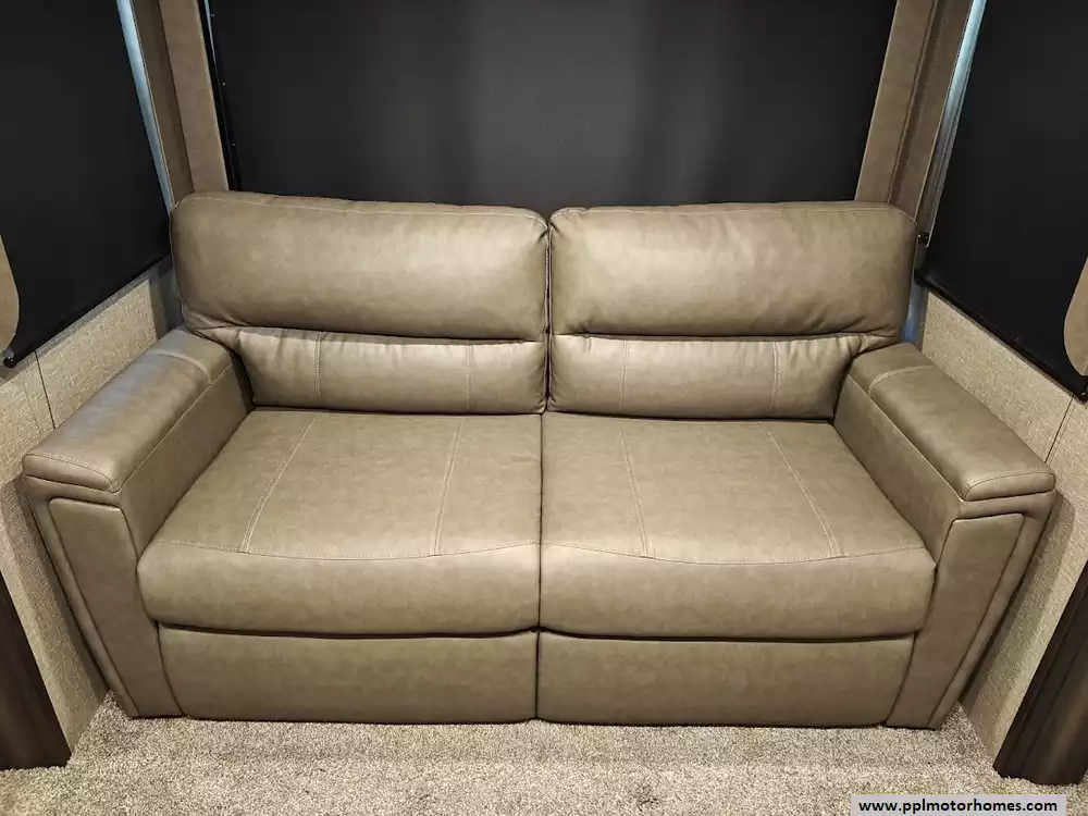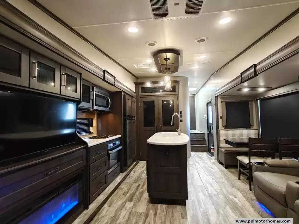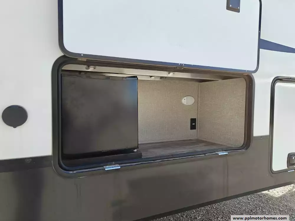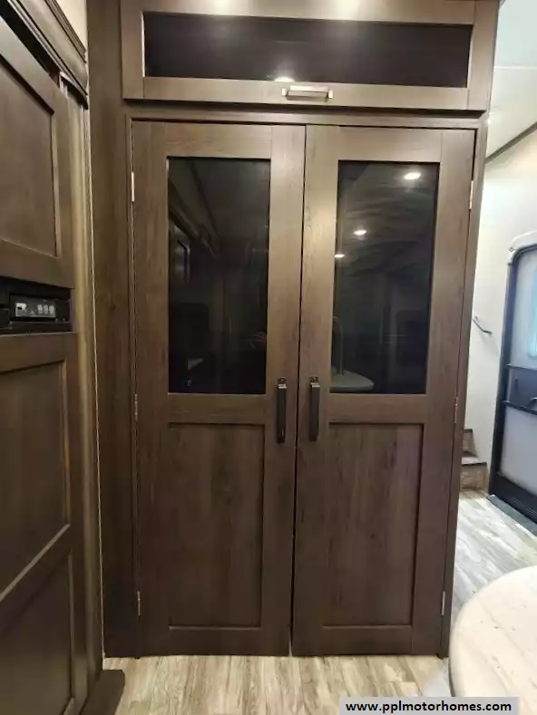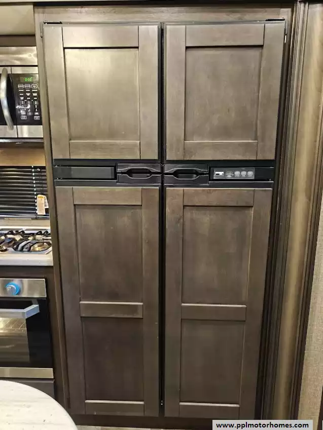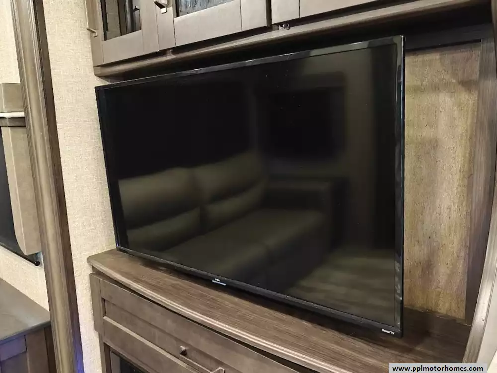 The 2021 Grand Design Reflection 367BHS is a 41-foot fifth wheel RV known for its versatile mid-bunkhouse floor plan and extensive amenities. The main living area is located in the rear of the fifth wheel and is designed for comfort and entertainment, featuring ample seating and an electric fireplace. The open layout is enhanced by a kitchen island and high-end residential cabinetry. The living area flows seamlessly into the kitchen area, which features a large center island, solid surface countertops, and a spacious pantry, making it a central hub for cooking and socializing. The kitchen features a large refrigerator, 3-burner cooktop, microwave and oven. A large pantry with double doors and motion-sensored LED lights provides ample storage space for dry goods. The kitchen features residential cabinetry with hand-rubbed maple cabinet doors and solid hardwood drawer fronts. The standard bed is a queen mattress, which lifts up, offering oversized storage underneath. A spacious, full-width front wardrobe (closet) provides extensive storage space with shelving and hanging rods. The bathroom is a spacious, residential-style walk-through bathroom located at the front of the RV, offering direct access to both the master bedroom and the main hallway. A large, walk-in shower is a prominent feature. It is enclosed by a glass door and includes a skylight overhead to provide additional natural light and headroom. The bathroom includes a power vent fan for moisture control and has both heat ducts and A/C vents to ensure comfortable temperatures in all seasons. Key exterior features include: six-point hydraulic auto-leveling system makeing set up at the campsite quick and hassle-free, large, unobstructed pass-through storage compartment is located in the front, equipped with metal slam-latch cargo doors.