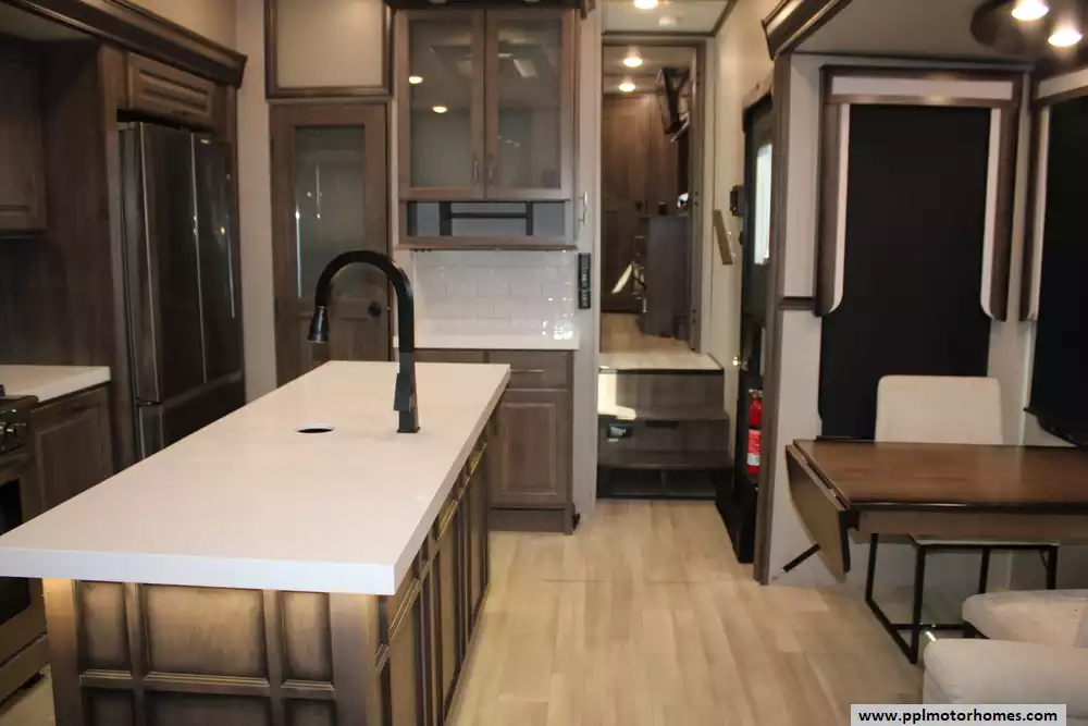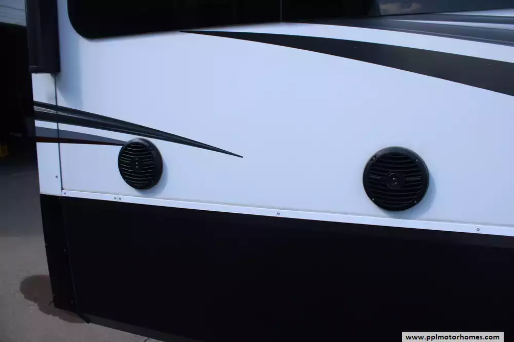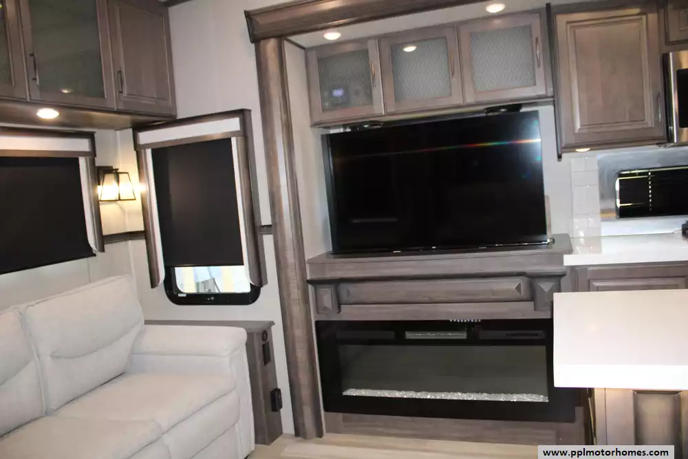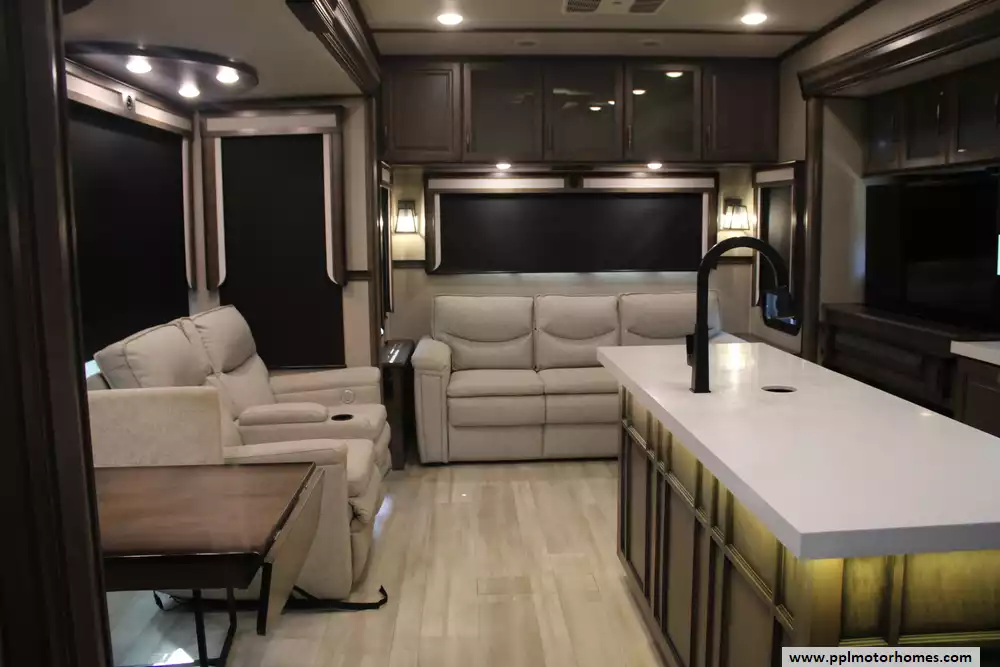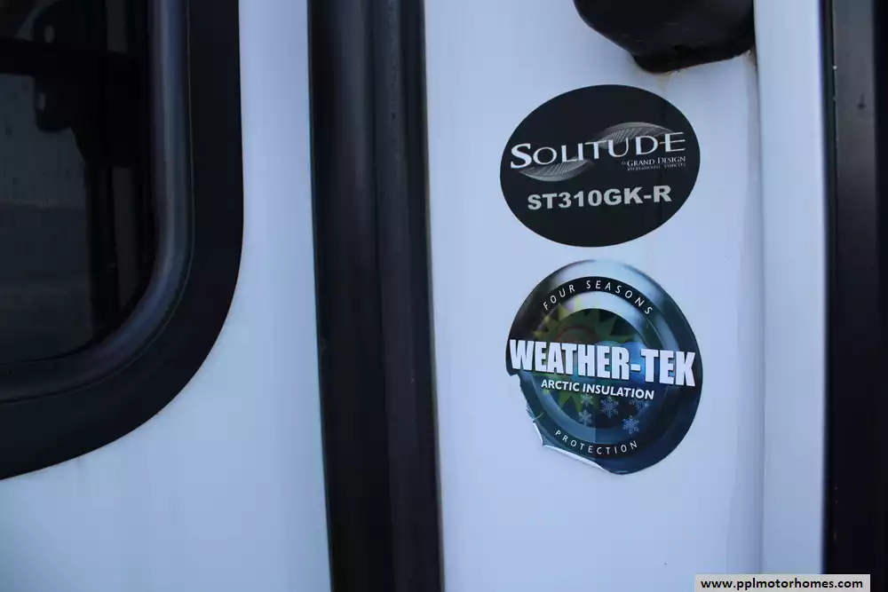 The 2021 Grand Design Solitude 310GK-R is a high-end, three-slideout fifth wheel measuring roughly 34' 11" in length, built with an aluminum cage construction and premium insulation to support extended stays and all-season adventures. It carries a dry weight of about 12,100 lbs and has a GVWR of 15,000 lbs, giving it a payload of 2,900 lbs. Its living area features a mid-kitchen layout with a kitchen island, a residential 18 cu. ft. refrigerator, lighted theater seating (with heat and massage), a fireplace, and a wide open design for entertaining. While the base 310GK-R typically comes with prep for a third A/C, this model already has third A/C installed, which raises the comfort ceiling, especially in hot climates by enabling zoned cooling or redundancy to keep the interior comfortable even under extreme heat. Other comforts and amenities include a powered TV lift, 6-point one-touch hydraulic leveling system, large kitchen island, ample storage, frameless tinted windows, MORryde "Easy Reel" power cord reel, rear camera (including monitor), and the sellers have recently replaced the batteries and mattress. All this Solitude needs is a new home!