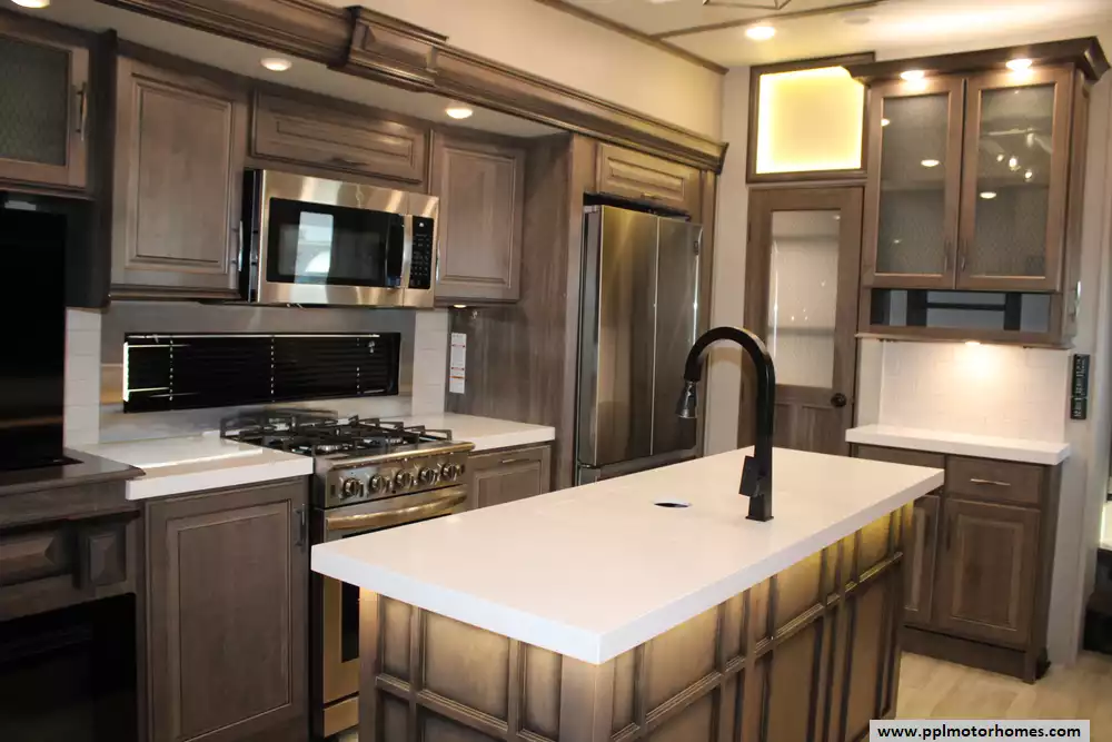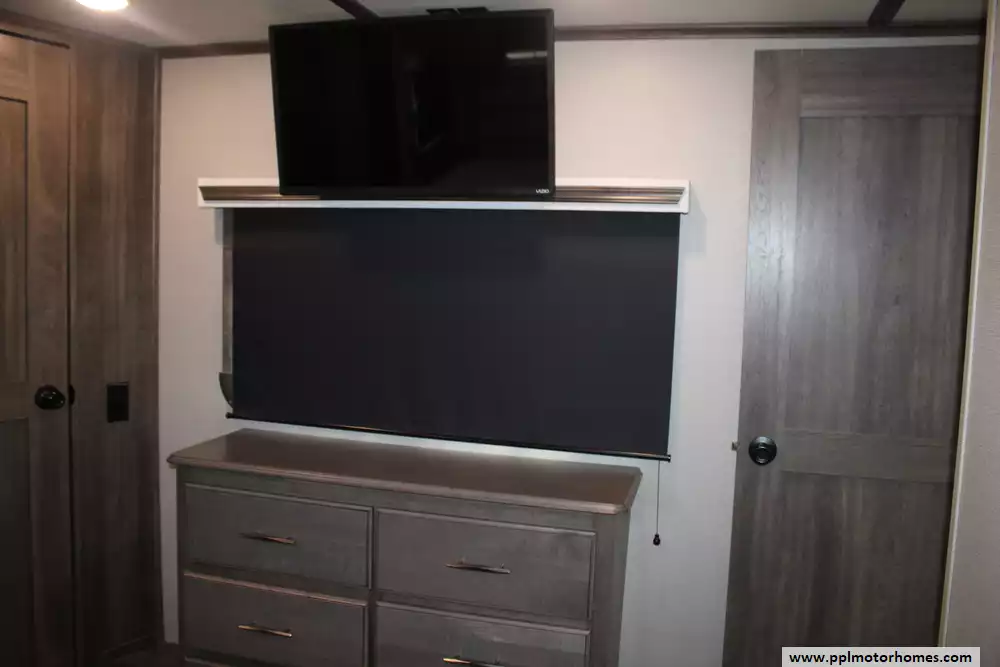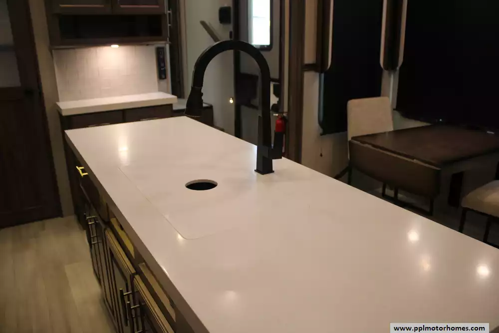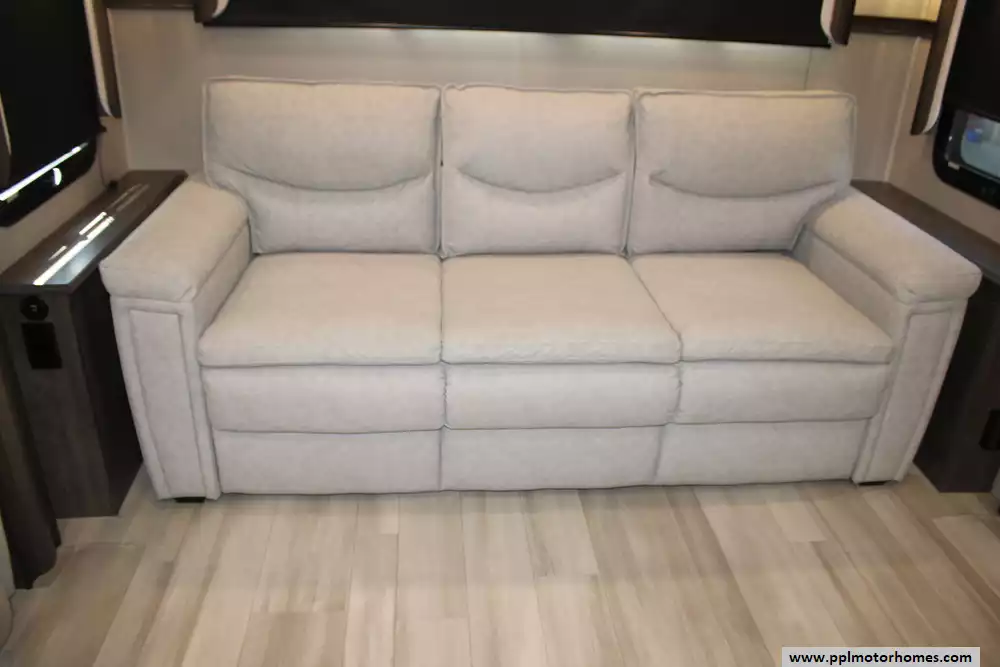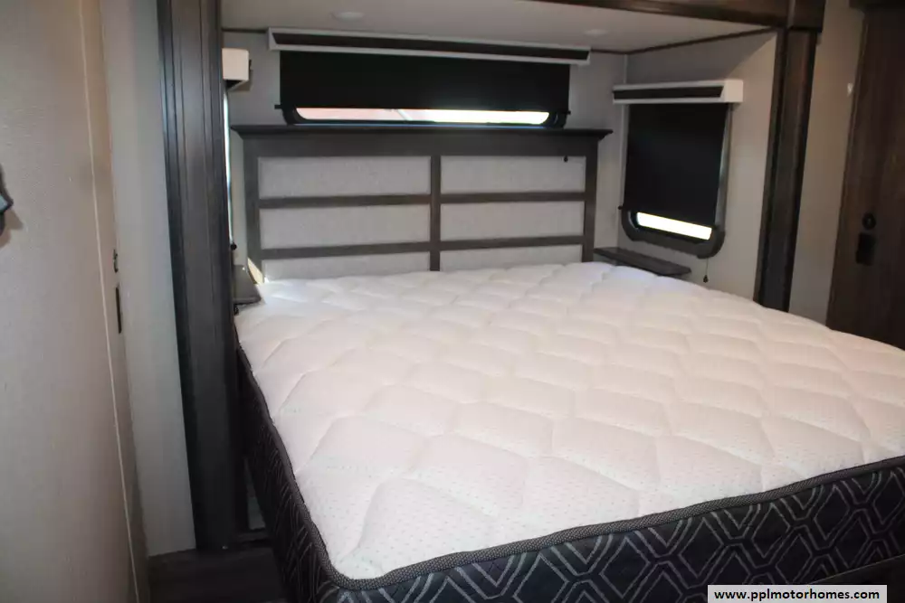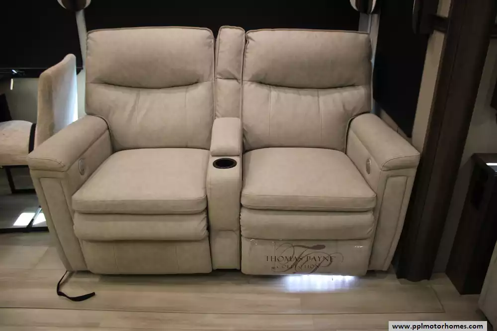 The 2021 Grand Design Solitude 310GK-R is a high-end, three-slideout fifth wheel measuring roughly 34' 11" in length, built with an aluminum cage construction and premium insulation to support extended stays and all-season adventures. It carries a dry weight of about 12,100 lbs and has a GVWR of 15,000 lbs, giving it a payload of 2,900 lbs. Its living area features a mid-kitchen layout with a kitchen island, a residential 18 cu. ft. refrigerator, lighted theater seating (with heat and massage), a fireplace, and a wide open design for entertaining. While the base 310GK-R typically comes with prep for a third A/C, this model already has third A/C installed, which raises the comfort ceiling, especially in hot climates by enabling zoned cooling or redundancy to keep the interior comfortable even under extreme heat. Other comforts and amenities include a powered TV lift, 6-point one-touch hydraulic leveling system, large kitchen island, ample storage, frameless tinted windows, MORryde "Easy Reel" power cord reel, rear camera (including monitor), and the sellers have recently replaced the batteries and mattress. All this Solitude needs is a new home!