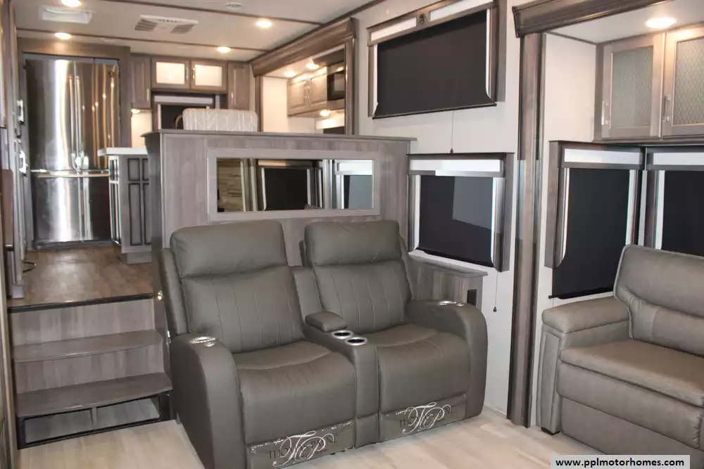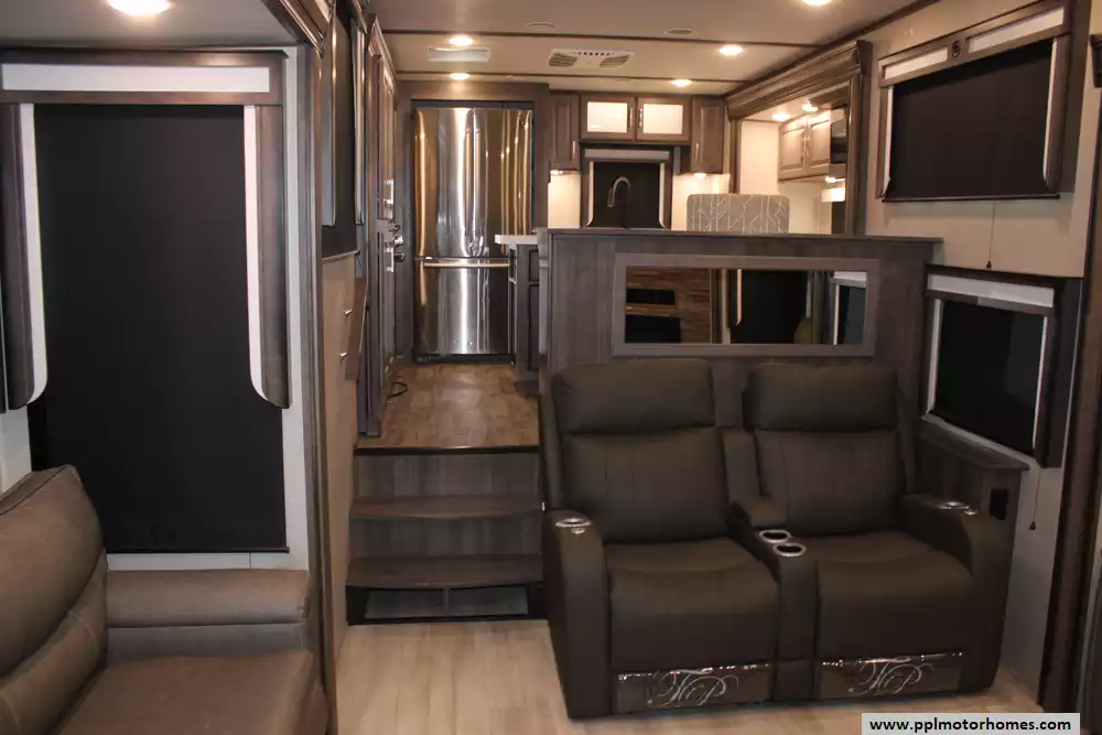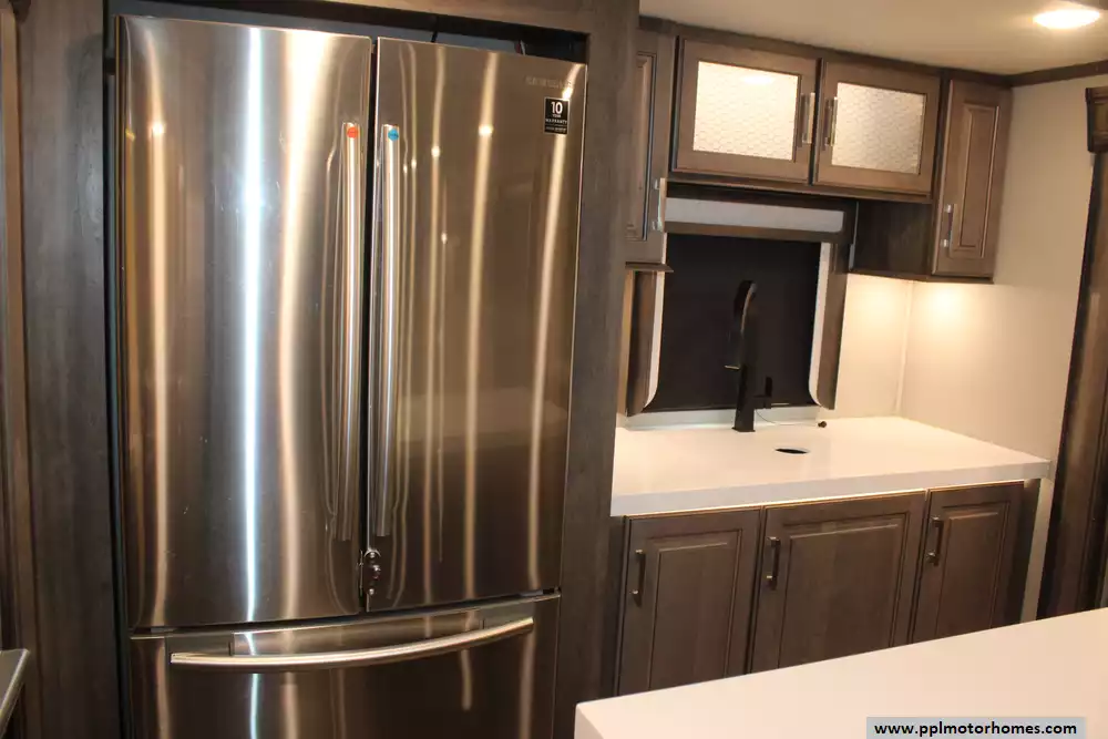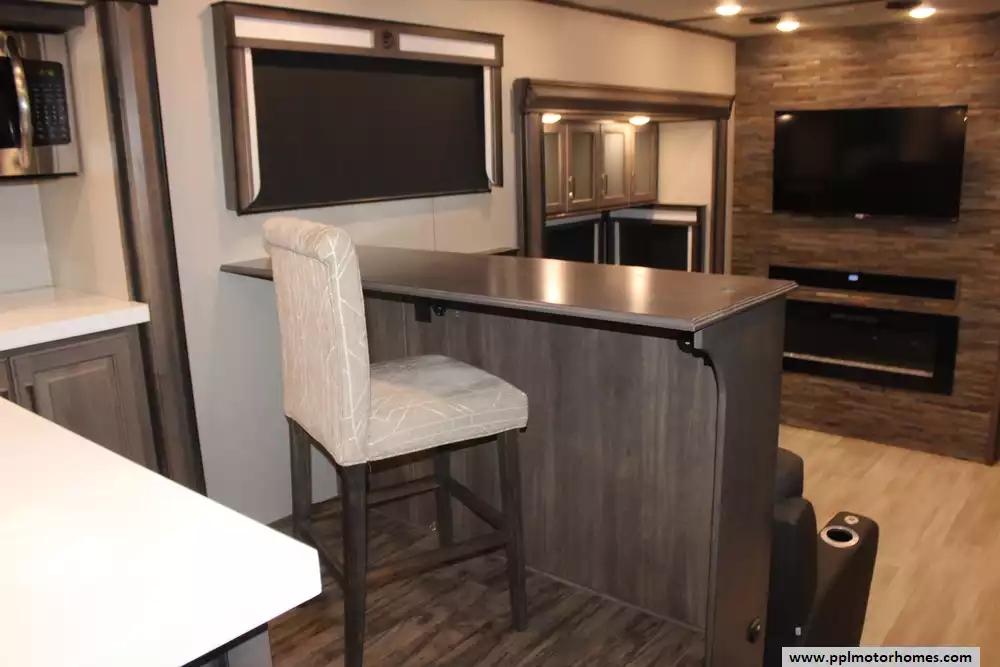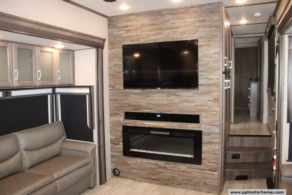 Experience the pinnacle of luxury living on the road with this 2021 Grand Design Solitude 390RK. As one of the most respected names in the industry, the Solitude line is celebrated for its residential-grade construction and sophisticated design, making it a premier choice for extended-stay travelers. This 41-foot fifth wheel features a unique rear-kitchen layout that maximizes workspace and storage, offering a chef-inspired environment complete with a four-burner range, oven, microwave, and a massive 110v residential Samsung refrigerator with an in-fridge ice maker. The five spacious slide-outs create an expansive interior that feels more like a custom home than an RV, highlighted by a cozy fireplace and a large TV for ultimate relaxation.