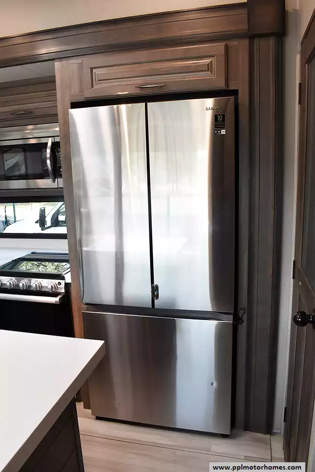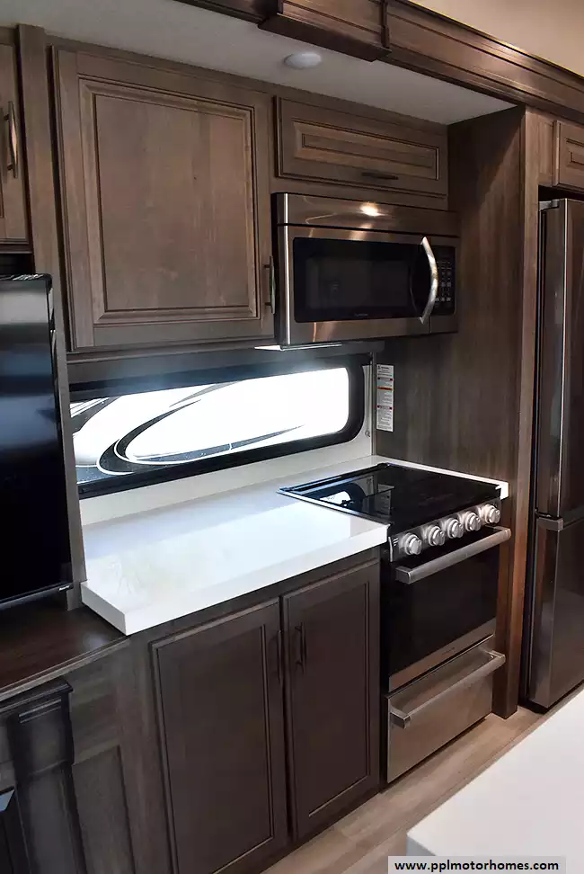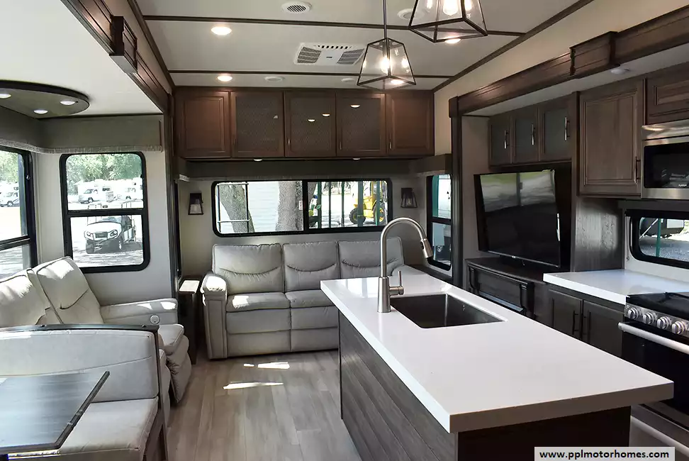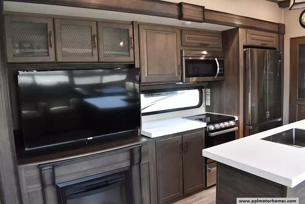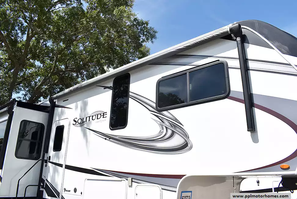 This 2021 Solitude S Class 2930RL has an Electric Landing Gear, 3 Slide-outs, 2 Ducted Air Conditioners, Residential Samsung Refrigerator, In-Fridge Ice Maker, Automatic Main Awning And Window/Slide Awnings, Heated Tanks, Outside Speakers, 2 TVs, Outside Shower, Fireplace, Convection Microwave, 3 Burner Range, Oven
