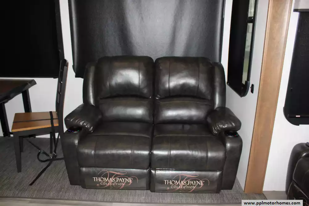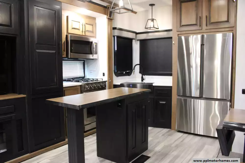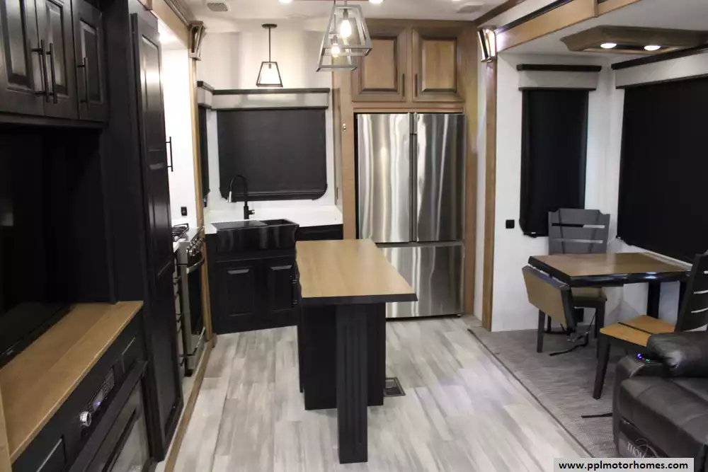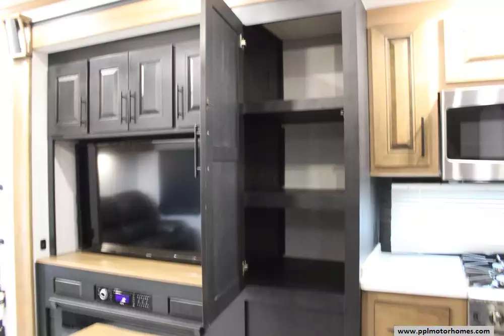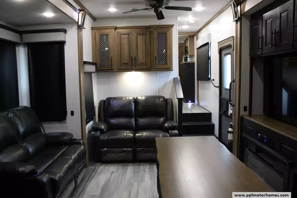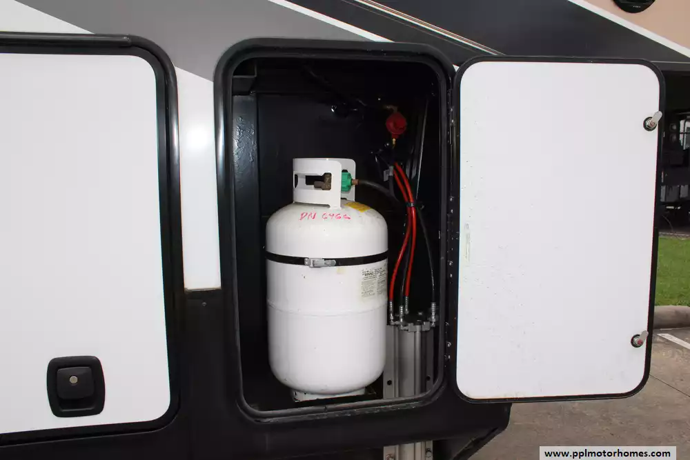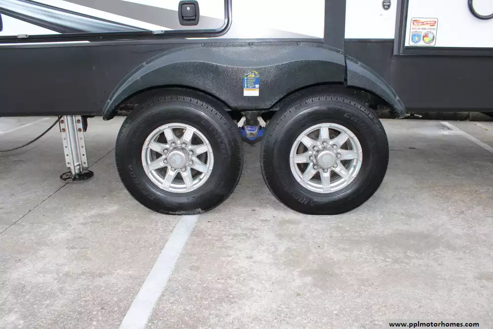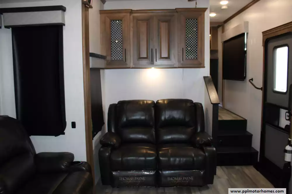 Specs: Length: 37.5 ft., Width: 8 ft., Height: 13.25 ft., Interior Height: 6.33 ft., Payload Capacity: 4,480 lbs., Total Fresh Water Tank Capacity: 80 gal.,Total Gray Water Tank Capacity: 90 gal., Total Black Water Tank Capacity: 45 gal., Total Number of Propane Tanks: 2, Total Propane Tank Capacity: 60 lbs.