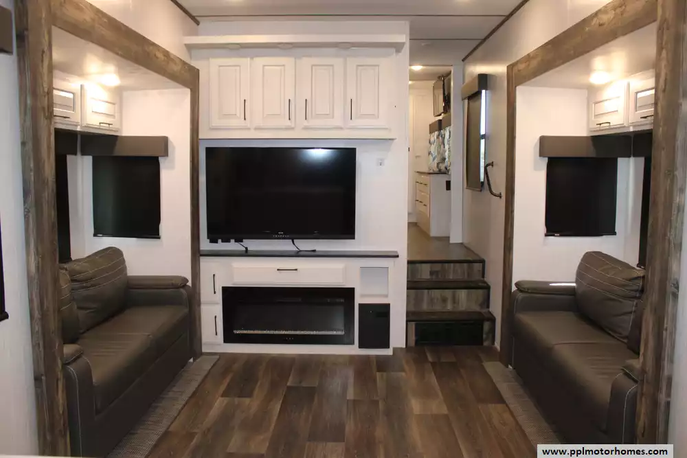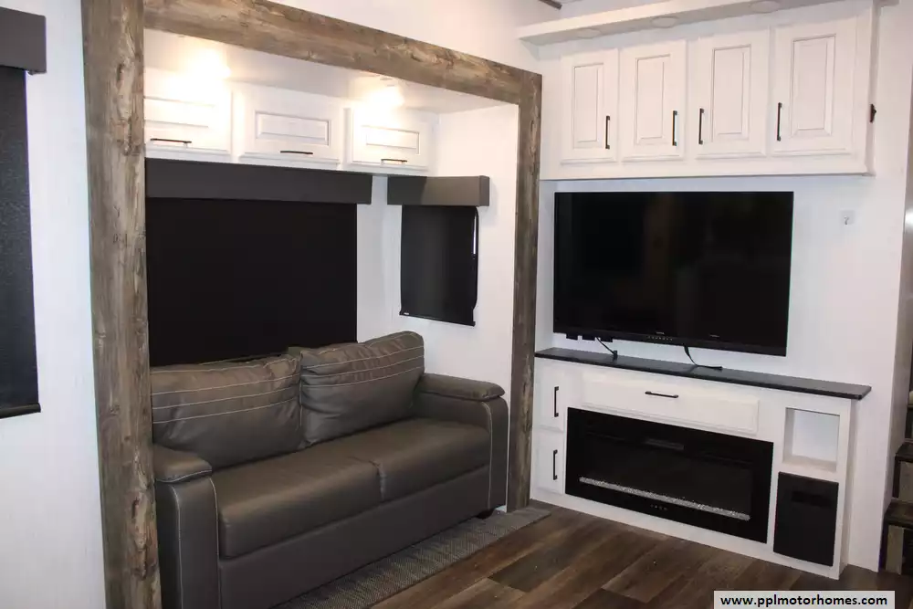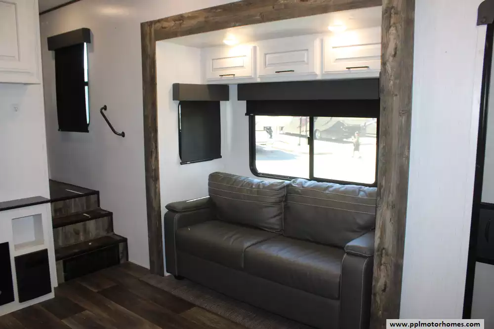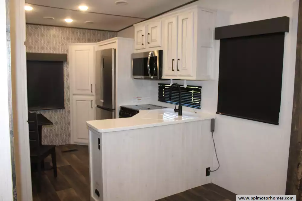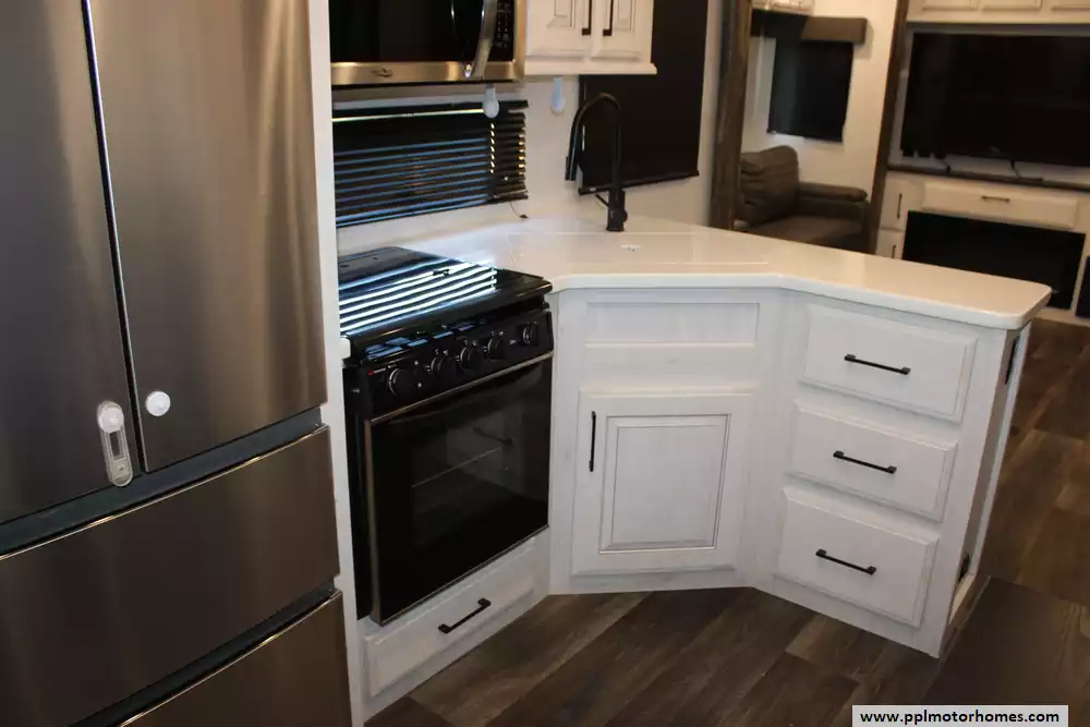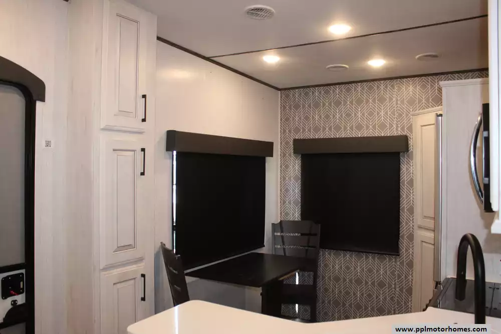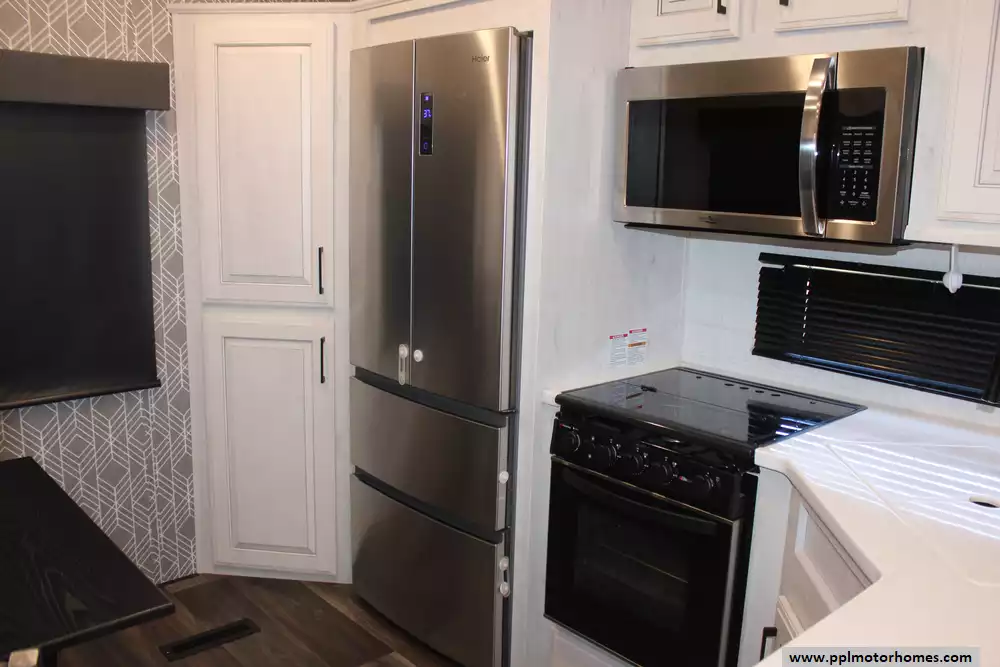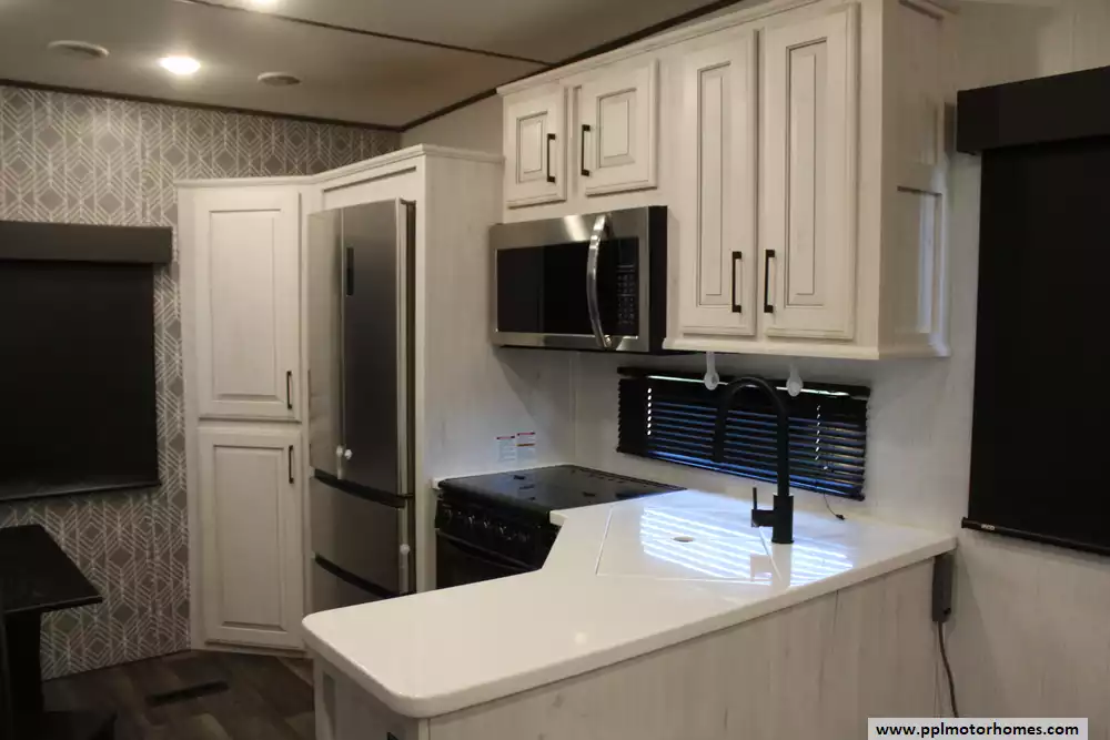 The interior living space is dramatically expanded by three power slide-outs, creating an open and inviting atmosphere throughout the coach. The well-appointed kitchen features a large refrigerator and ample storage, ensuring you have everything you need to prepare meals on the road. From the tall ceilings to the abundance of natural light, every inch of this 33RKS is designed to provide a relaxing retreat. This fifth wheel is an excellent choice for travelers seeking a reliable, high-quality vehicle that delivers both style and functional living space for all their adventures.