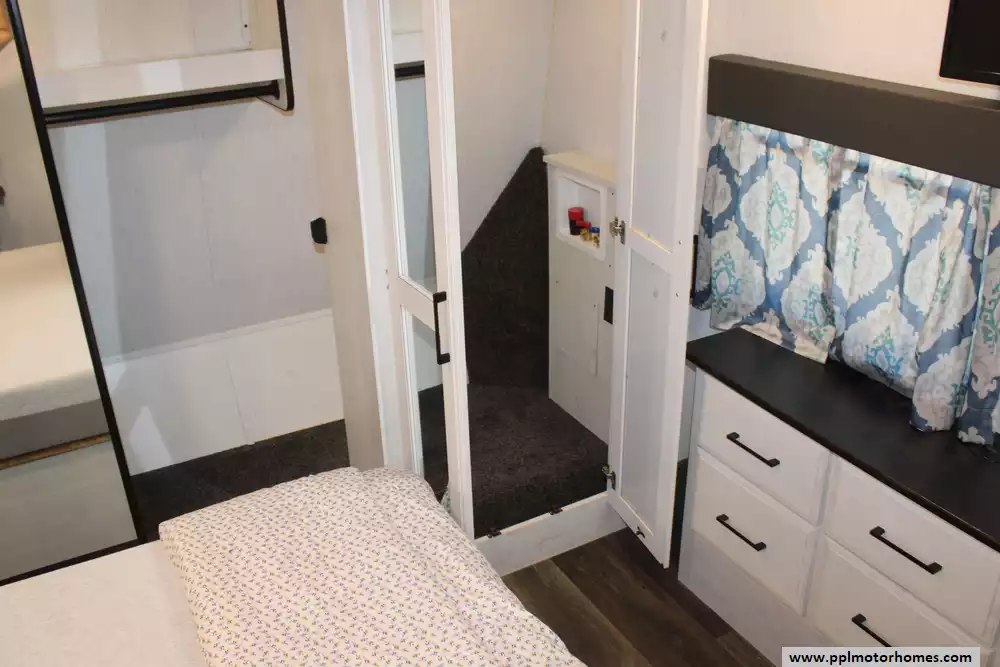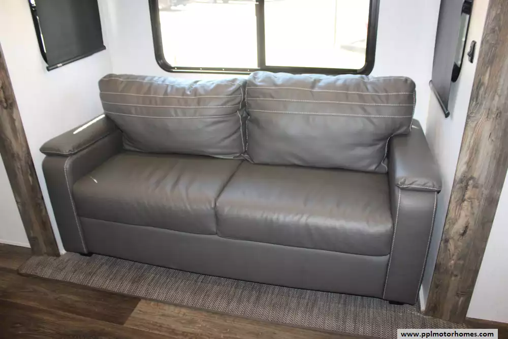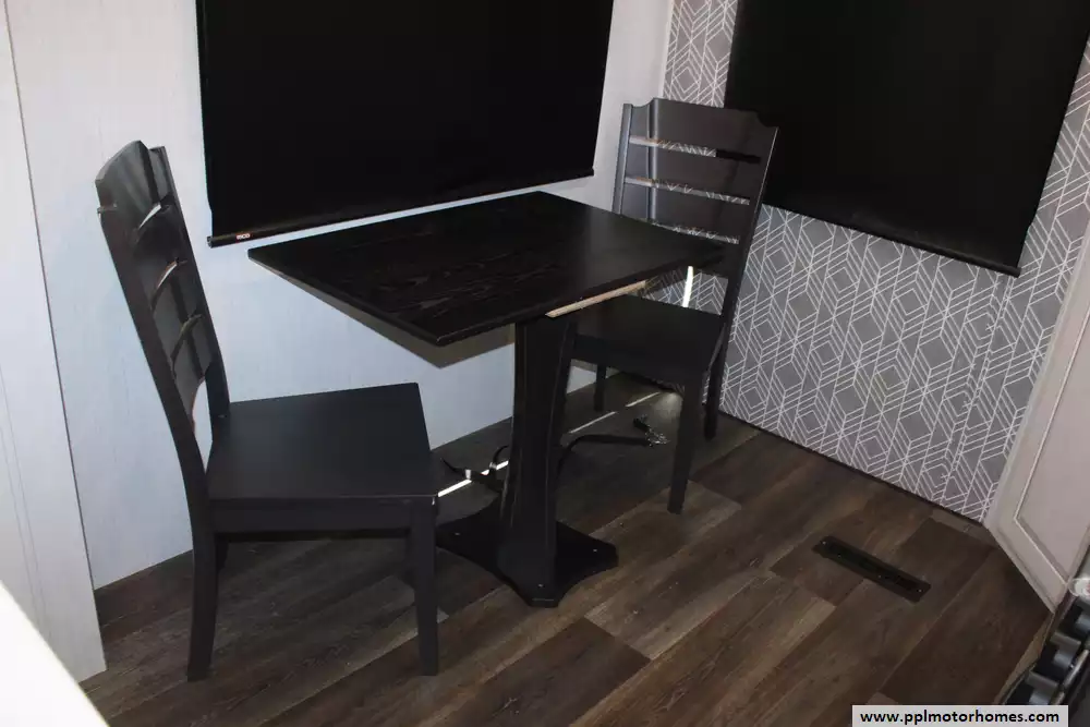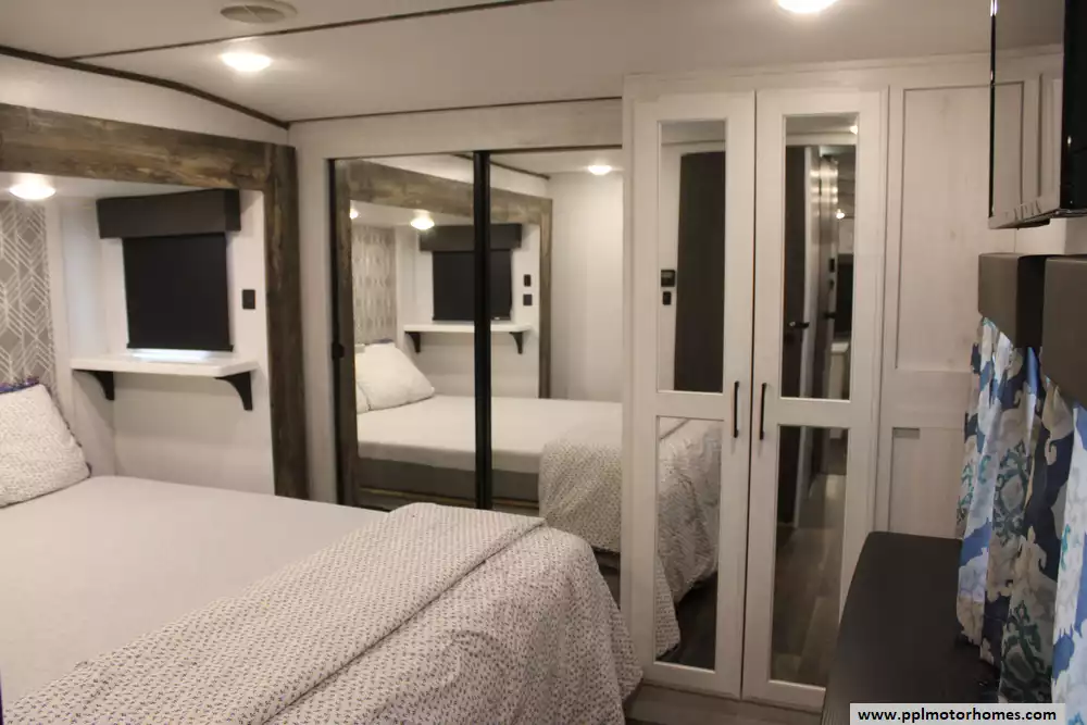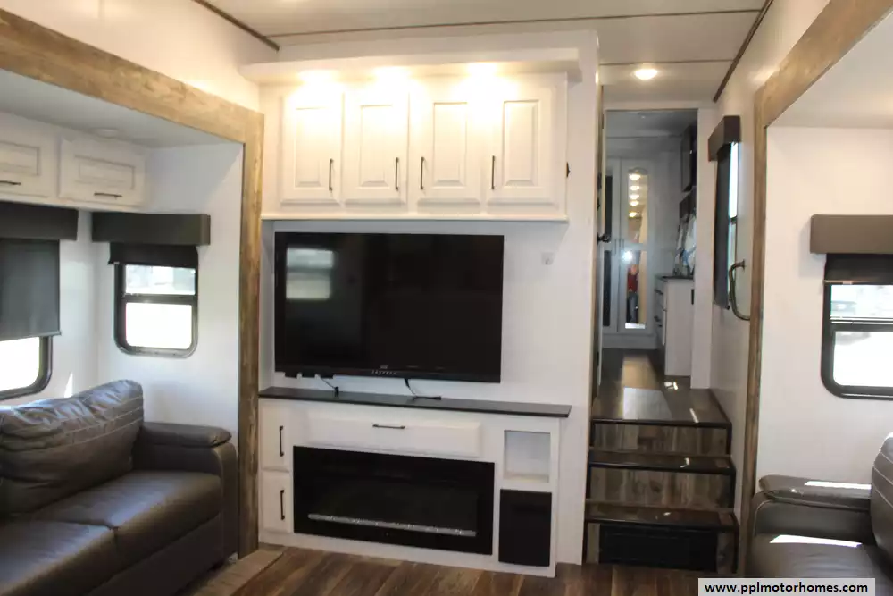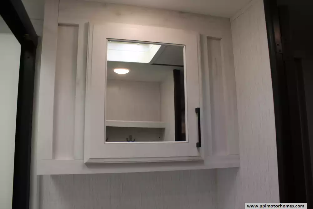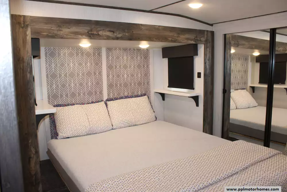 The interior living space is dramatically expanded by three power slide-outs, creating an open and inviting atmosphere throughout the coach. The well-appointed kitchen features a large refrigerator and ample storage, ensuring you have everything you need to prepare meals on the road. From the tall ceilings to the abundance of natural light, every inch of this 33RKS is designed to provide a relaxing retreat. This fifth wheel is an excellent choice for travelers seeking a reliable, high-quality vehicle that delivers both style and functional living space for all their adventures.