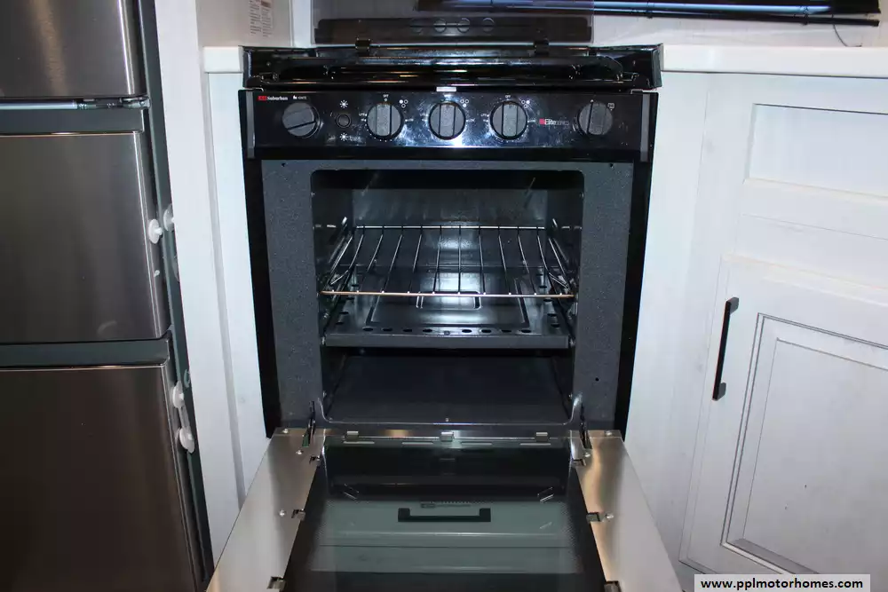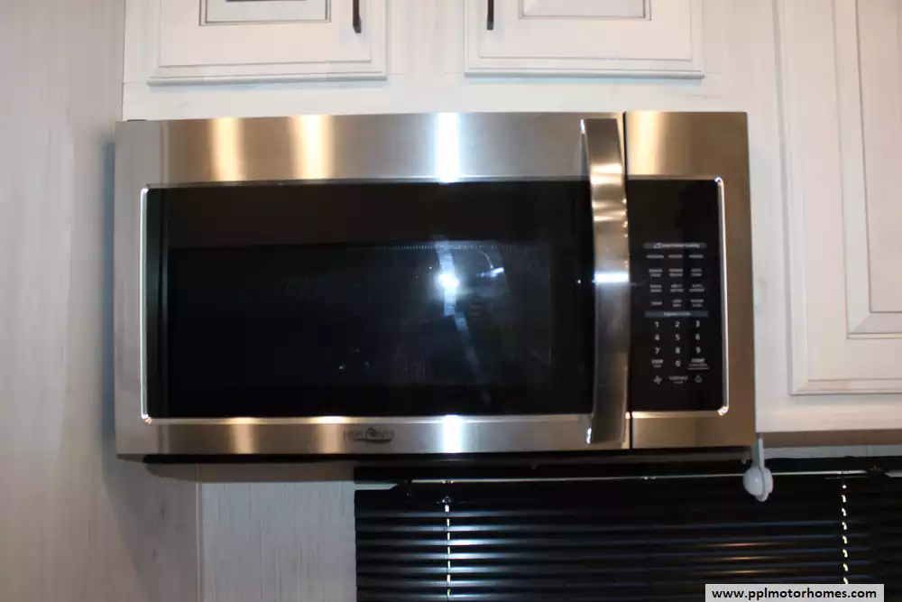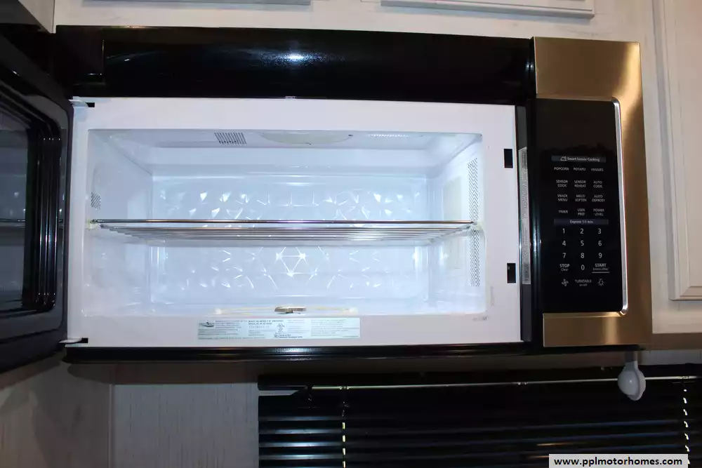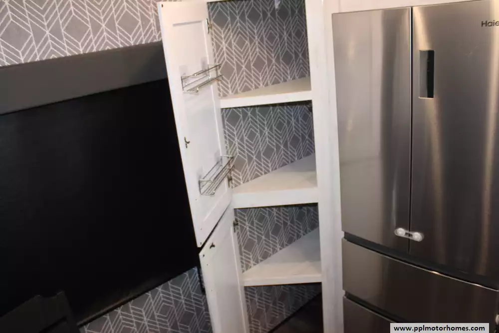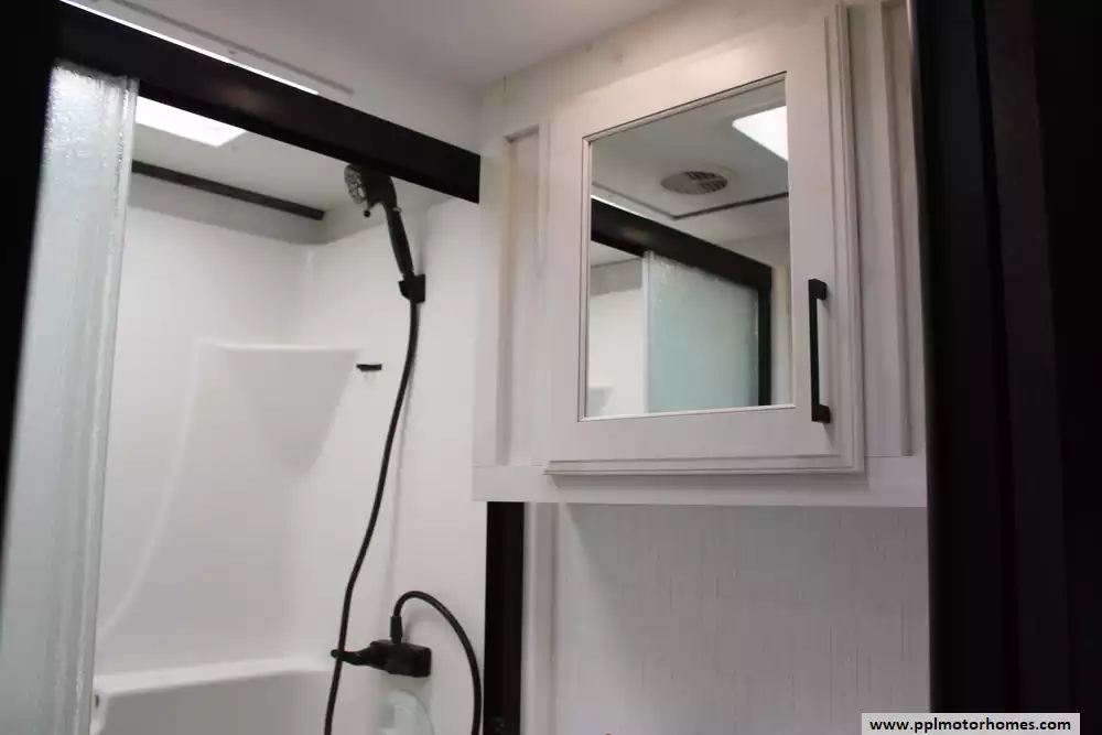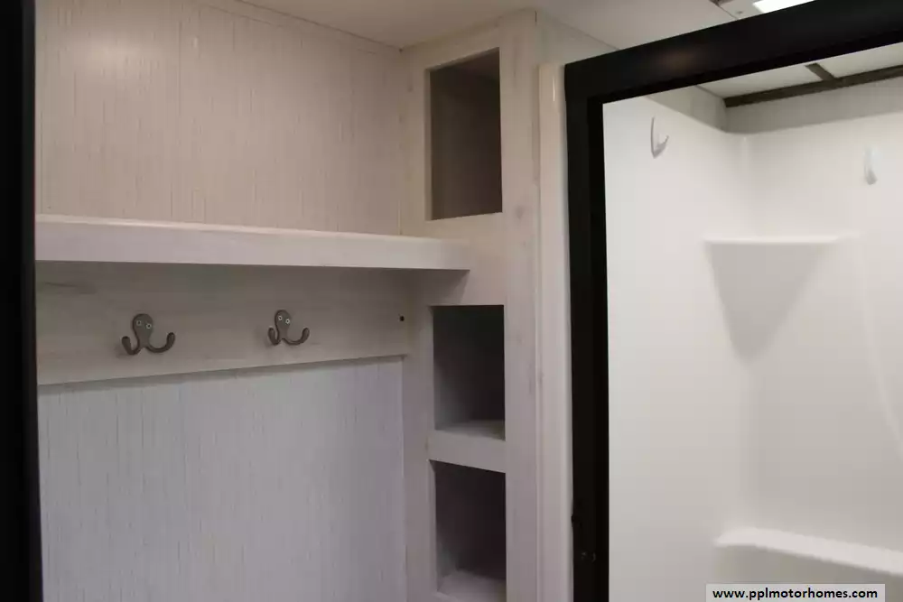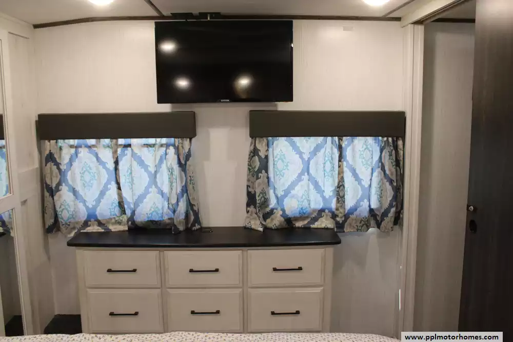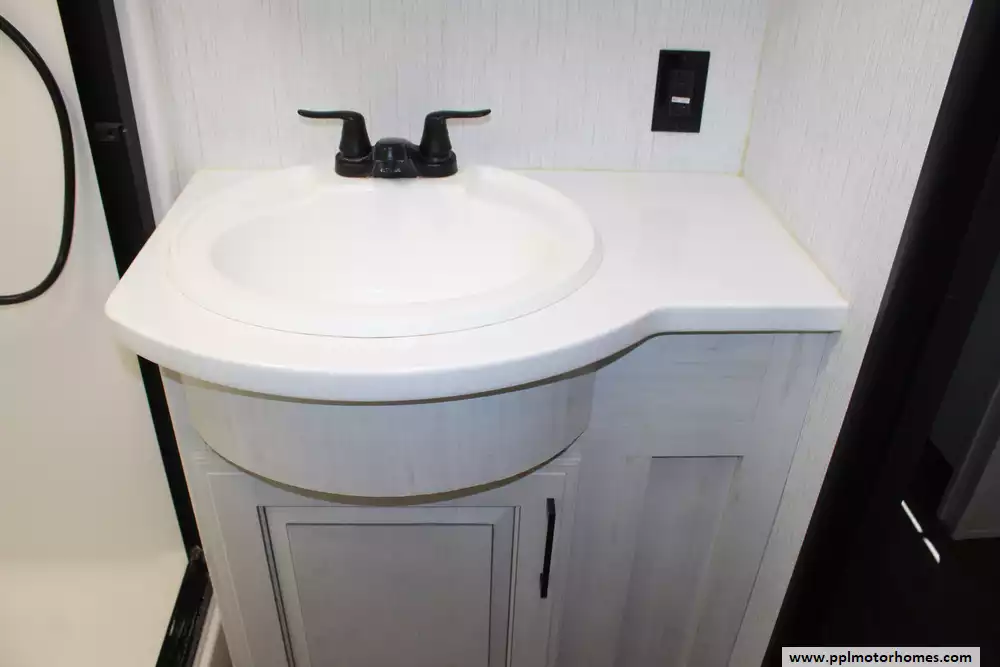 The interior living space is dramatically expanded by three power slide-outs, creating an open and inviting atmosphere throughout the coach. The well-appointed kitchen features a large refrigerator and ample storage, ensuring you have everything you need to prepare meals on the road. From the tall ceilings to the abundance of natural light, every inch of this 33RKS is designed to provide a relaxing retreat. This fifth wheel is an excellent choice for travelers seeking a reliable, high-quality vehicle that delivers both style and functional living space for all their adventures.