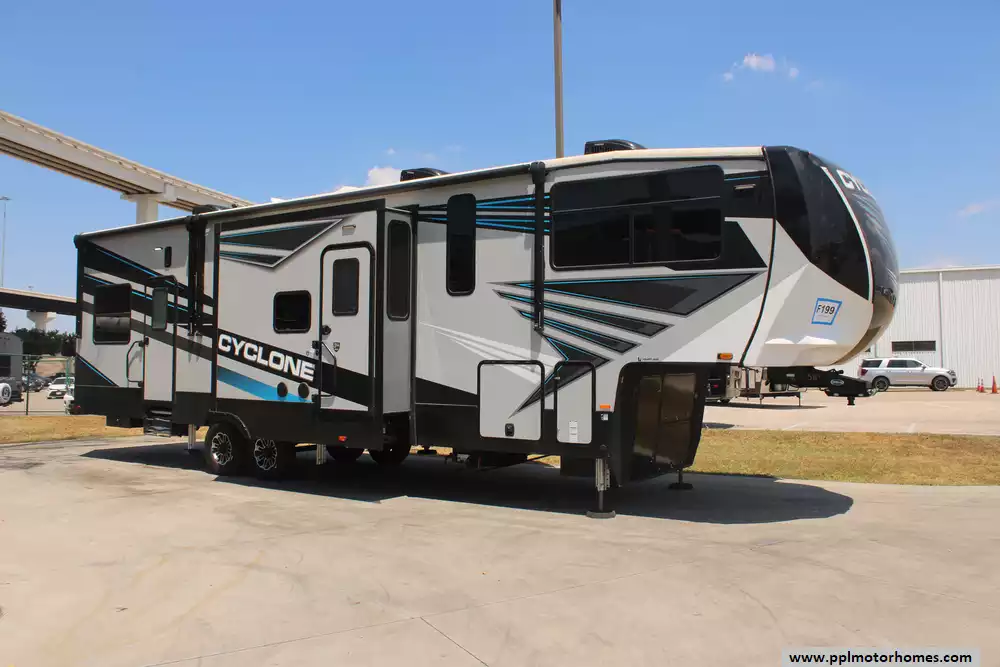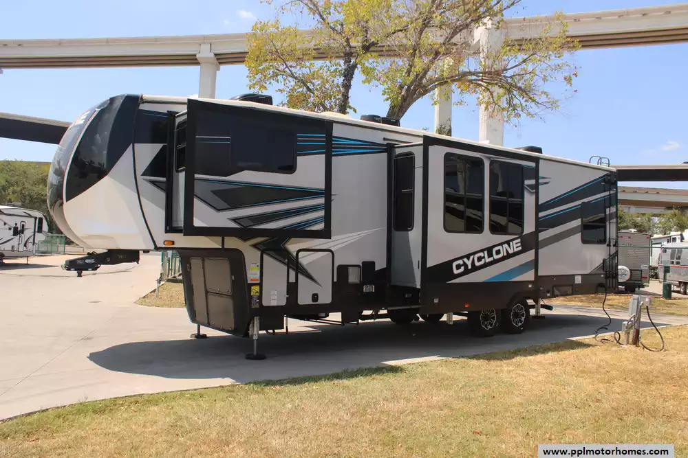 Stop Daydreaming and Start Living In This 2021 Cyclone 3413. Amenities Include... Hydraulic Landing Gear, 3 Slide-outs, Onan Gas Generator, 3 Ducted Air Conditioners, 110V Refrigerator, In-Fridge Ice Maker, Automatic Main Awning, Washer/Dryer Connections, Outside Speakers, TV, Outside Shower, Fireplace, Microwave, 3 Burner Range, and Oven. Ideal for Long Road Trips! Worthy of Being Called a Home!