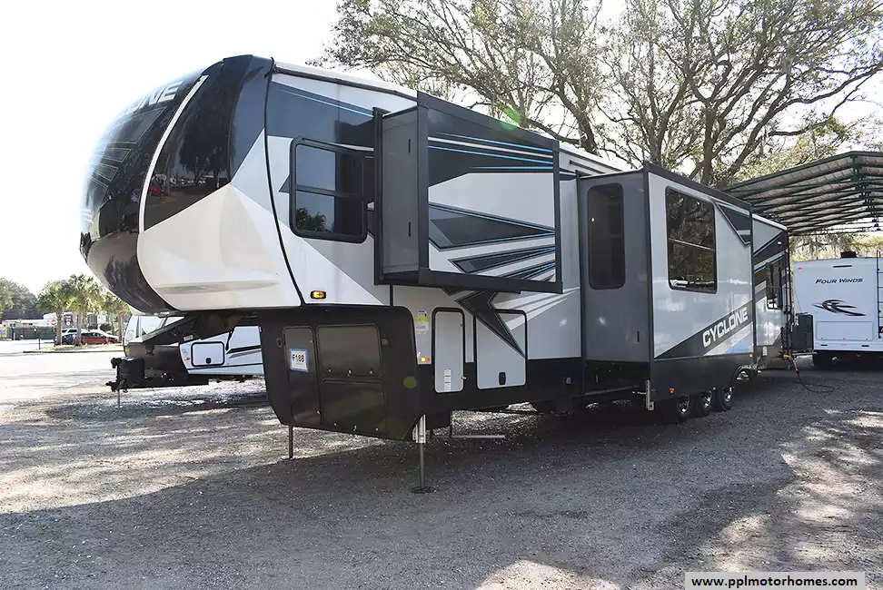 This 2021 Cyclone M4115 has a Hydraulic Landing Gear, 2 Slide-outs, 3 Ducted Air Conditioners, 110v/12v Residential Refrigerator (Additional Refrigerator Present), In-Fridge Ice Maker, Automatic Main Awning, Washer/Dryer Connections, Outside Entertainment System, 3 TVs, DVD Player, Fireplace, Microwave, 3 Burner Range, Oven