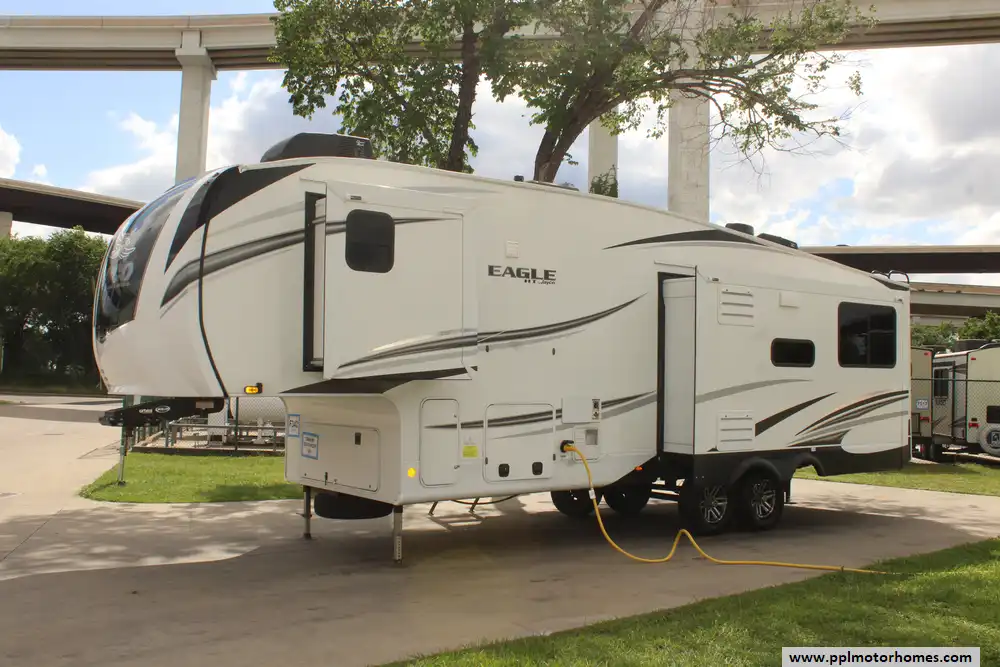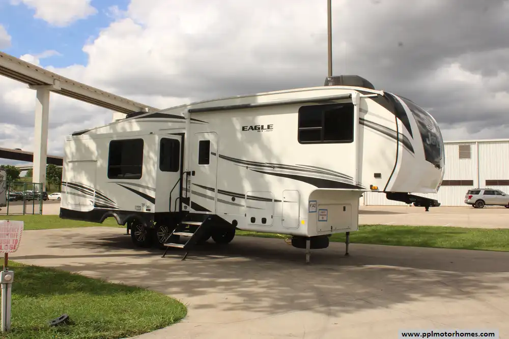 This 2021 Eagle Ht 30.5RSOK is a remarkable fifth wheel trailer designed for those who seek luxury,comfort,and durability in their RV adventures. Features Include...3 Slide-outs, 2 Ducted Air Conditioners, 4 Door Gas/110v Dometic Refrigerator, Automatic Main Awning, Washer/Dryer, Outside Speakers,Back Up Camera, Outdoor Kitchen, Outside Shower, Microwave, 3 Burner Range,and Oven.Whether you're embarking on a weekend getaway or an extended road trip, this RV is sure to exceed your expectations and elevate your camping experience to new heights.