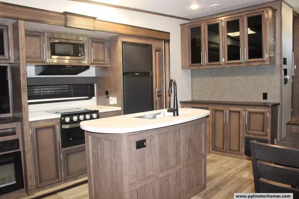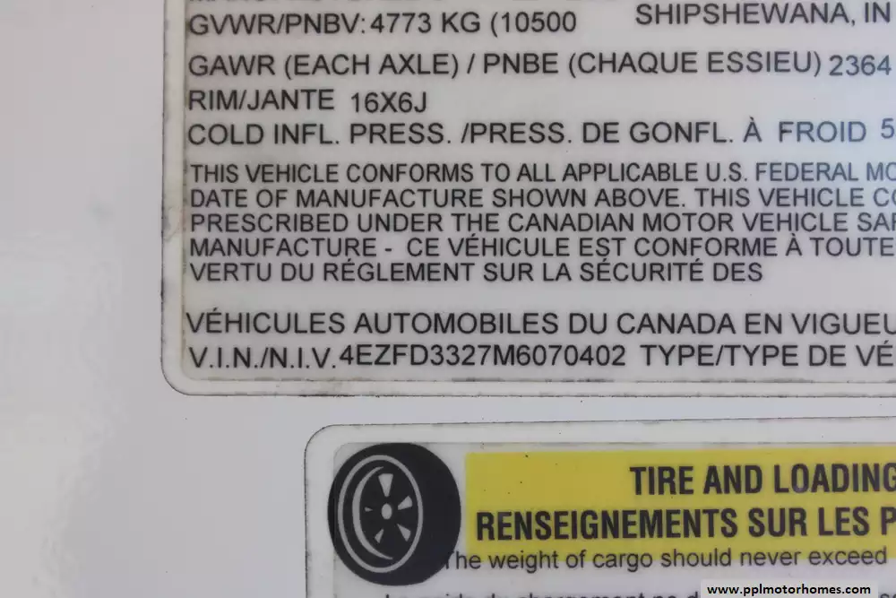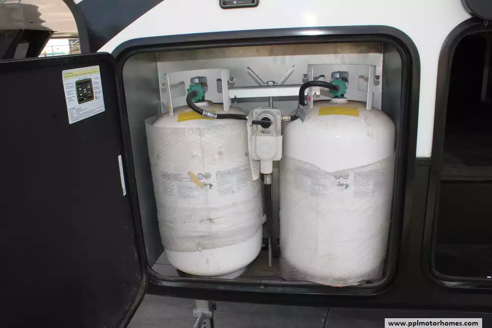 Specs: Length: 32.92 ft., Width: 8 ft., Height: 12.08 ft., Payload Capacity: 1,800 lbs., Total Fresh Water Tank Capacity: 55 gal., Total Gray Water Tank Capacity: 53 gal., Total Black Water Tank Capacity: 53 gal., Number of Propane Tanks: 2, Propane Tank Capacity: 60 lbs.