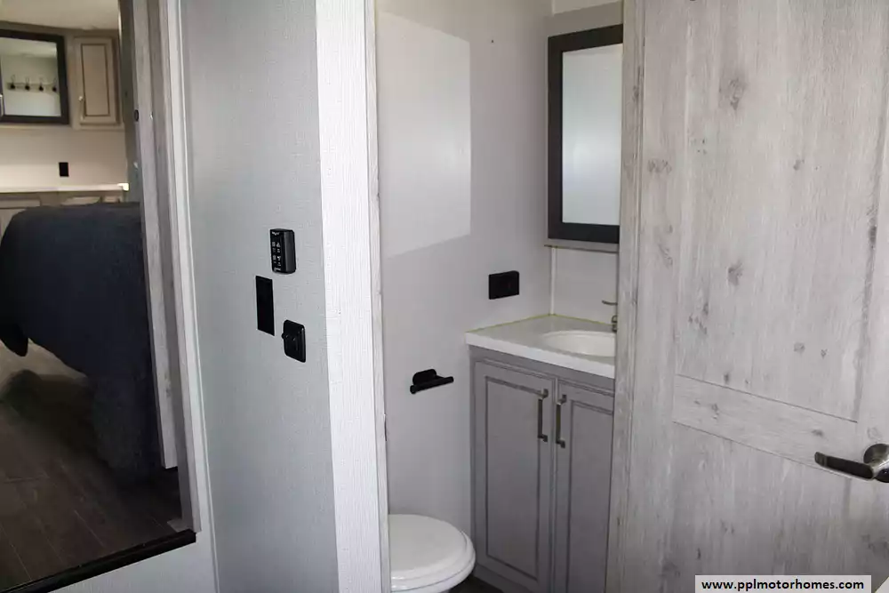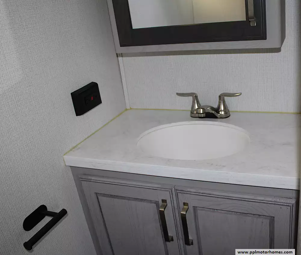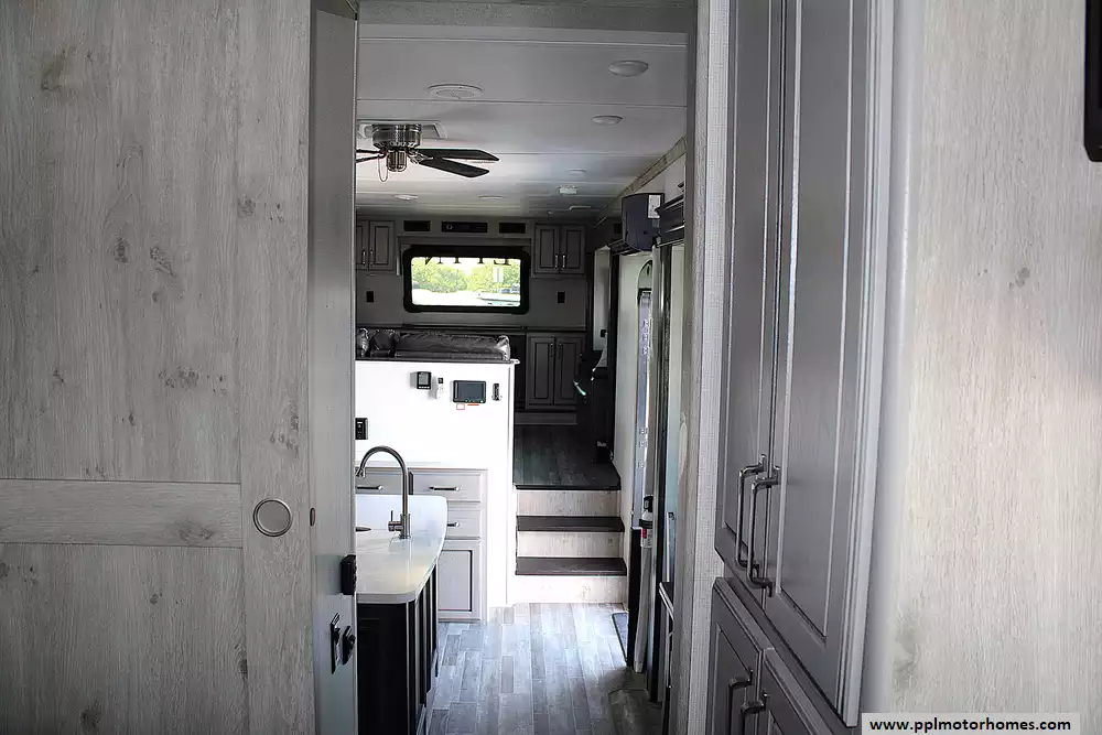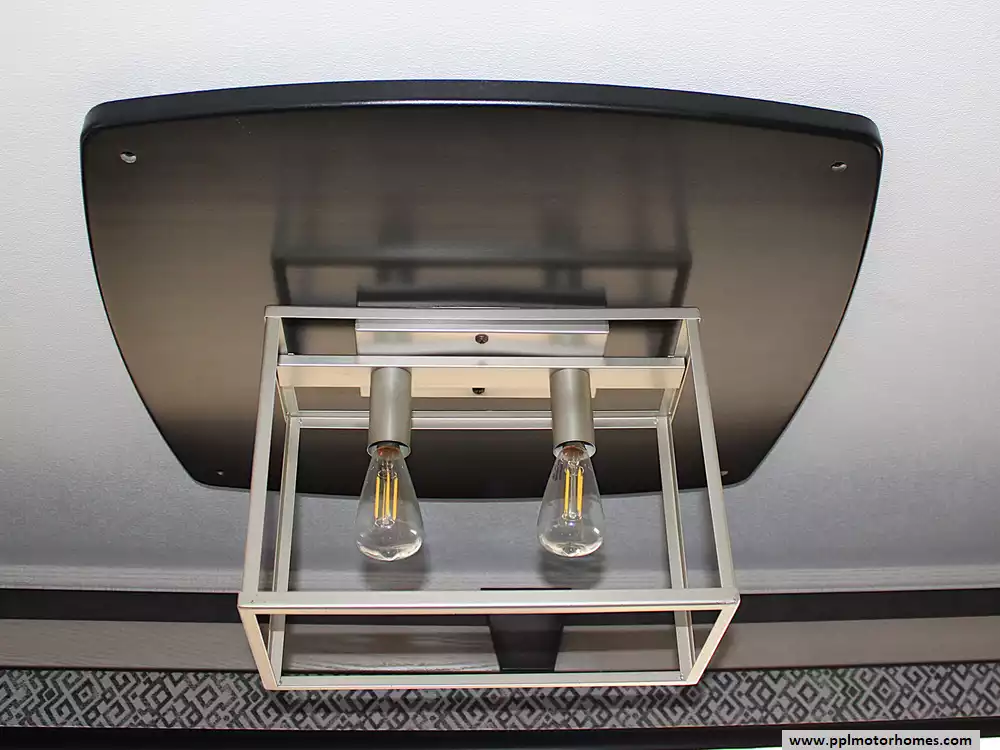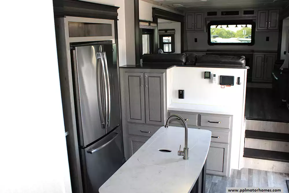 Inside, comfort and practicality blend seamlessly. This model sleeps up to 6 thanks to its king-size master bed and two convertible sofas in the front living room. The central gourmet kitchen showcases solid surface countertops, a residential-style refrigerator, and a large island with deep stainless sink, offering all the elegance of home cooking. A full bathroom with spacious shower in the master suite plus a convenient half bath ensure both you and your guests always have comfort and privacy. With ducted climate control, on-demand hot water, and modern LED lighting throughout, every detail has been designed to elevate your travel lifestyle.