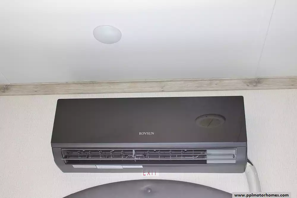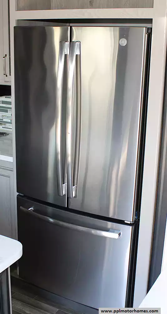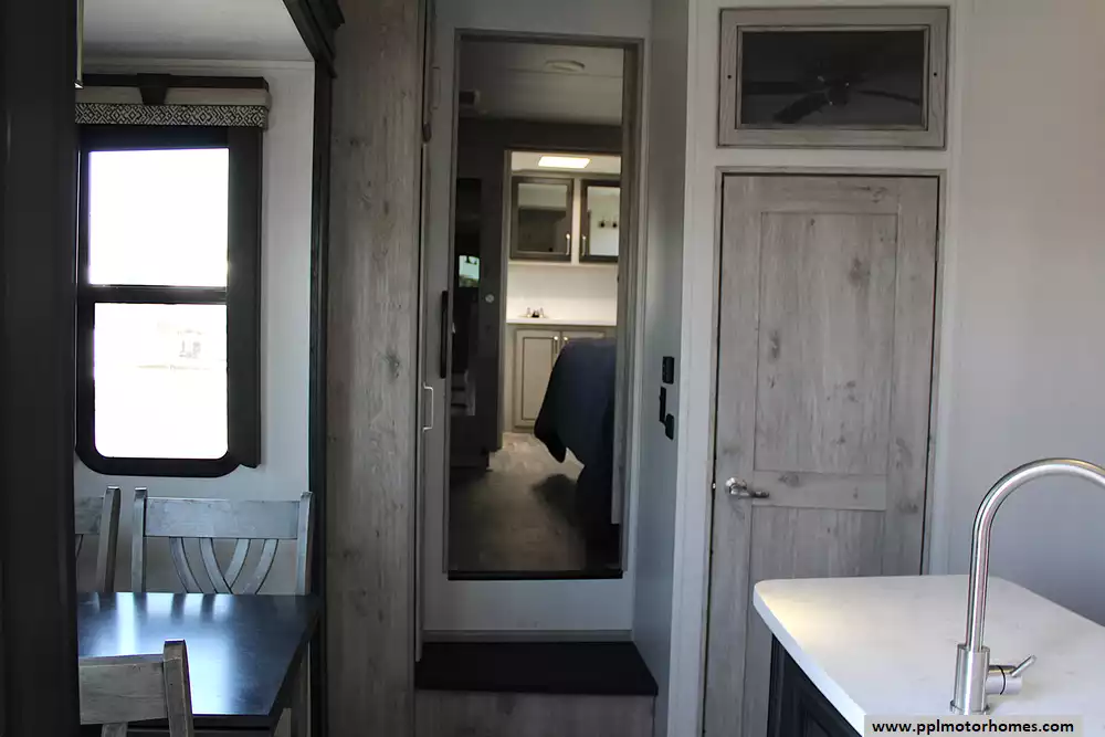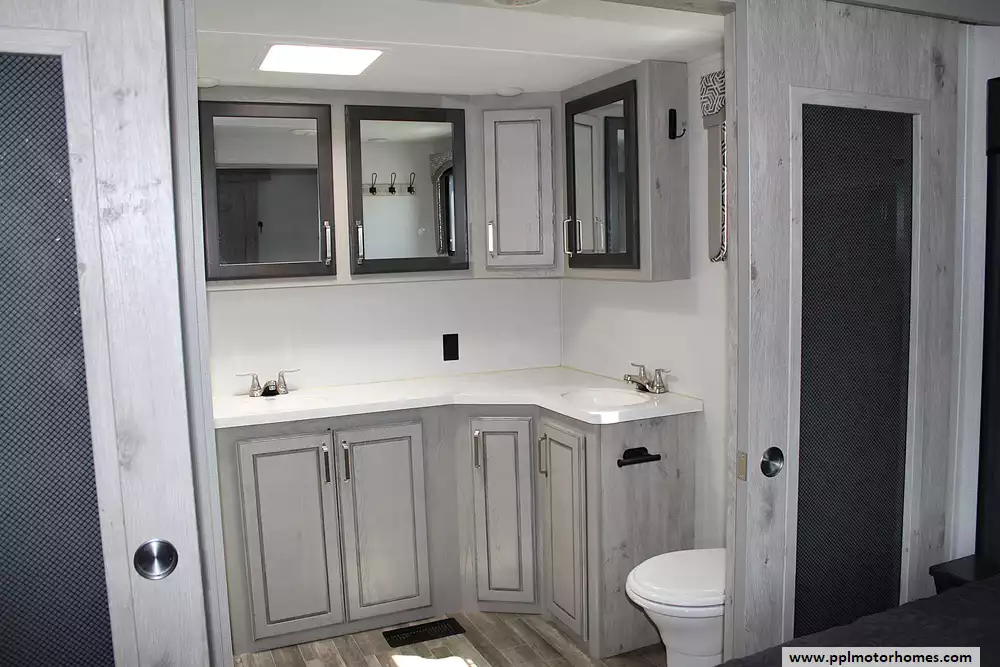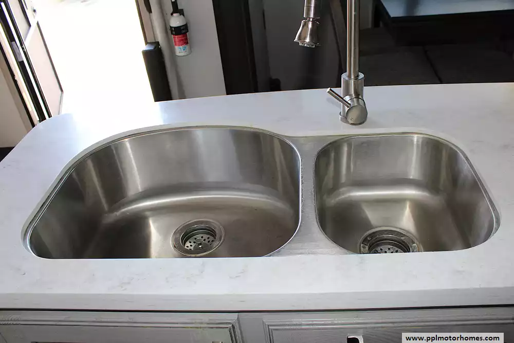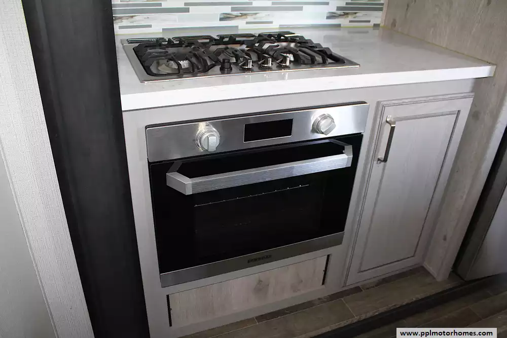 Inside, comfort and practicality blend seamlessly. This model sleeps up to 6 thanks to its king-size master bed and two convertible sofas in the front living room. The central gourmet kitchen showcases solid surface countertops, a residential-style refrigerator, and a large island with deep stainless sink, offering all the elegance of home cooking. A full bathroom with spacious shower in the master suite plus a convenient half bath ensure both you and your guests always have comfort and privacy. With ducted climate control, on-demand hot water, and modern LED lighting throughout, every detail has been designed to elevate your travel lifestyle.