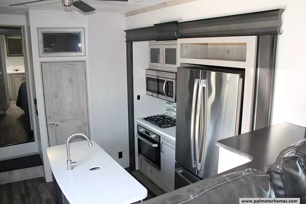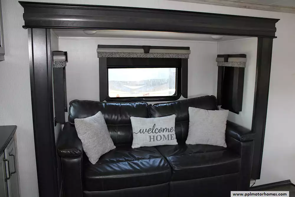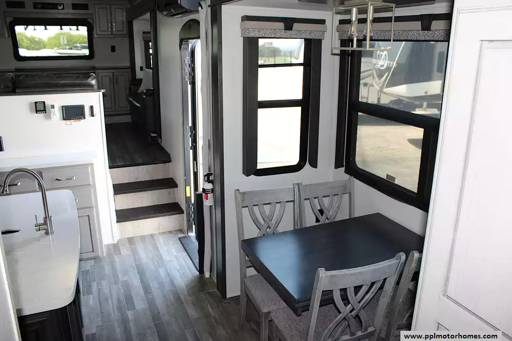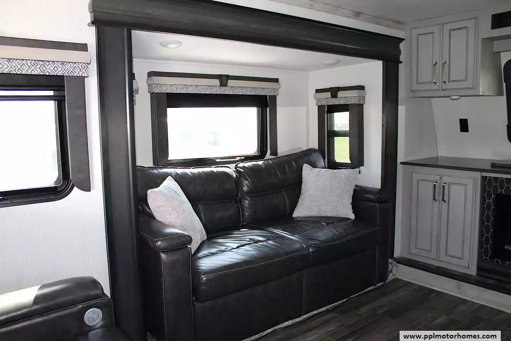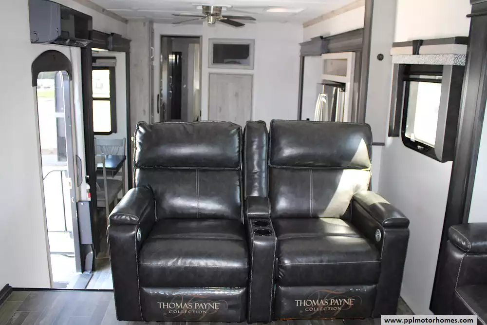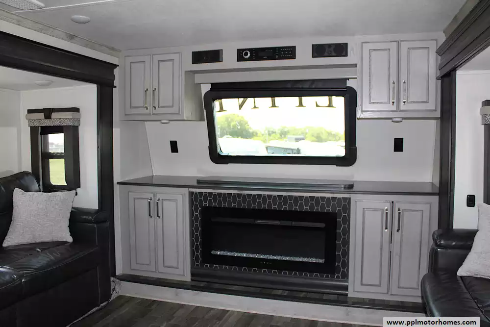 2021 Keystone Alpine 3700FL, a fifth wheel designed to impress at every turn. Stretching over 41 feet in length, this wide-body masterpiece is built for those who want their RV to feel like a high-end residence on wheels. With five expansive slide-outs, it opens into a palatial living space, featuring dual tri-fold sofas, theater seating, a cozy fireplace, and an entertainment center that transforms evenings into cinematic retreats. Whether you're setting up in the mountains, by the lake, or on the open plains, the Alpine 3700FL turns every destination into a luxurious getaway.