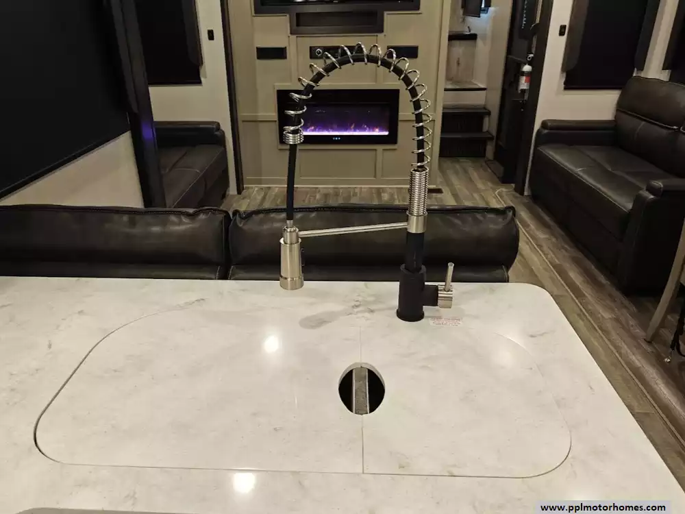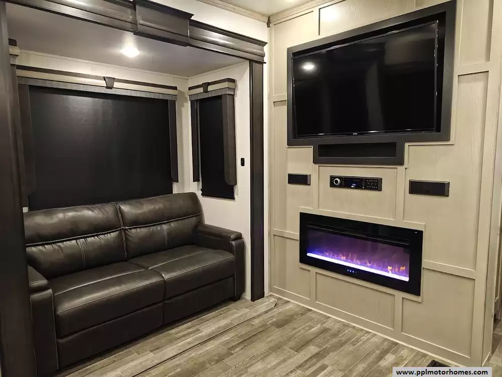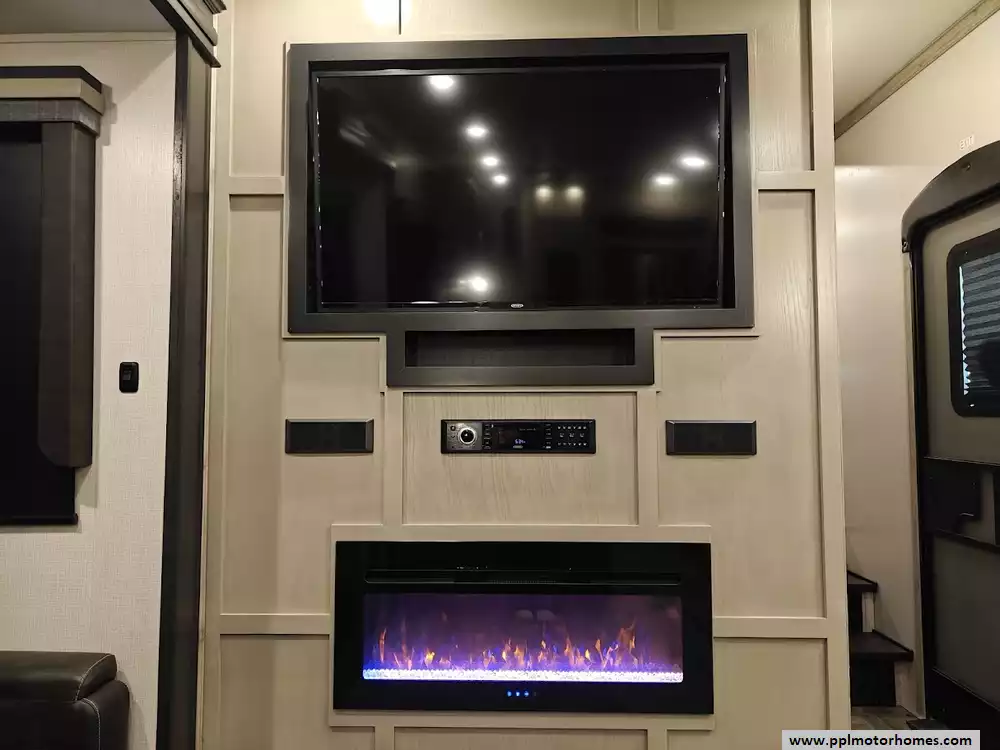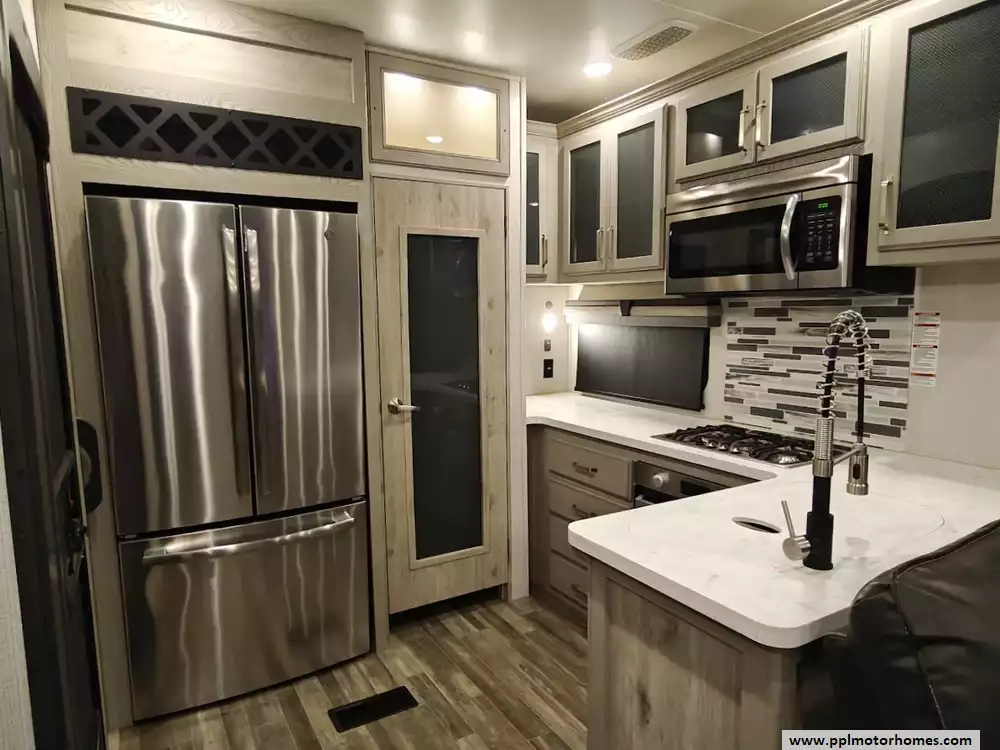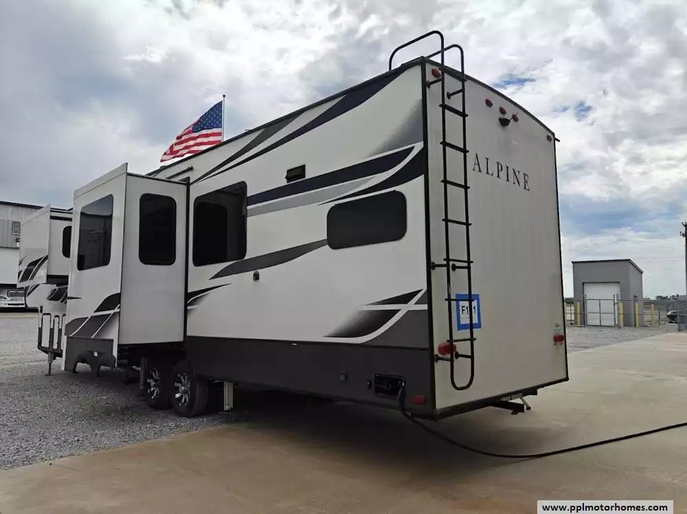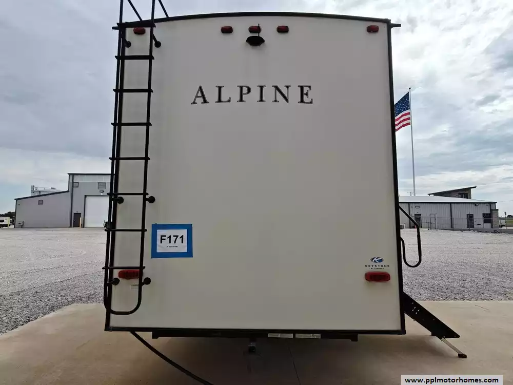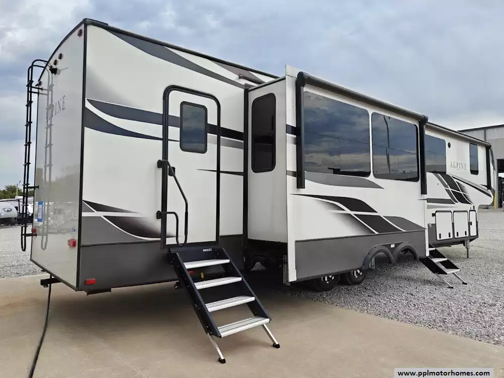 The 2021 Keystone Alpine 3910RK is a family friendly luxury fifth-wheel RV featuring a rear kitchen, bath and a half, large living area with ample seating and modern residential amenities. This 2021 Alpine can sleep up to 6 people, has Hydraulic Landing Gear, 3 Slide-outs, 2 Ducted Air Conditioners, Residential Ge Refrigerator, In-Fridge Ice Maker, Automatic Main Awning, Washer/Dryer Connections, Heated Tanks, Outside Speakers, 3 TVs, DVD Player, Outdoor Grill, Outside Shower, Fireplace, Central Vacuum, Convection Microwave, 3 Burner Range, Oven and is Back Up Camera Ready. Other features include alarge pantry with motion-activated lights and adjustable shelves provides significant storage. A second exterior door is located in the kitchen, offering convenient access for outdoor cooking or entertaining.The full master bathroom is situated at the very front of the RV. It has his-and-her sinks with a separated vanity area, a spacious one-piece fiberglass shower with a seat and skylight, and a porcelain foot-flush toilet. This Alpine has a spacious and comfortable interior ideal for extended trips or full-time living.