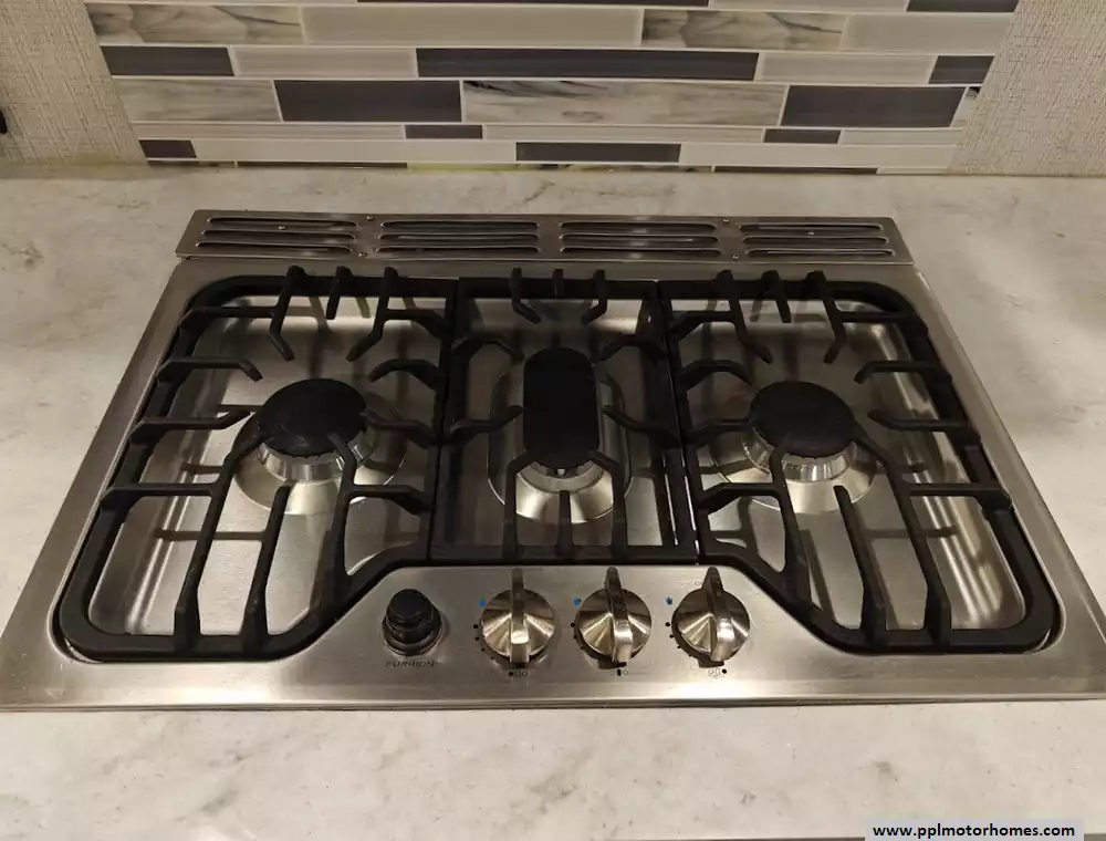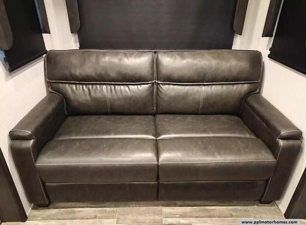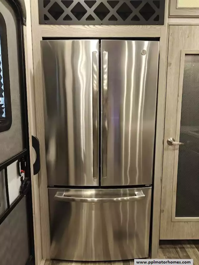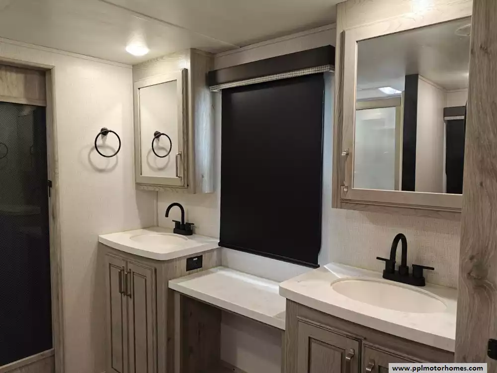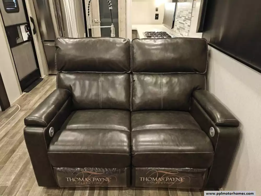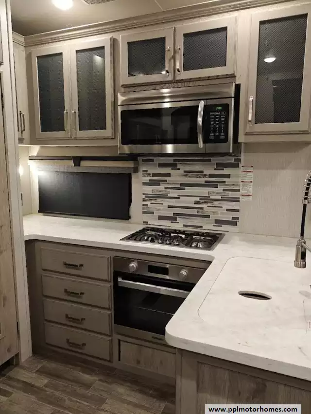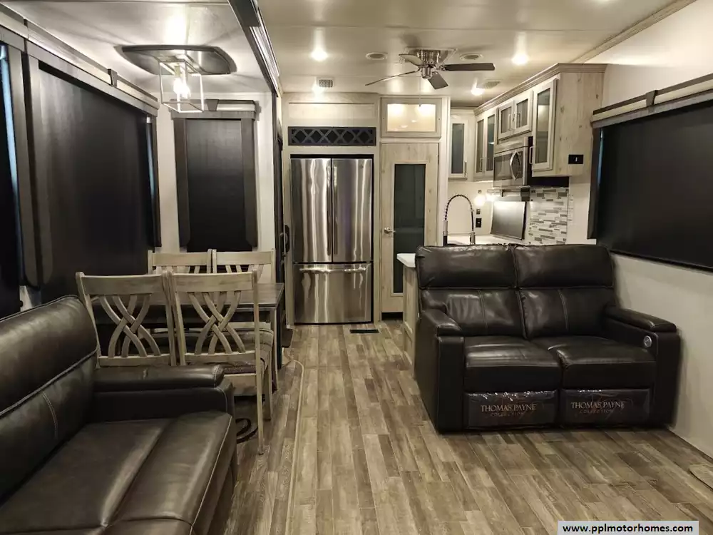 The 2021 Keystone Alpine 3910RK is a family friendly luxury fifth-wheel RV featuring a rear kitchen, bath and a half, large living area with ample seating and modern residential amenities. This 2021 Alpine can sleep up to 6 people, has Hydraulic Landing Gear, 3 Slide-outs, 2 Ducted Air Conditioners, Residential Ge Refrigerator, In-Fridge Ice Maker, Automatic Main Awning, Washer/Dryer Connections, Heated Tanks, Outside Speakers, 3 TVs, DVD Player, Outdoor Grill, Outside Shower, Fireplace, Central Vacuum, Convection Microwave, 3 Burner Range, Oven and is Back Up Camera Ready. Other features include alarge pantry with motion-activated lights and adjustable shelves provides significant storage. A second exterior door is located in the kitchen, offering convenient access for outdoor cooking or entertaining.The full master bathroom is situated at the very front of the RV. It has his-and-her sinks with a separated vanity area, a spacious one-piece fiberglass shower with a seat and skylight, and a porcelain foot-flush toilet. This Alpine has a spacious and comfortable interior ideal for extended trips or full-time living.