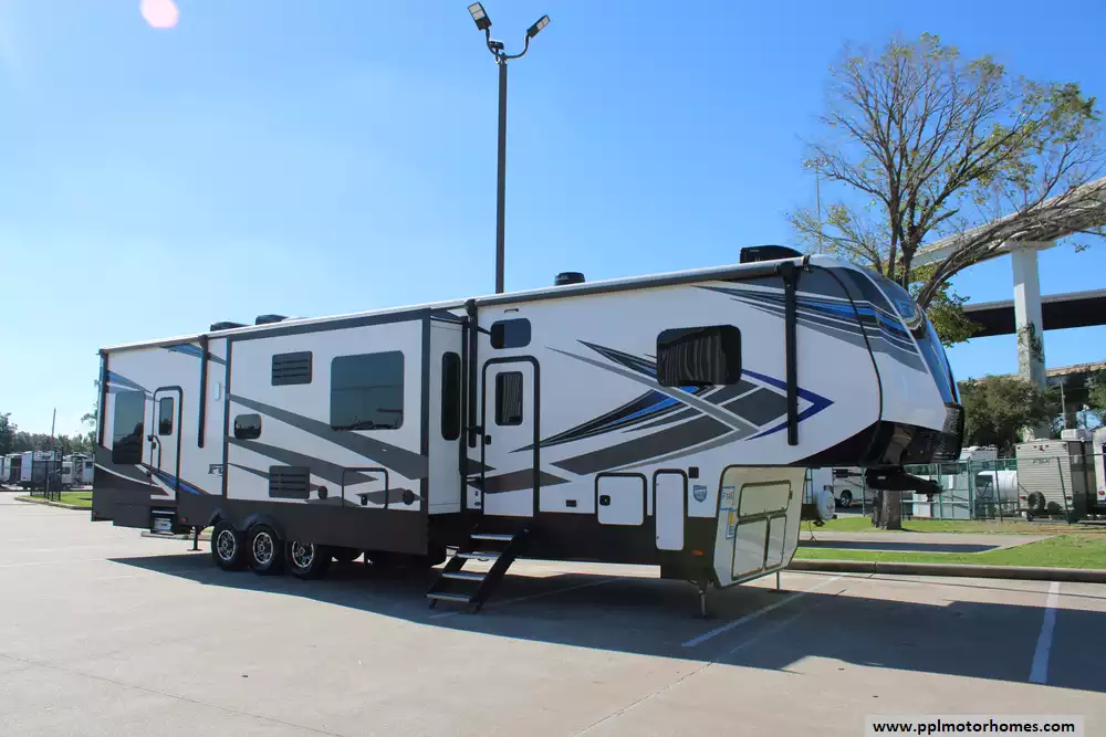 Specs: Length: 43.25 ft., Width: 8.5 ft., Height: 13.42 ft.,Payload Capacity: 3,525 lbs., Total Fresh Water Tank Capacity: 106 gal.,Total Gray Water: 88 gal., Total Black Water Tank Capacity: 88 gal., Total Number of Propane Tanks: 2, Total Propane Tank Capacity: 60 lbs.