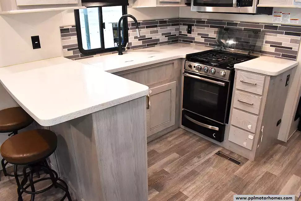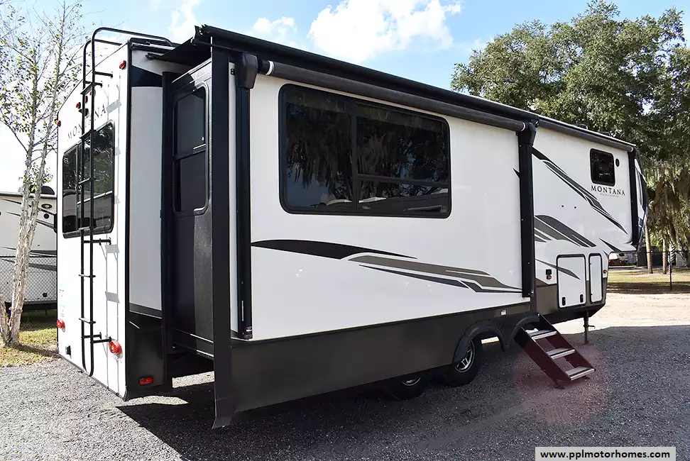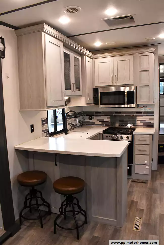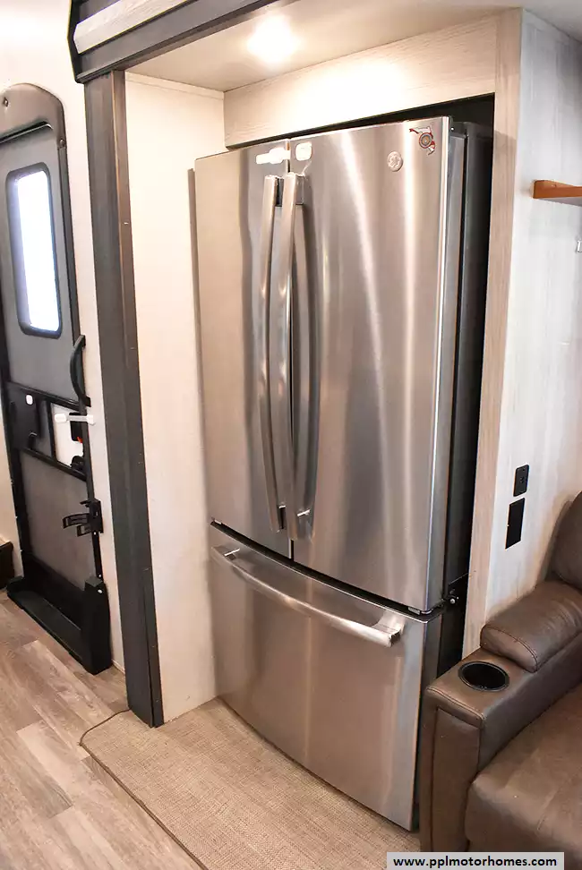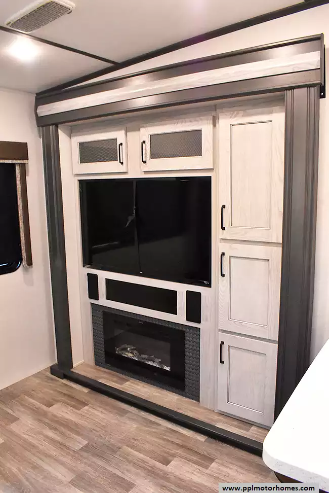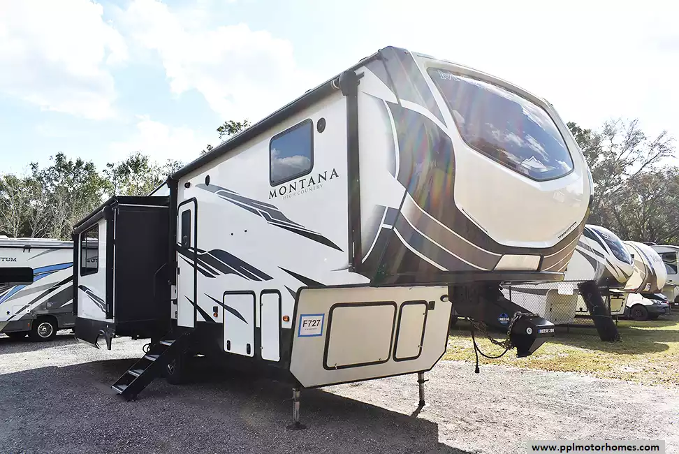 This 2021 High Country 281CK has an Electric Landing Gear, 3 Slide-outs, 2 Ducted Air Conditioners, Residential Ge Refrigerator, In-Fridge Ice Maker, Automatic Main Awning And Window/Slide Awnings, Washer/Dryer, Heated Tanks, Outside Speakers, 2 TVs, Fireplace, Central Vacuum, Microwave, 3 Burner Range, Oven