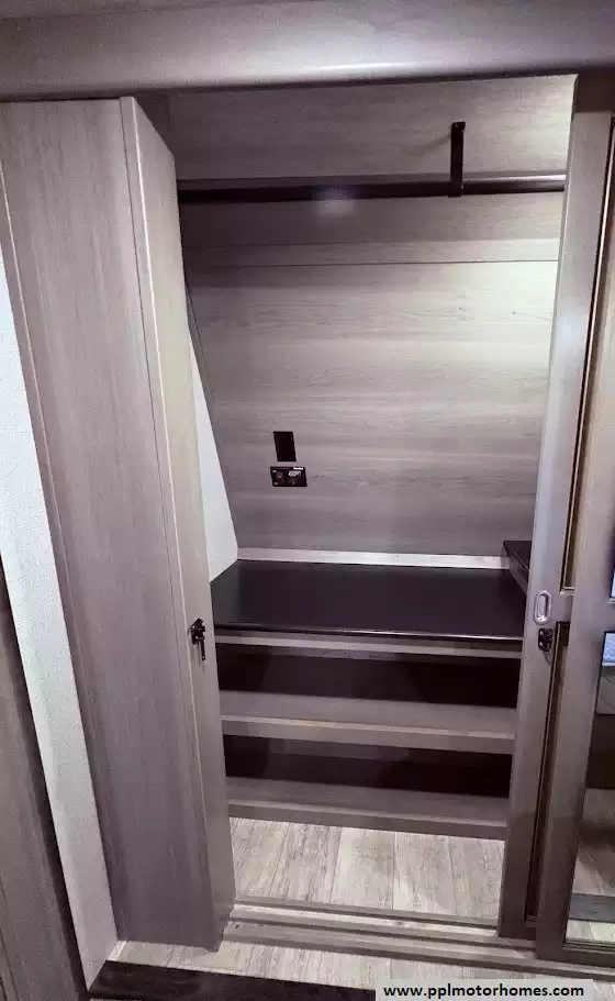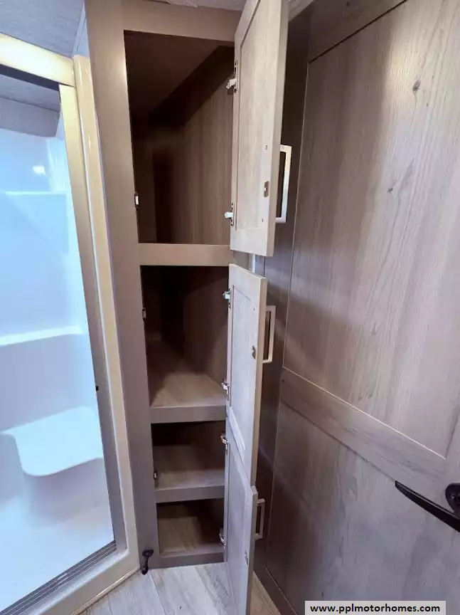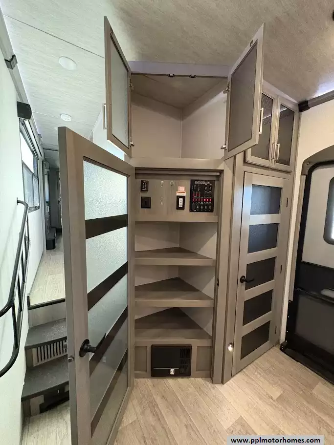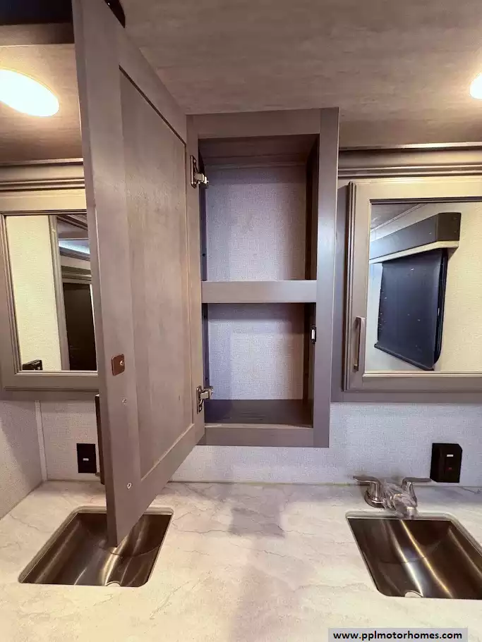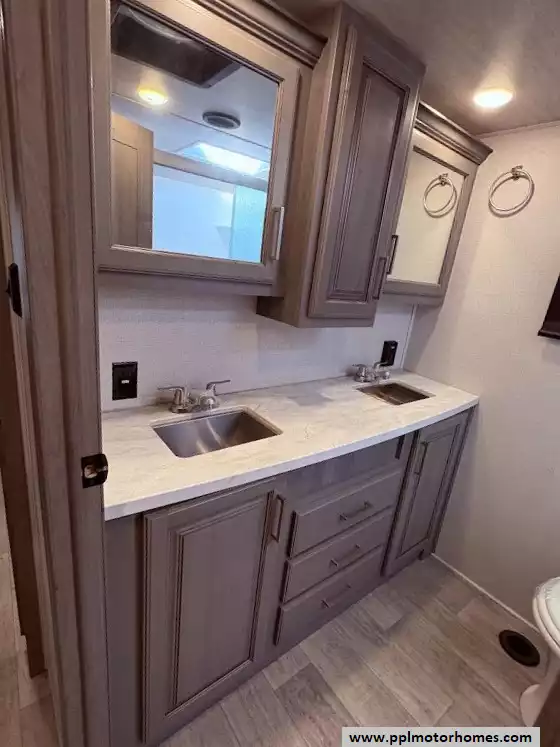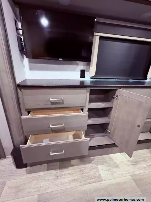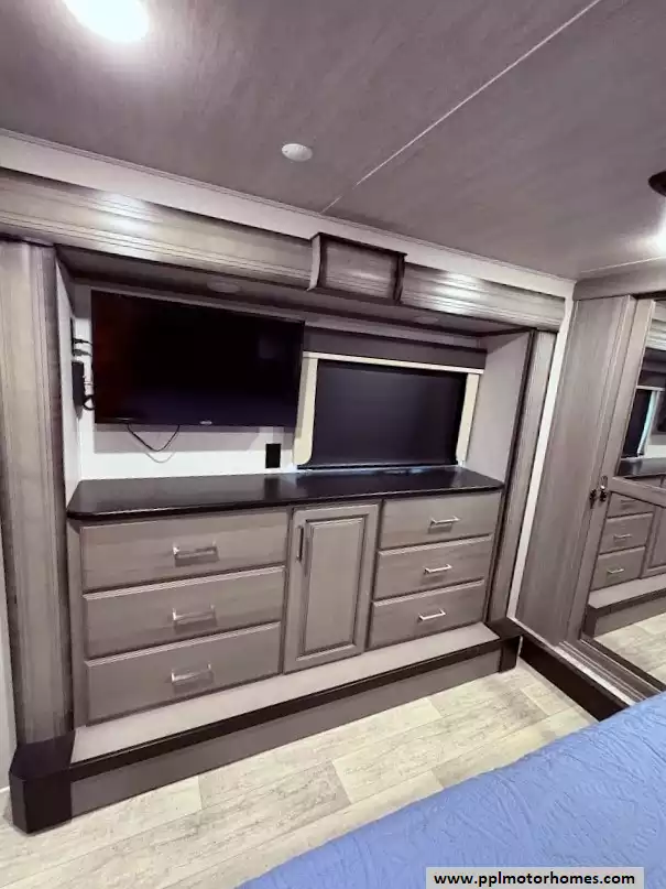 The master bedroom is located in the front of the fifth wheel. It features a king bed in a third slide-out. The front wall is occupied by a full-width wardrobe with ample storage, a dresser,and a TV is mounted in the bedroom. The bathroom offers a dual-sink vanity, a medicine cabinet, a toilet, and a spacious fiberglass shower with a seat.